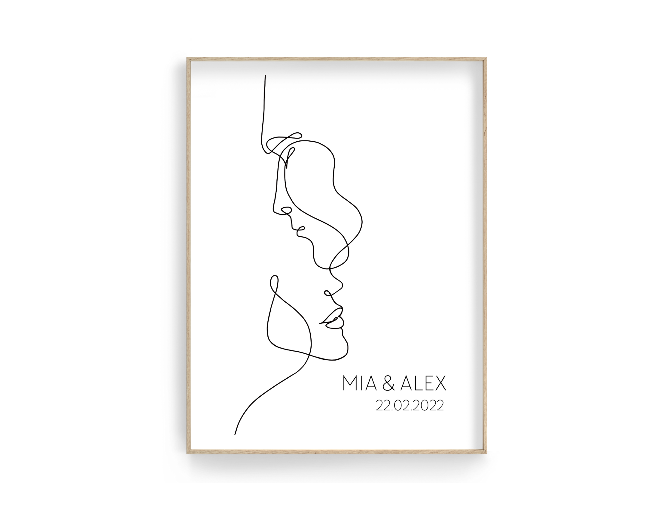 Er und sie in inniger Zuneigung gezeichnet in einer Linie - daneben die Namen und das Datum - das ist Minimalismus pur und eine schöne Geschenkidee zur Hochzeit.