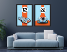 Hochwertiger Kunstdruck in hellblau und orange, der die grafischen Elemente eines Gulf Porsches aufgreift.
