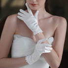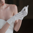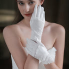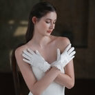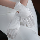 Satinweiße Brauthandschuhe mit Spitzenblumen