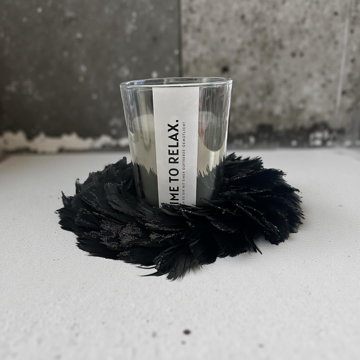 Edler Kranz aus schwarzen Federn mit Glitzer - eine perfekte Deko für den Tisch - ob zu Halloween oder Weihnachten! Er hat einen Durchmesser von ca. 20 cm (plus etwas mehr durch die Federn), und lässt sich vielseitig dekorieren: nutze ihn zum Beispiel als Kerzenkranz. Der innere Durchmesser passt für Stumpenkerzen oder Kerzen im Glas.