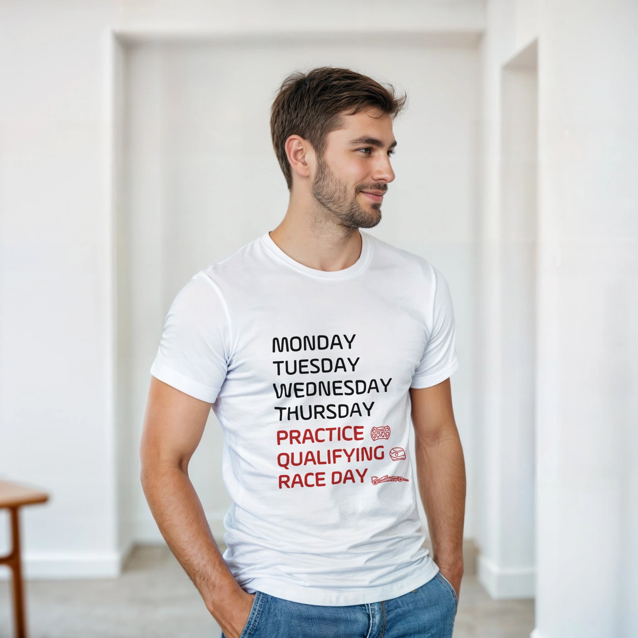 Erlebe den ultimativen Komfort und Stil mit unserem Männer T-Shirt 'Race Day' – das perfekte Shirt für alle Formel Eins-Fans! Gefertigt aus schwerer, hochwertiger Baumwolle, bietet dieses T-Shirt nicht nur eine klassische Passform, sondern auch Langlebigkeit für den täglichen Gebrauch und entspannte Freizeitaktivitäten. Egal, ob du zur Rennstrecke fährst oder einfach nur deinen Fan-Stil zeigen möchtest, dieses T-Shirt ist der ideale Begleiter. **Produktmerkmale:** - **Material:** 100 % Baumwolle für ein angenehm weiches Tragegefühl - **Passform:** Klassischer Schnitt, der perfekt sitzt und für alle Körperformen geeignet ist - **Haltbarkeit:** Nahtloser, doppelt genähter Kragen sowie Ärmel- und untere Säume mit Doppelnaht für zusätzliche Stabilität - **Verfügbare Farben:** Erhältlich in elegantem Weiß oder edlem Grau – wähle deinen Favoriten! Ob als Geschenk für den Motorsportliebhaber in deinem Leben oder als stylisches Teil für deinen eigenen Kleiderschrank, unser 'Race Day' T-Shirt ist ein Muss für jeden Fan. Sei bereit für den nächsten großen Tag und mach dich bereit, die Startlinie zu überschreiten! **Bestelle jetzt dein 'Race Day' T-Shirt und zeige deine Liebe zum Motorsport!**
