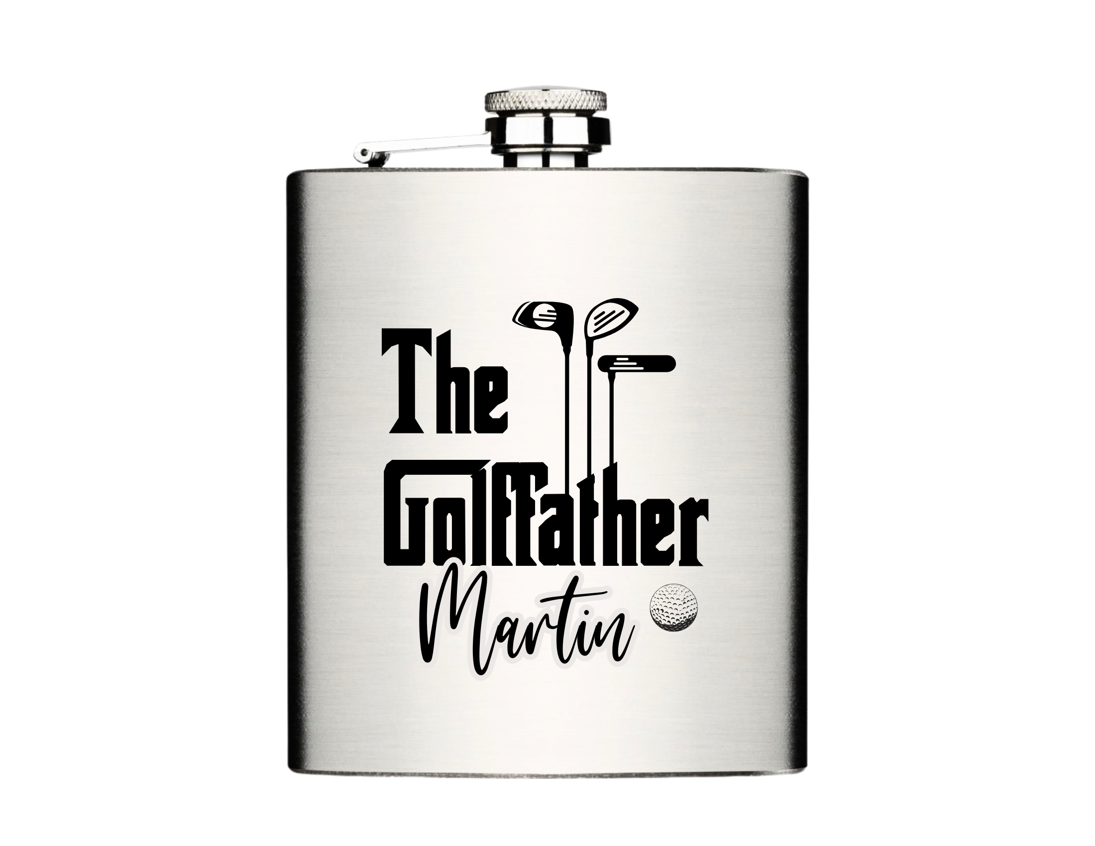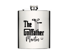 Personalisierbarer Silberner Edelstahl Flachmann mit Golfmotiv "The Golffather" – Ein perfektes Geschenk für jeden Golfer