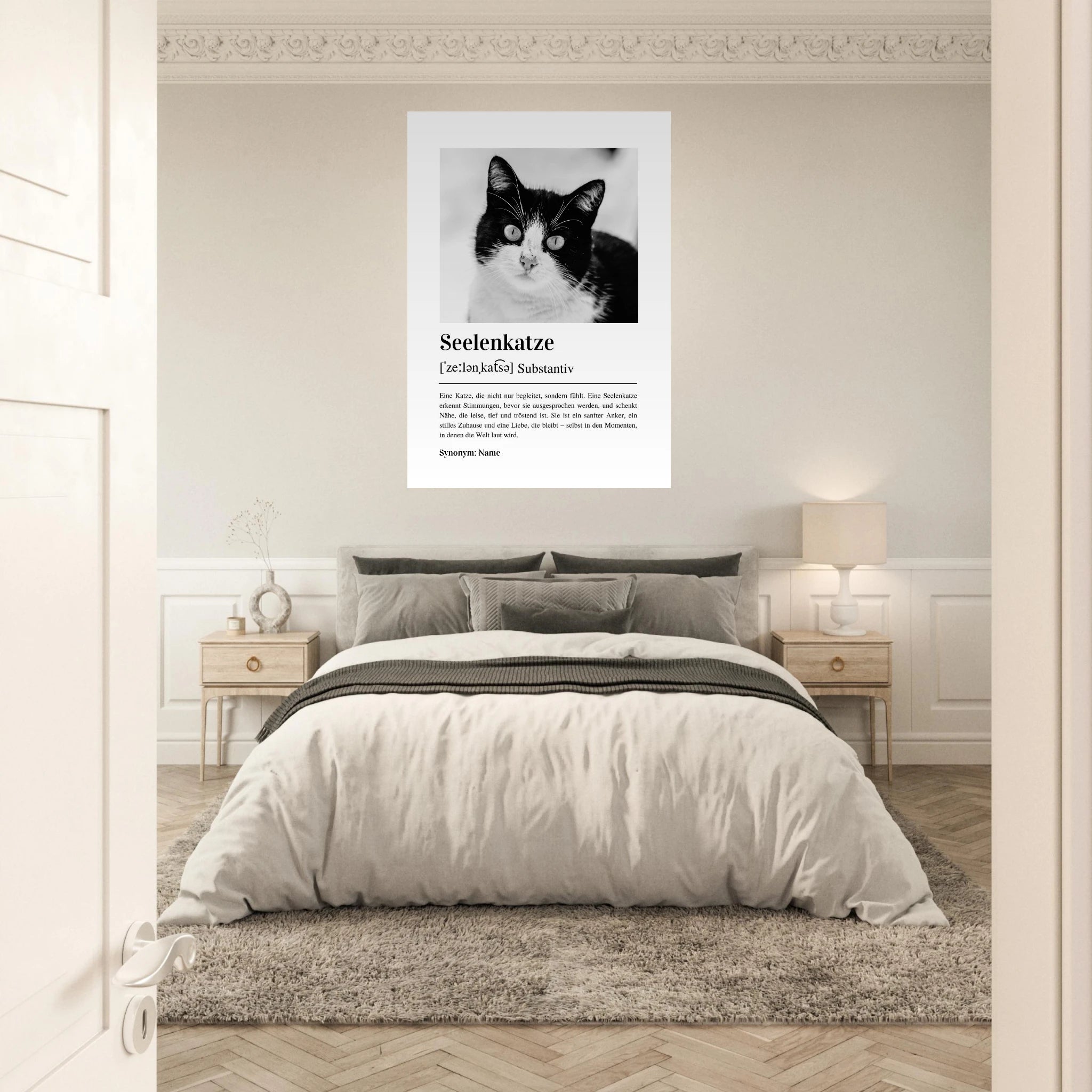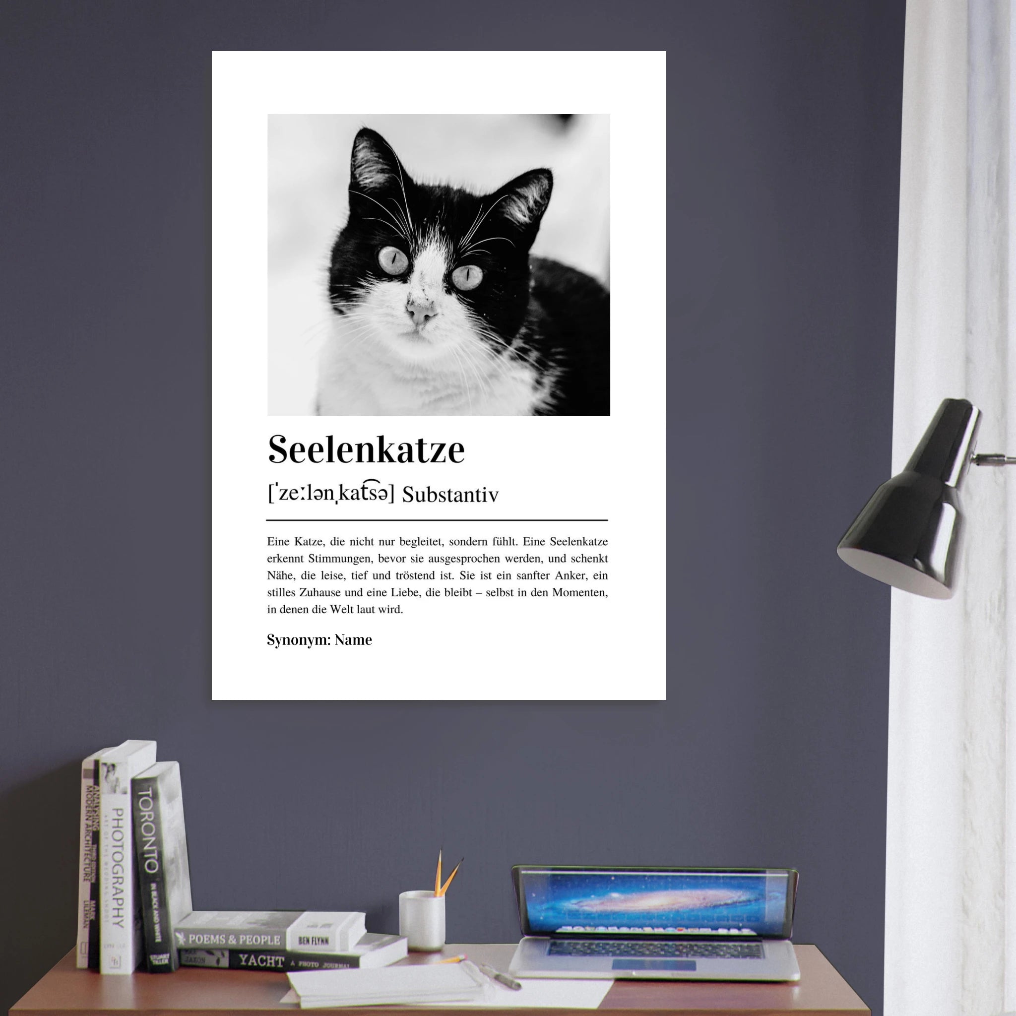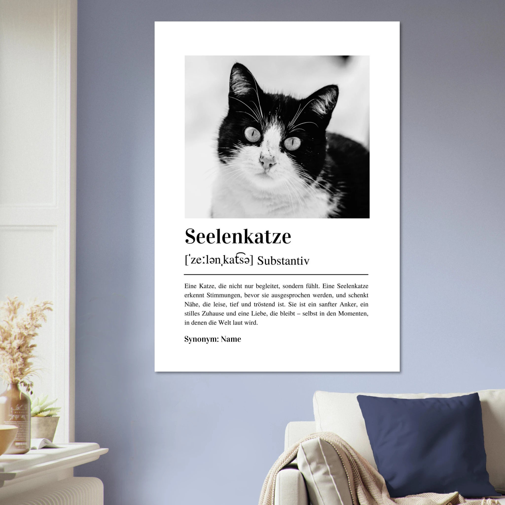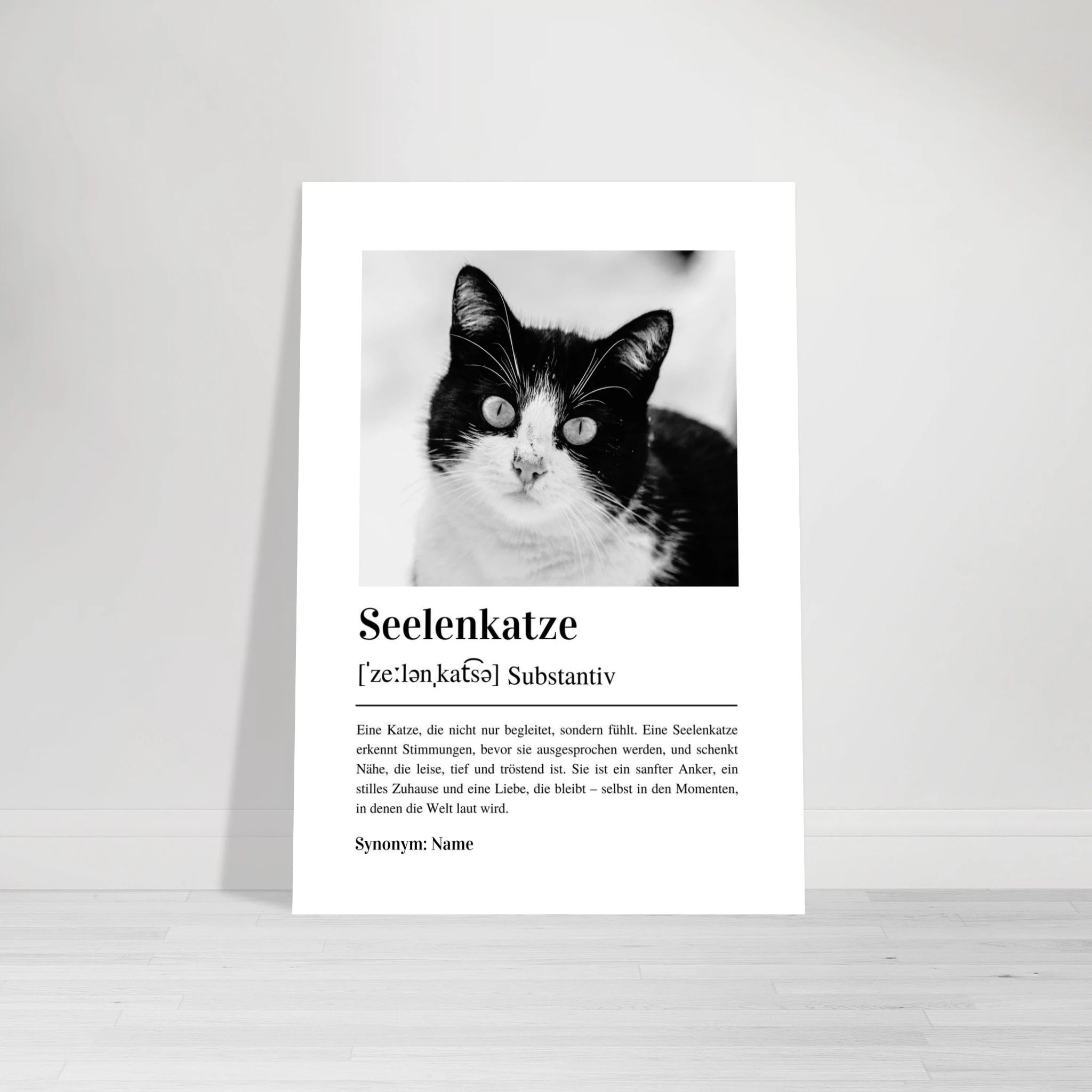 Gestalte Dein ganz persönliches Katzenposter mit unserem Definitions-Poster Seelenkatze! Perfekt für Tierliebhaber, die ihrer Samtpfote eine besondere Ehre erweisen möchten.