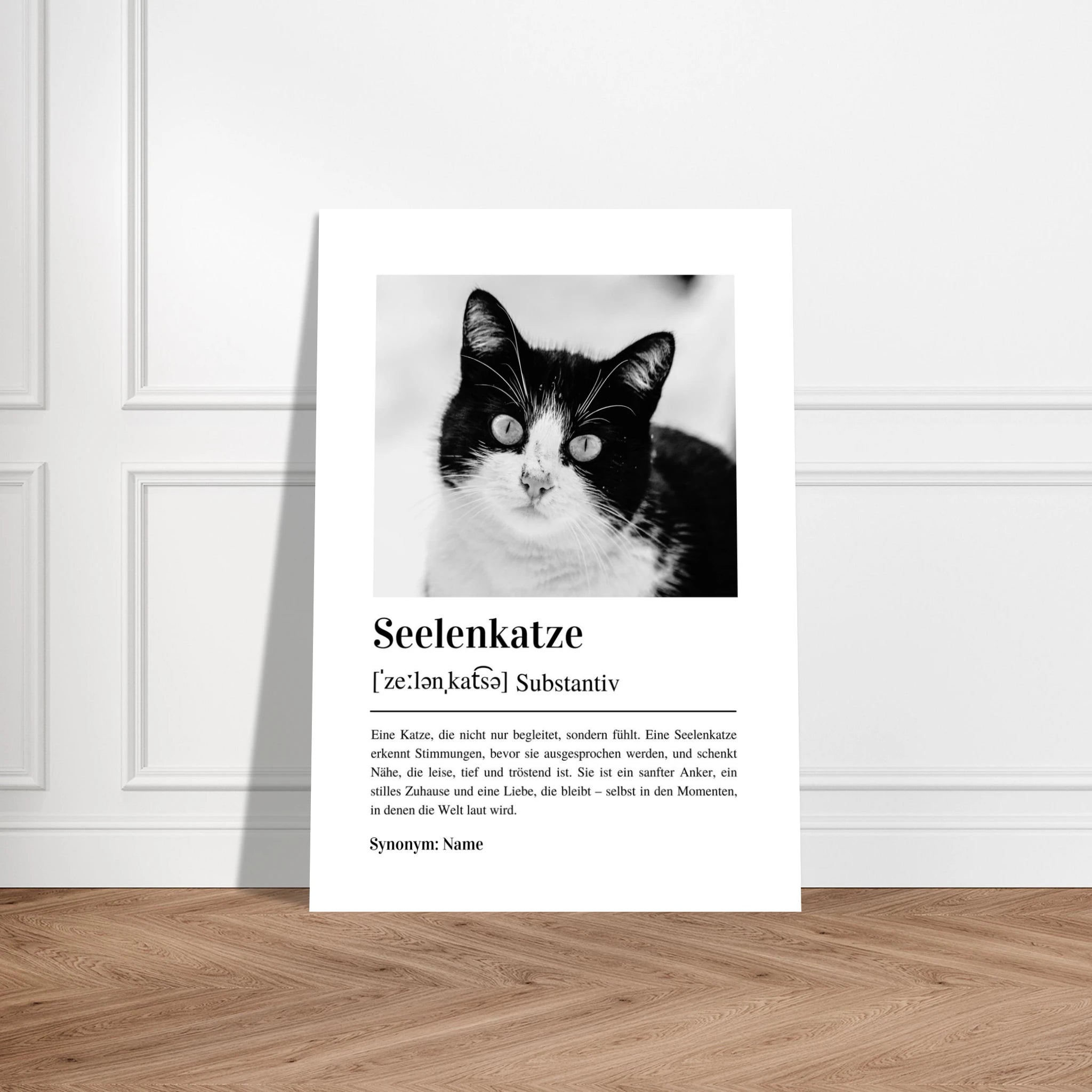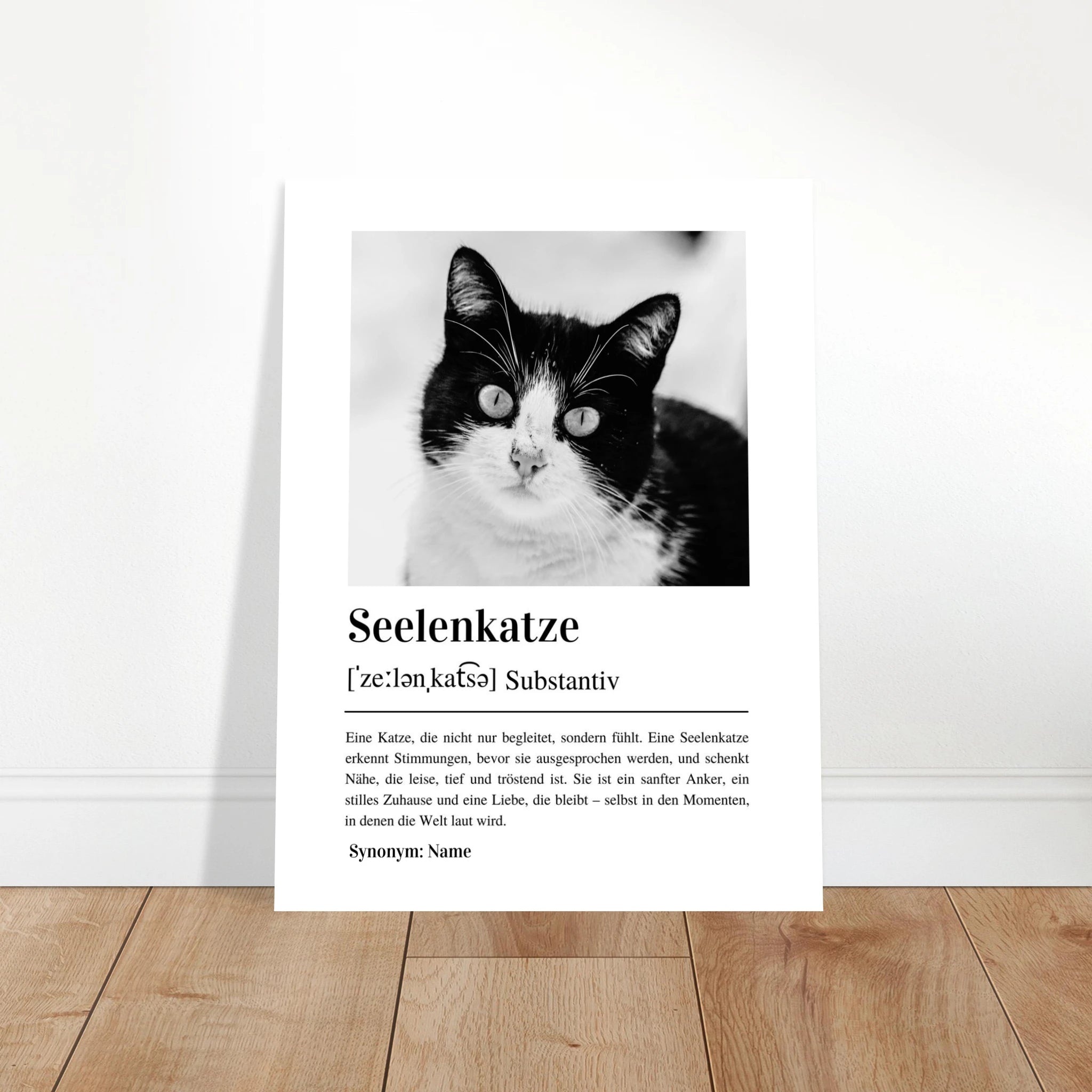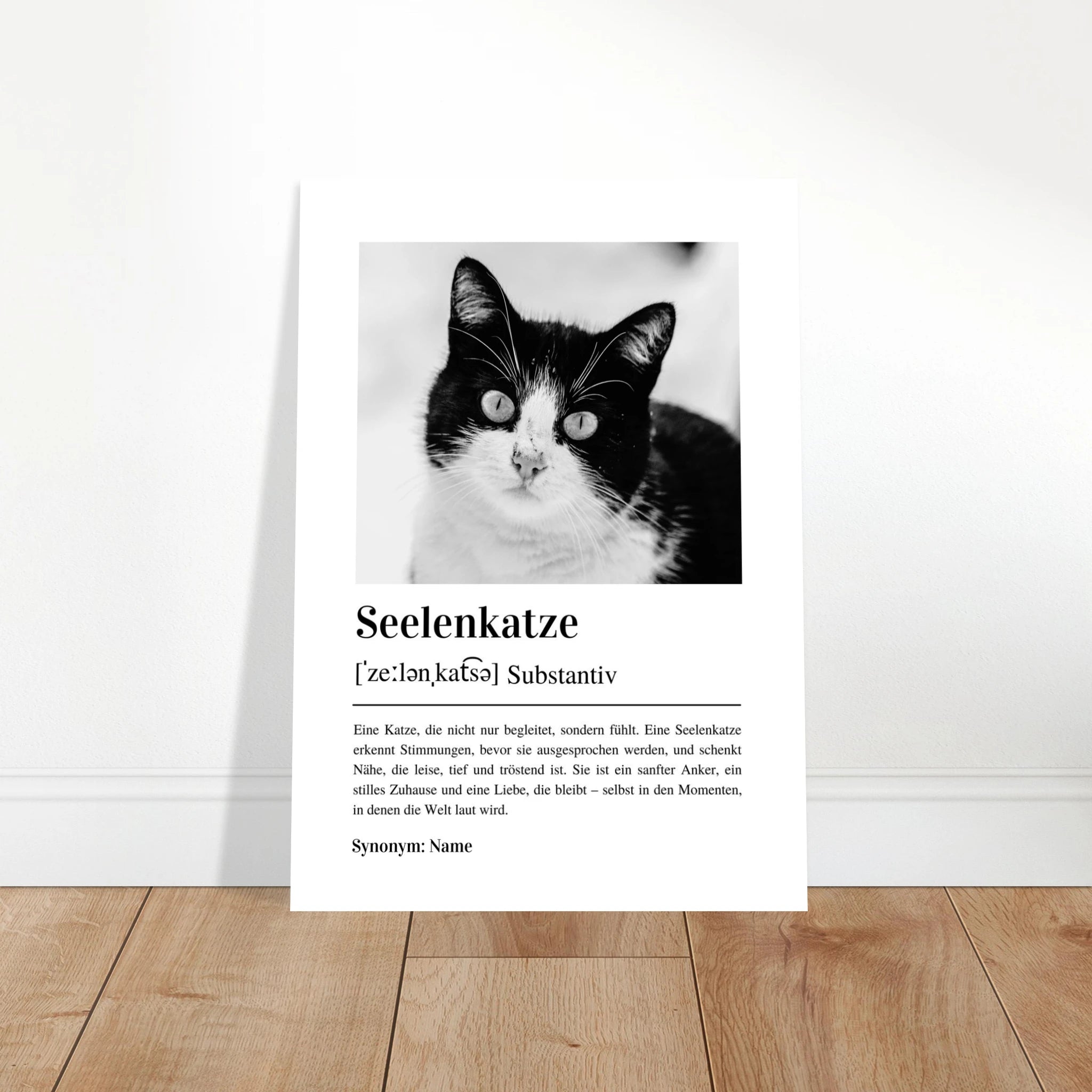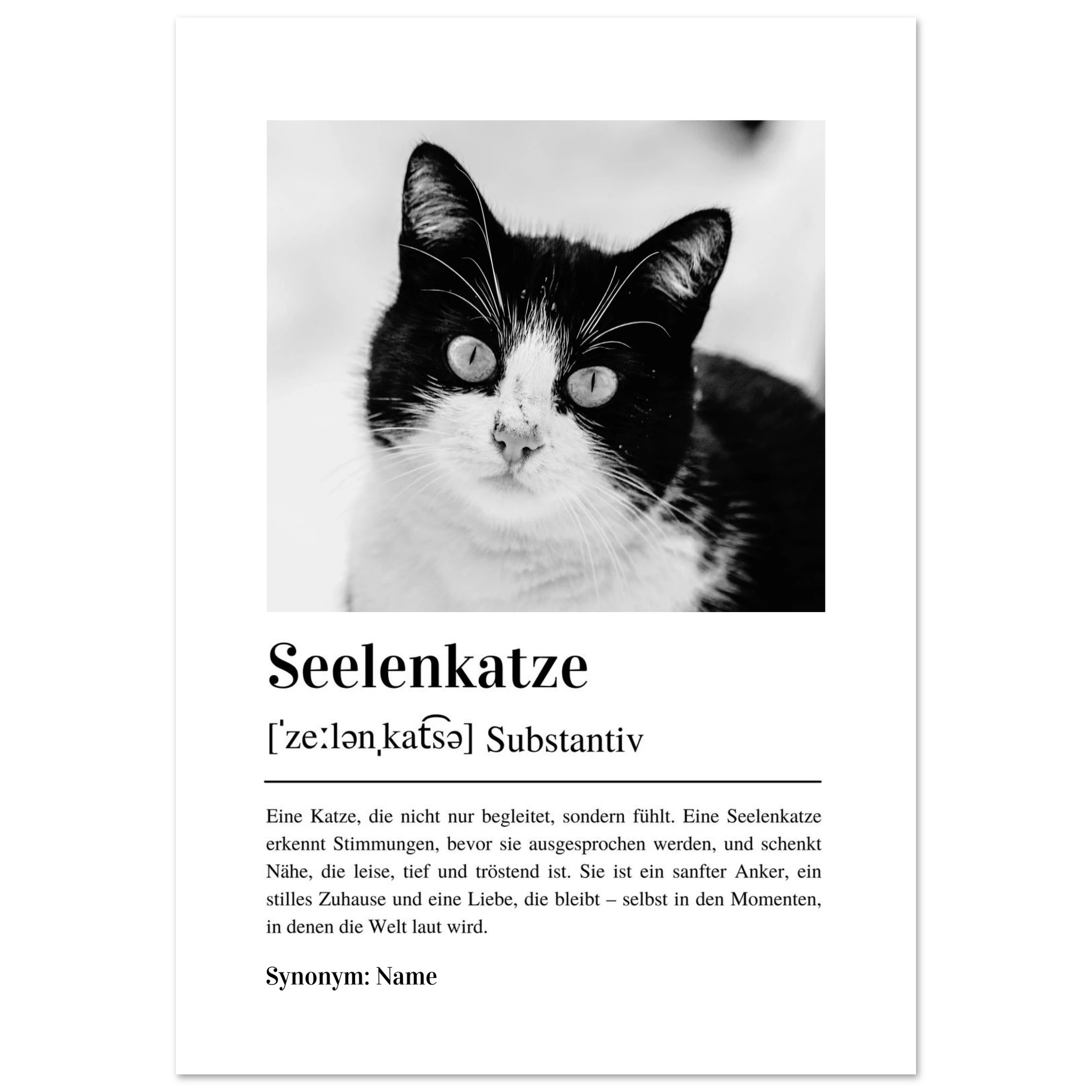 Gestalte Dein ganz persönliches Katzenposter mit unserem Definitions-Poster Seelenkatze! Perfekt für Tierliebhaber, die ihrer Samtpfote eine besondere Ehre erweisen möchten.