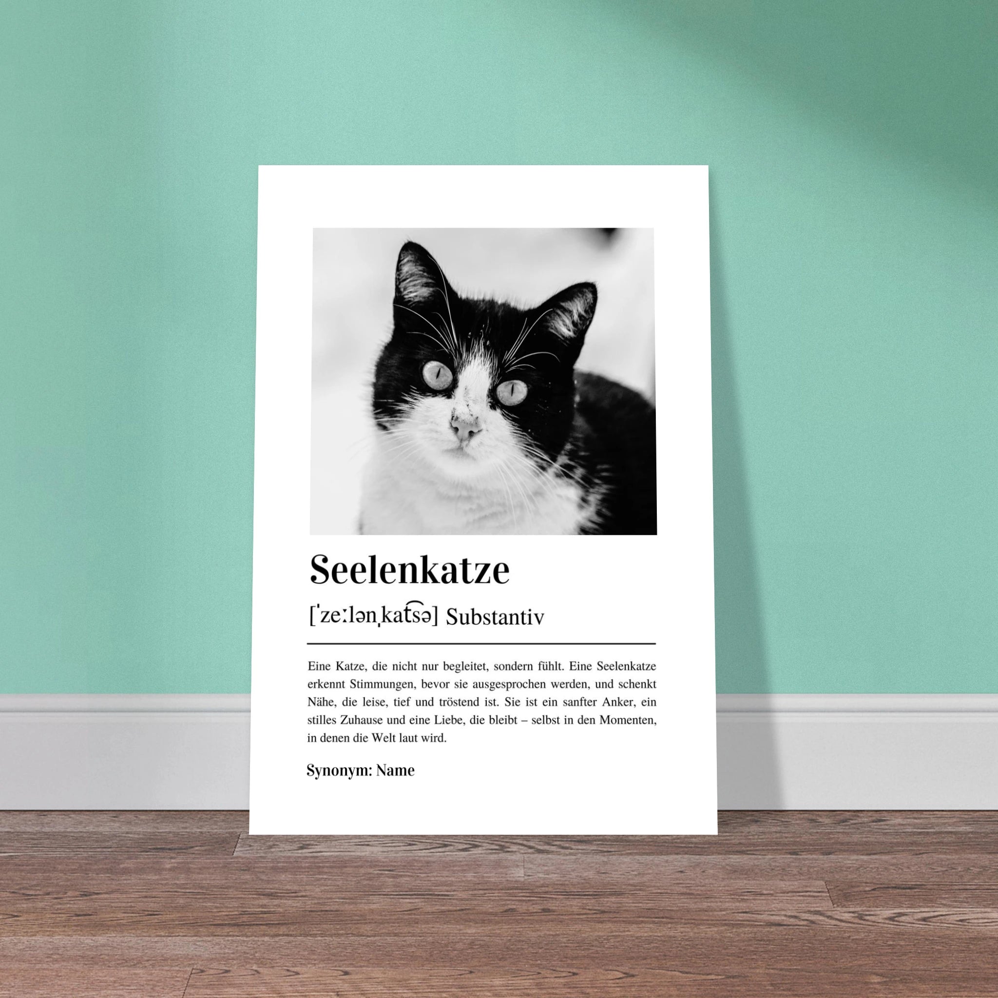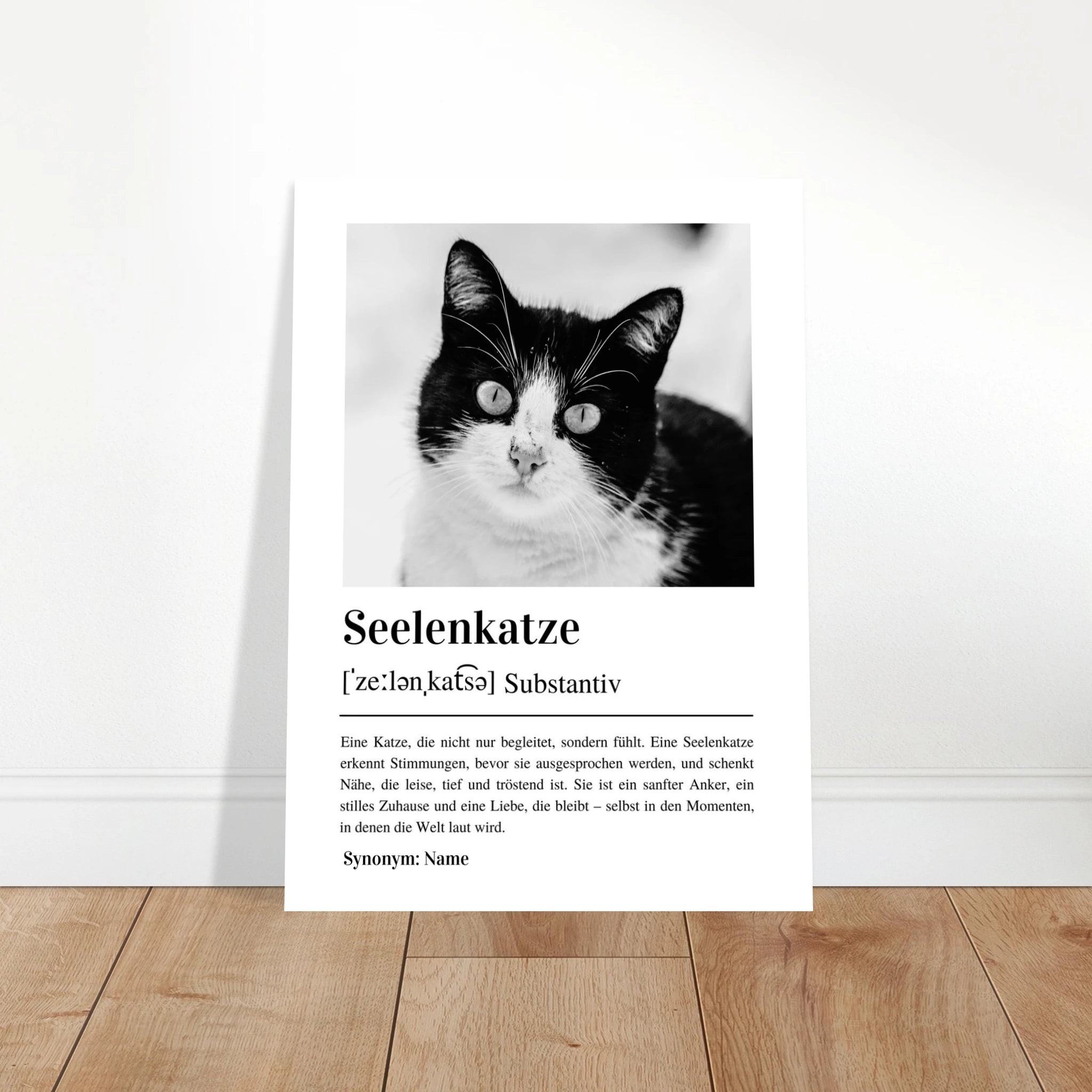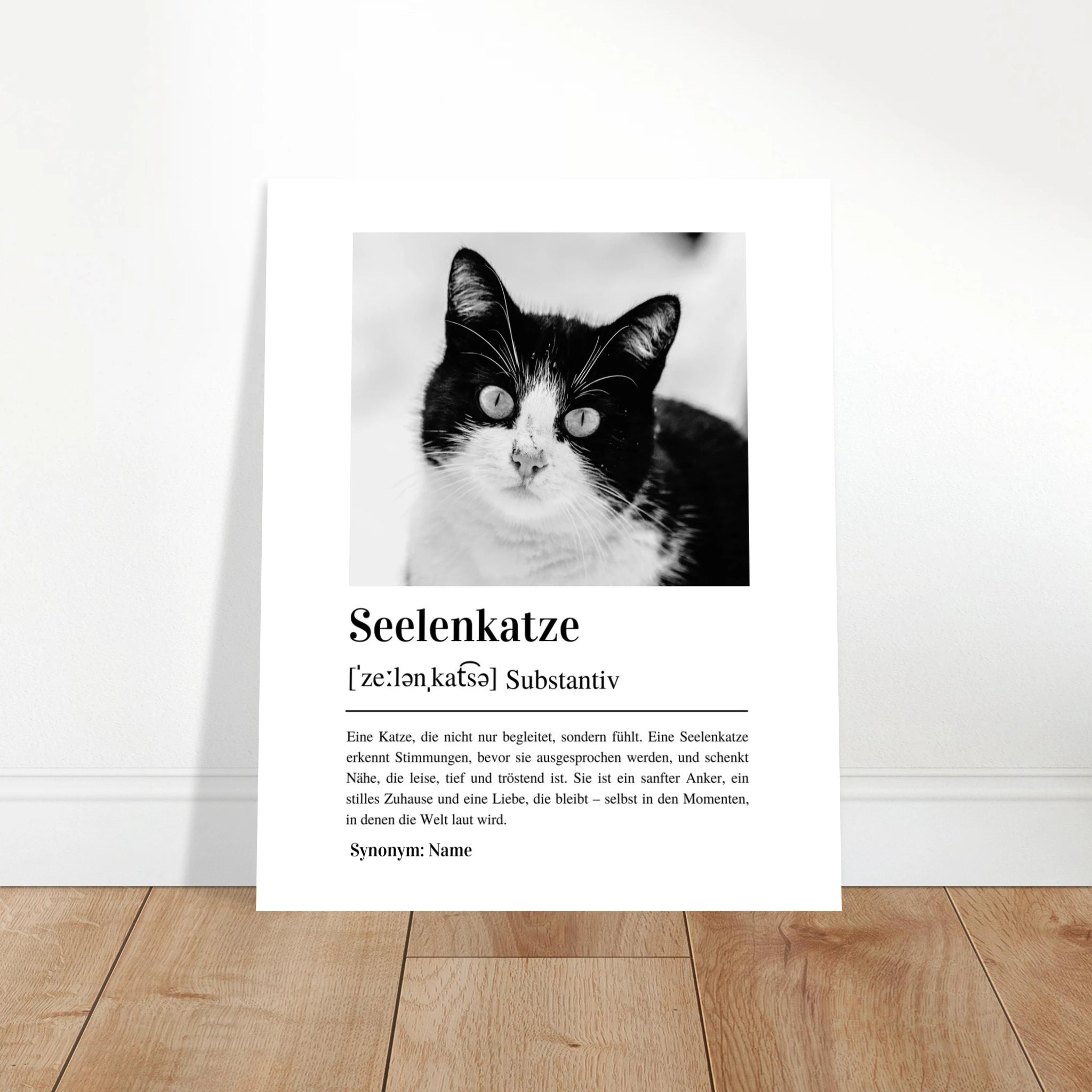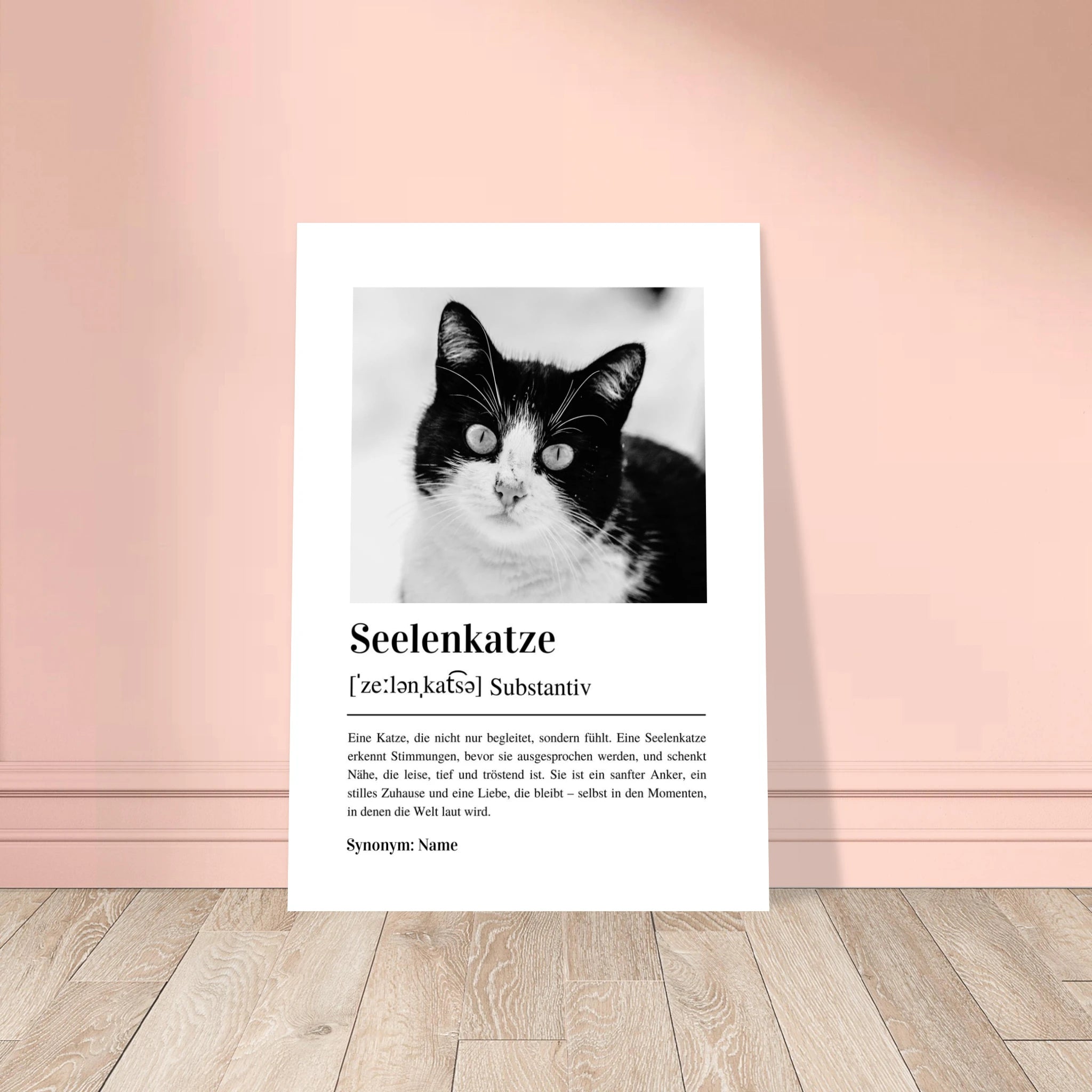 Gestalte Dein ganz persönliches Katzenposter mit unserem Definitions-Poster Seelenkatze! Perfekt für Tierliebhaber, die ihrer Samtpfote eine besondere Ehre erweisen möchten.