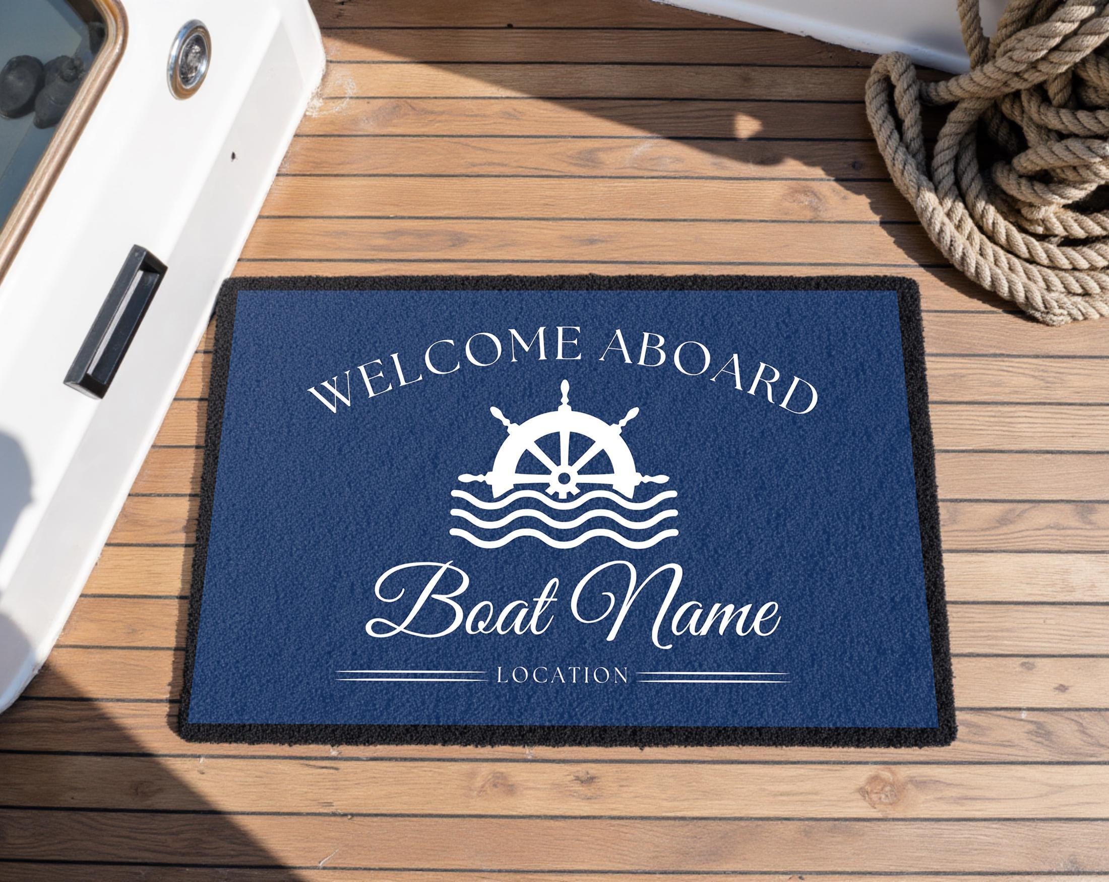 Willkommen an Bord - mit diesem Fußabtreter für Dein Boot! Diese maritim gehaltenen Fußmatte wird für Dich genau nach Deinen Wünschen personalisiert: Gib den Bootsnamen und die Jahreszahl an. Bitte beachte, dass die Matte immer einen schmalen schwarzen Gummirand hat, auch, wenn sie in der Hauptfarbe blau erstellt wird.