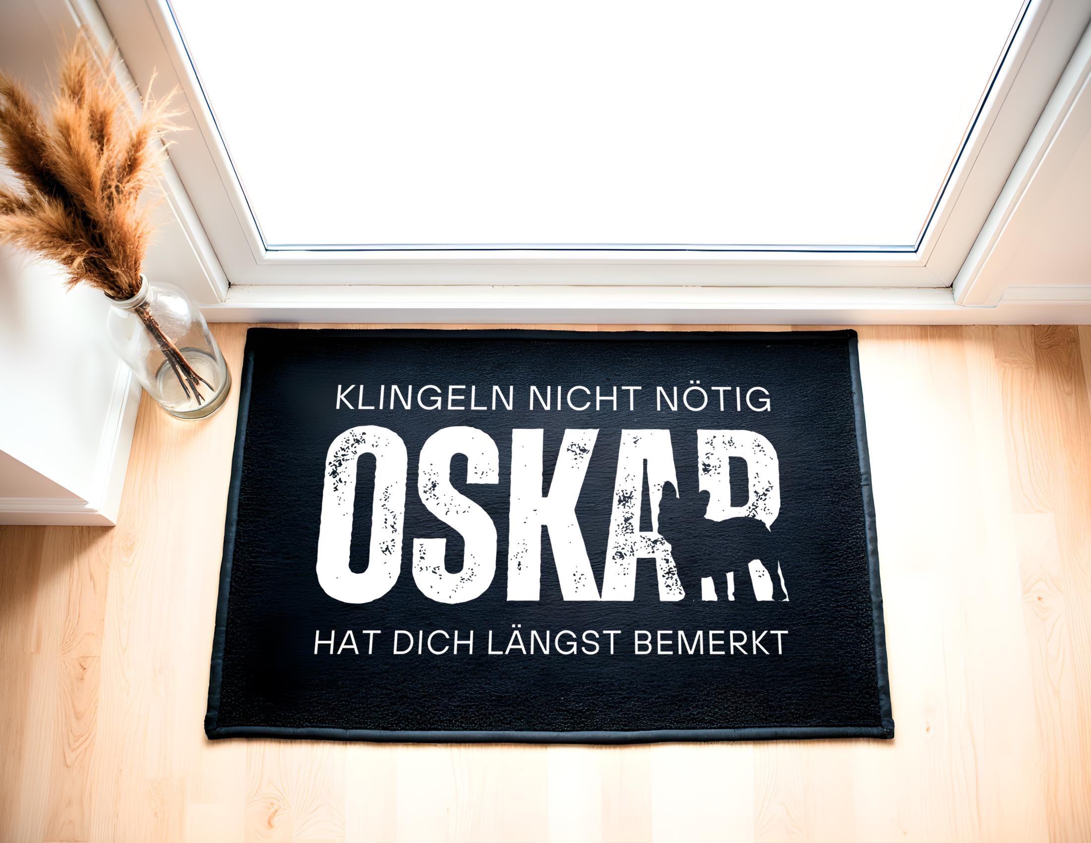 Entdecke die originelle Fußmatte für Hundebesitzer: "Klingeln nicht notwendig (Name & Silhouette der Rasse) hat dich längst bemerkt". Unsere praktische, schmutzabweisende Fußmatte erklärt dem Besuch schon an der Haustür, wer hier der Chef im Haus ist!