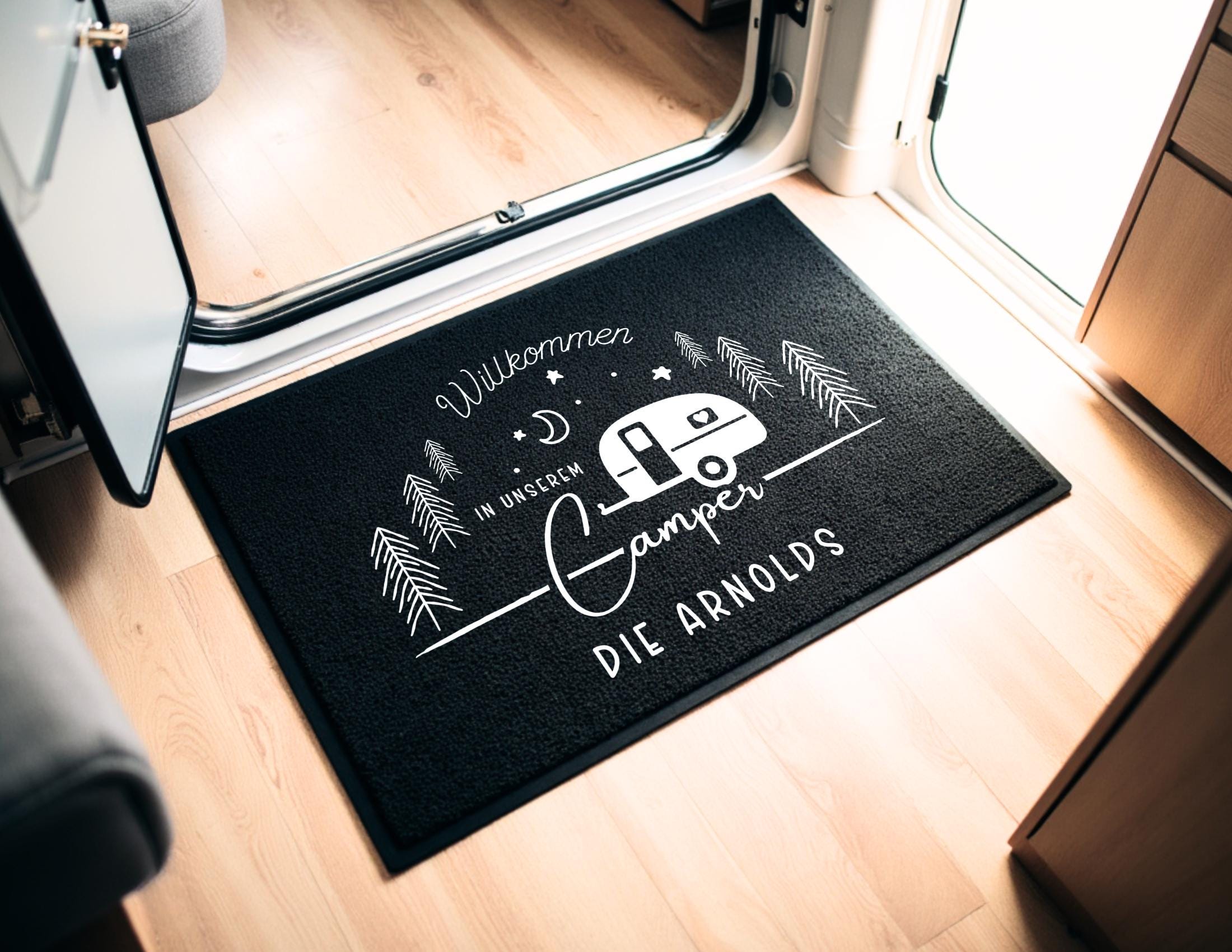 Personalisierung: Die Fußmatte trägt den Namen der Camper, was sie zu einem einzigartigen und persönlichen Geschenk macht.