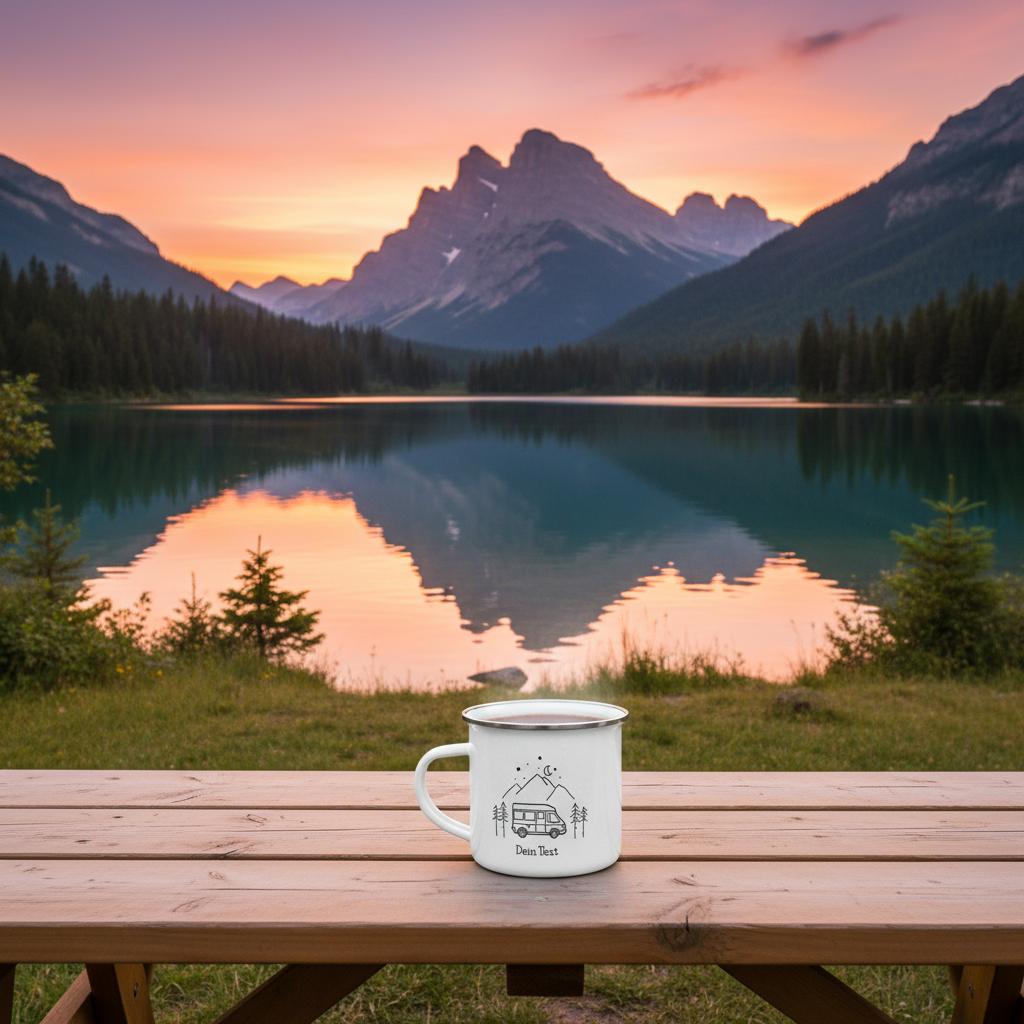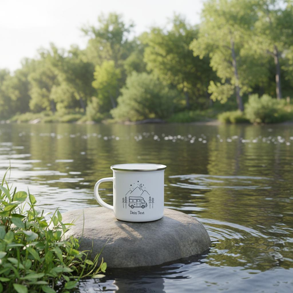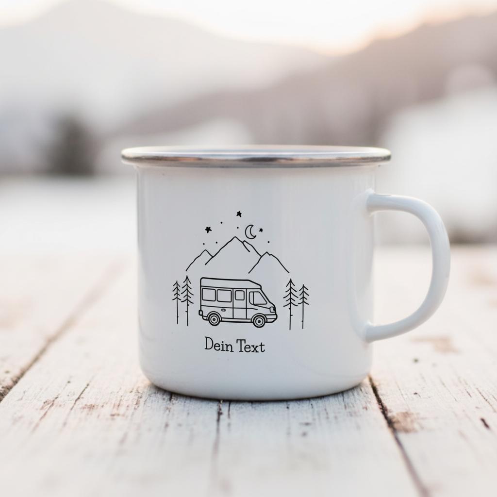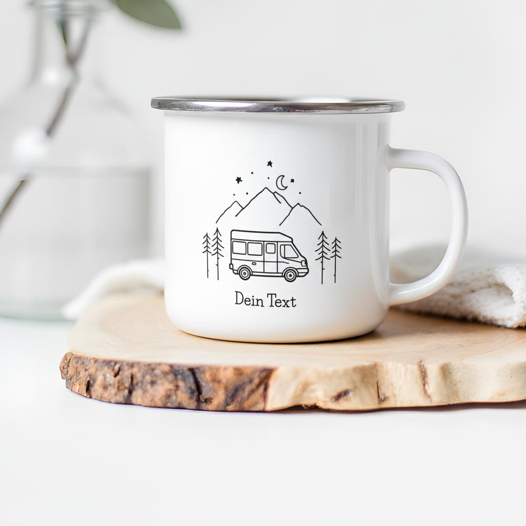 Personalisierte Emaille Camping Tasse – Dein Entwurf eines Wohnmobil-Motivs und Deinem Text