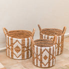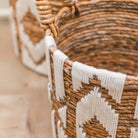 Unser außergewöhnlicher Nasari-Korb wird sorgfältig von erfahrenen indonesischen Kunsthandwerkern handgefertigt und zeichnet sich durch ein einzigartiges Design aus. Hier werden nachhaltige und robuste Bananenfasern mit weißen Baumwollbändern in einem traditionellen abstrakten Muster kombiniert, um einen Korb zu schaffen, der Ihrem Zuhause eine exotische Note verleiht.