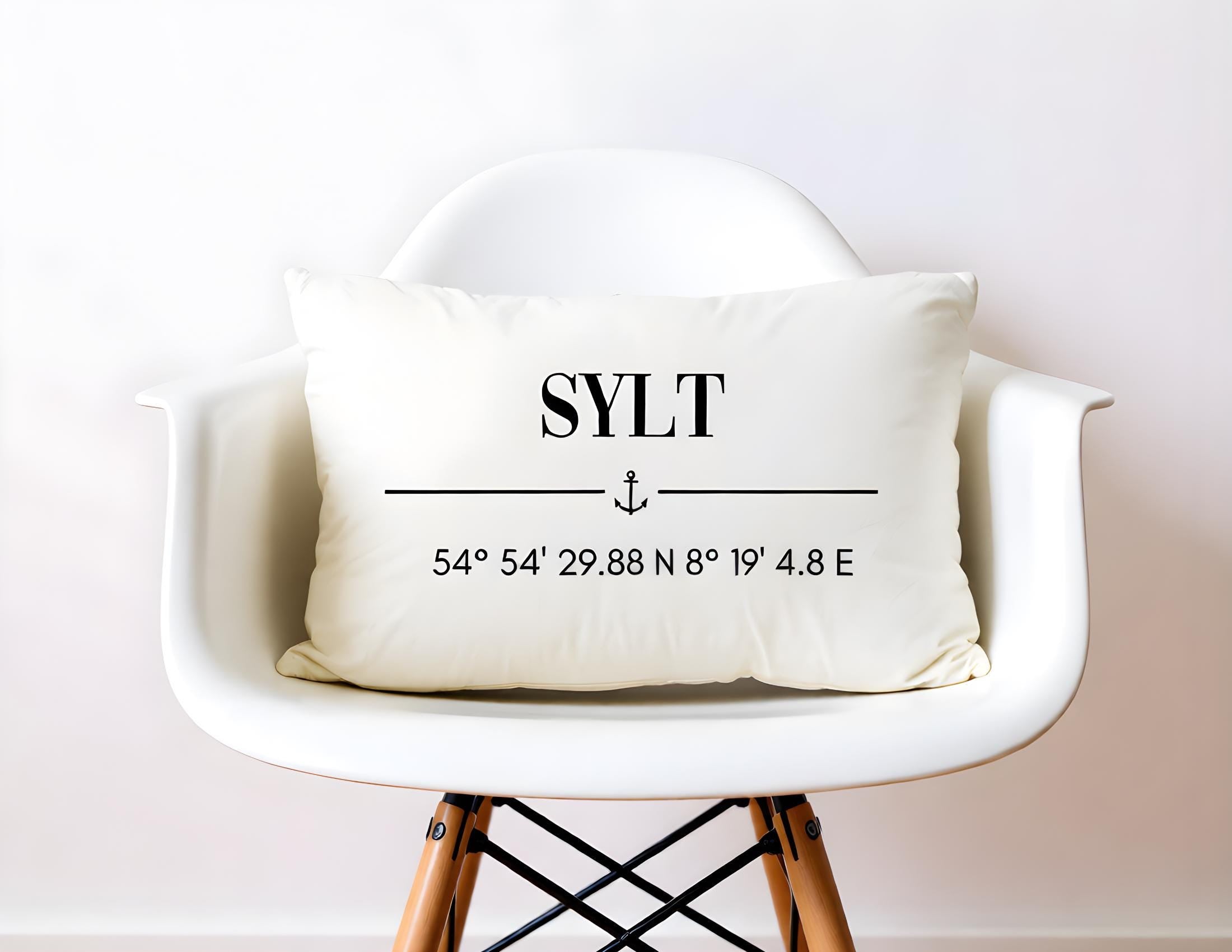 Liebhaber der Insel Sylt kommen an diesem kleinen querformatigen Kissen nicht vorbei. In weißer Schrift steht darauf "Sylt", dazu ein kleiner Anker sowie darunter die passenden Koordinaten. Damit holt man sich das geliebte Sylt-Feeling in die eigenen vier Wände, also den gemütlichen Beach House Look, der für das typische Nordsee Flair sorgt.