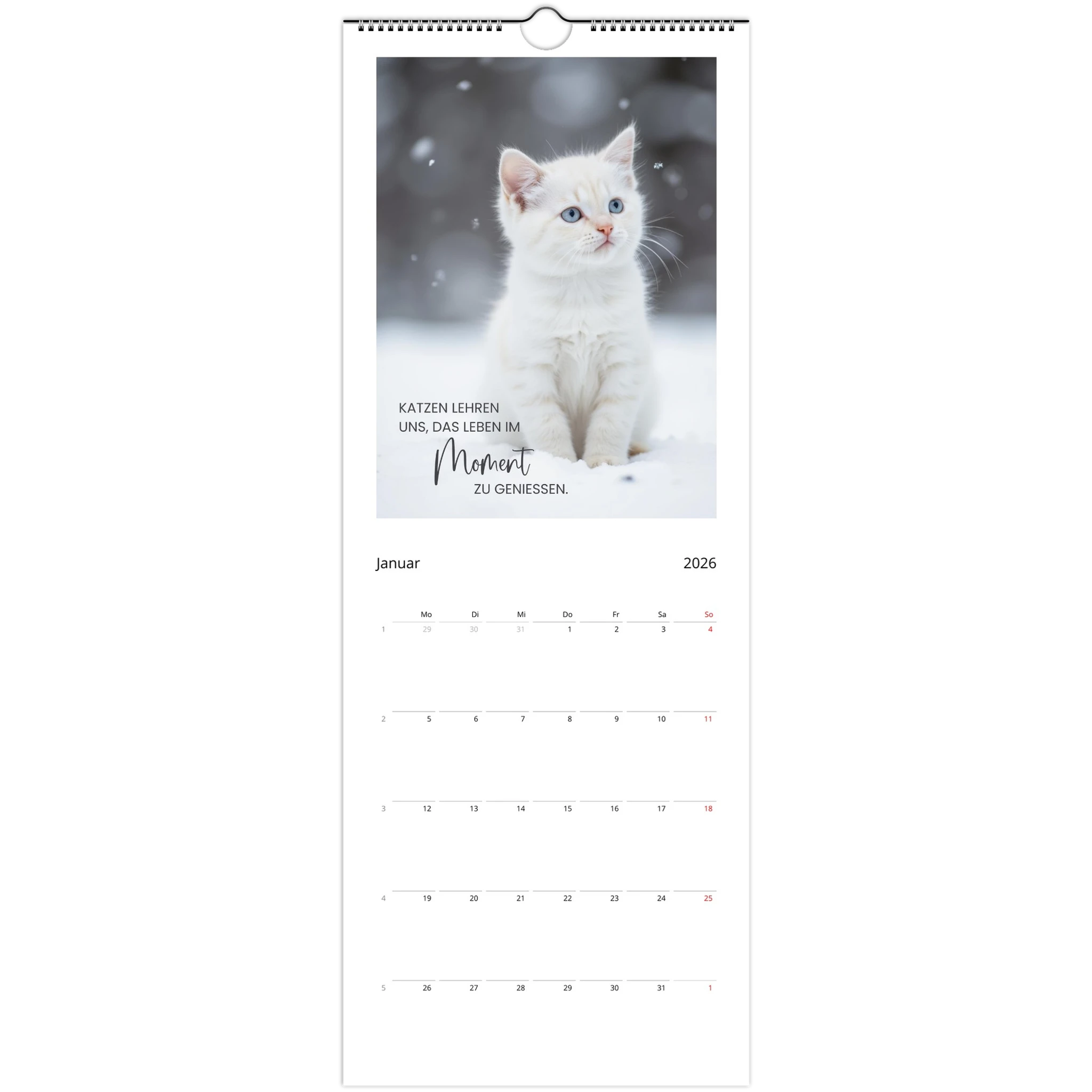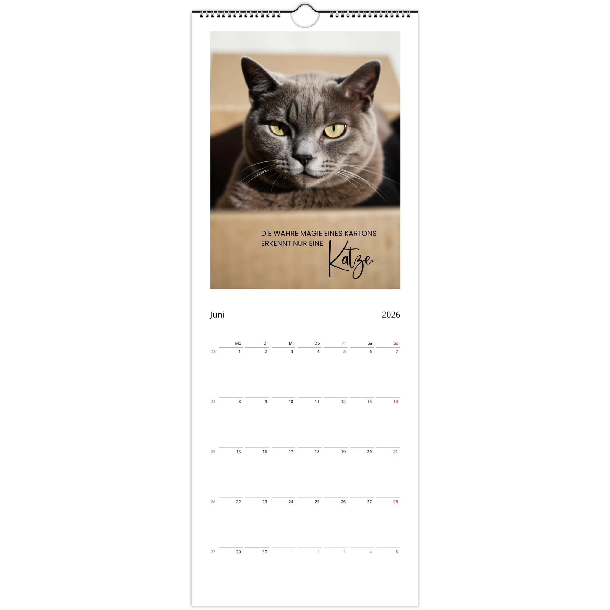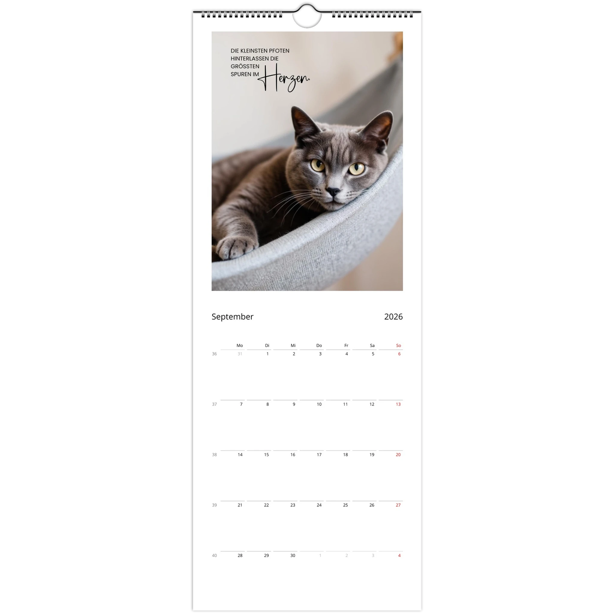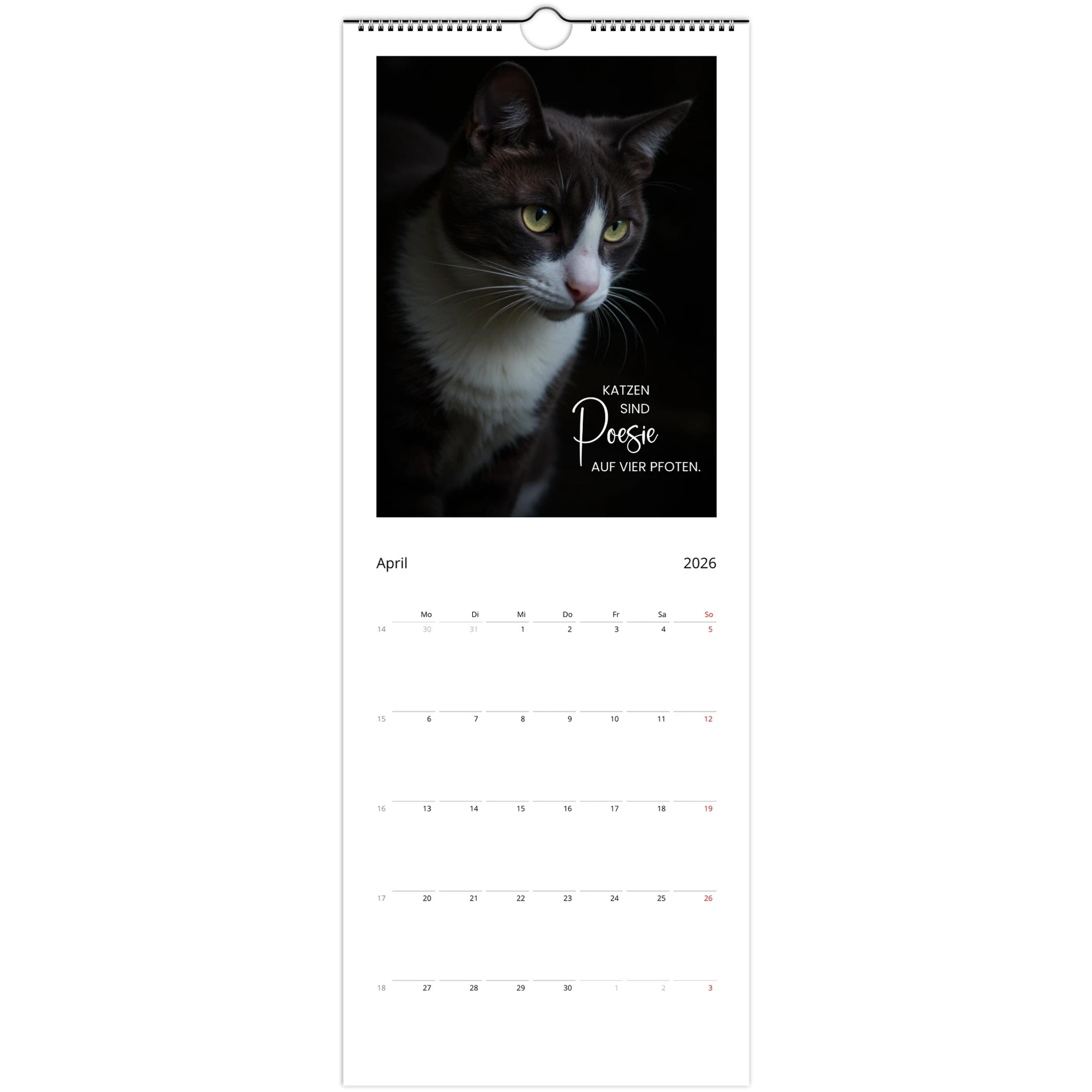 Entdecke den perfekten Wandkalender für Katzenliebhaber! Unser personalisierbarer Wandkalender 2026 ist nicht nur ein praktisches Datumstool, sondern auch ein täglicher Begleiter voller liebevoller Zitate und Sprüche für Katzenliebhaber.