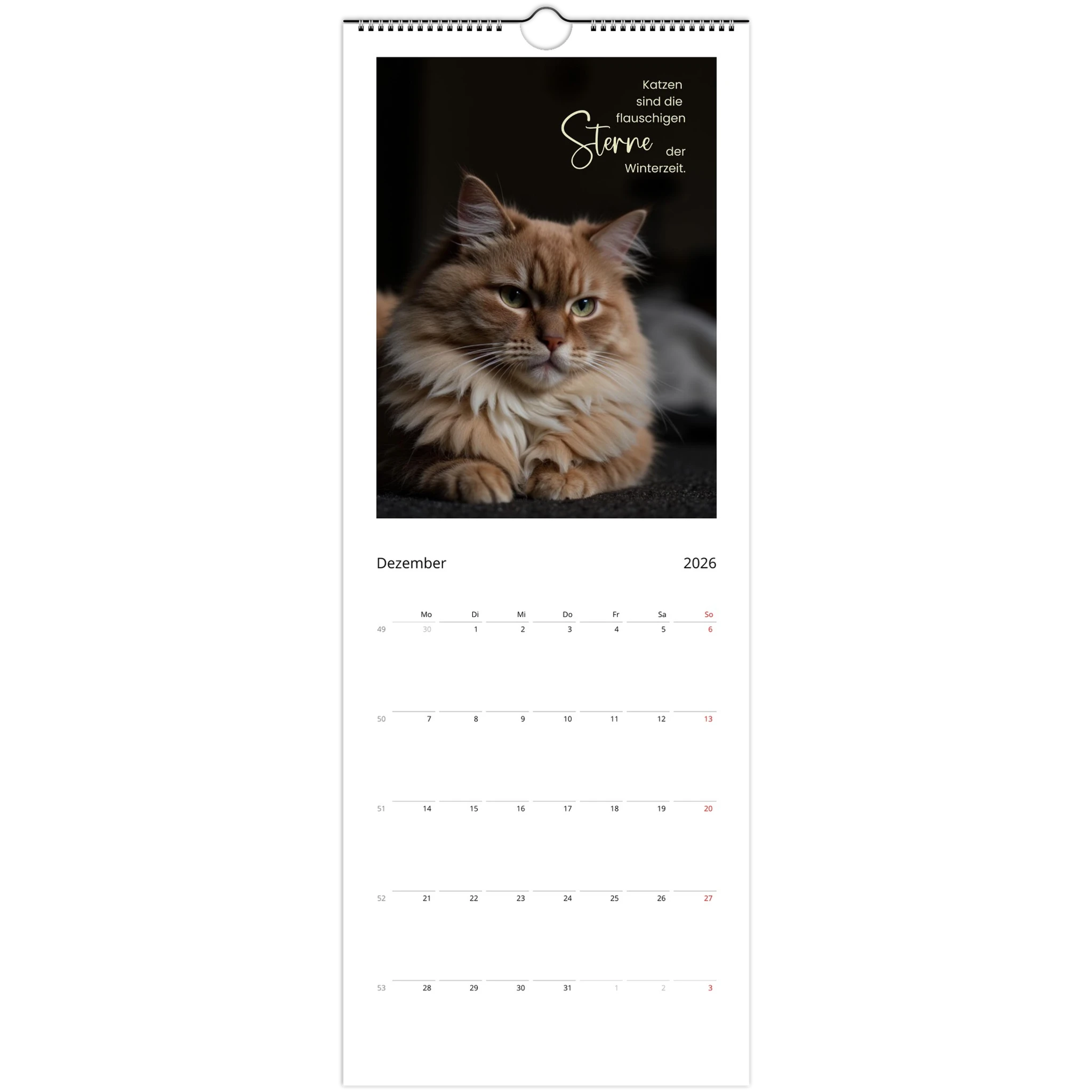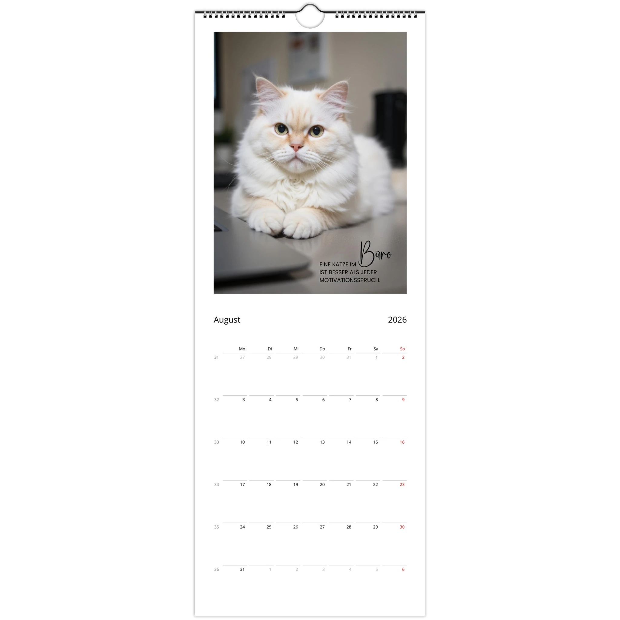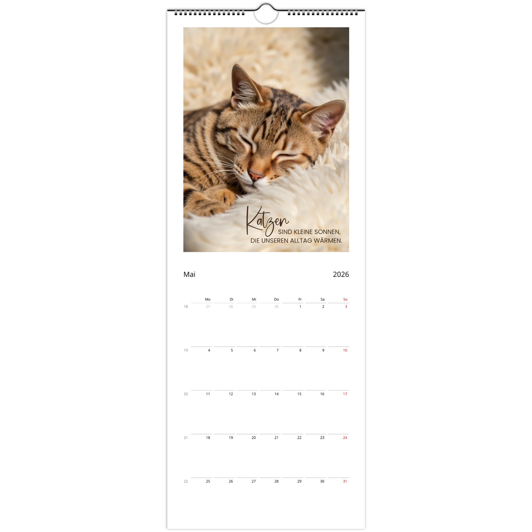 Entdecke den perfekten Wandkalender für Katzenliebhaber! Unser personalisierbarer Wandkalender 2026 ist nicht nur ein praktisches Datumstool, sondern auch ein täglicher Begleiter voller liebevoller Zitate und Sprüche für Katzenliebhaber.