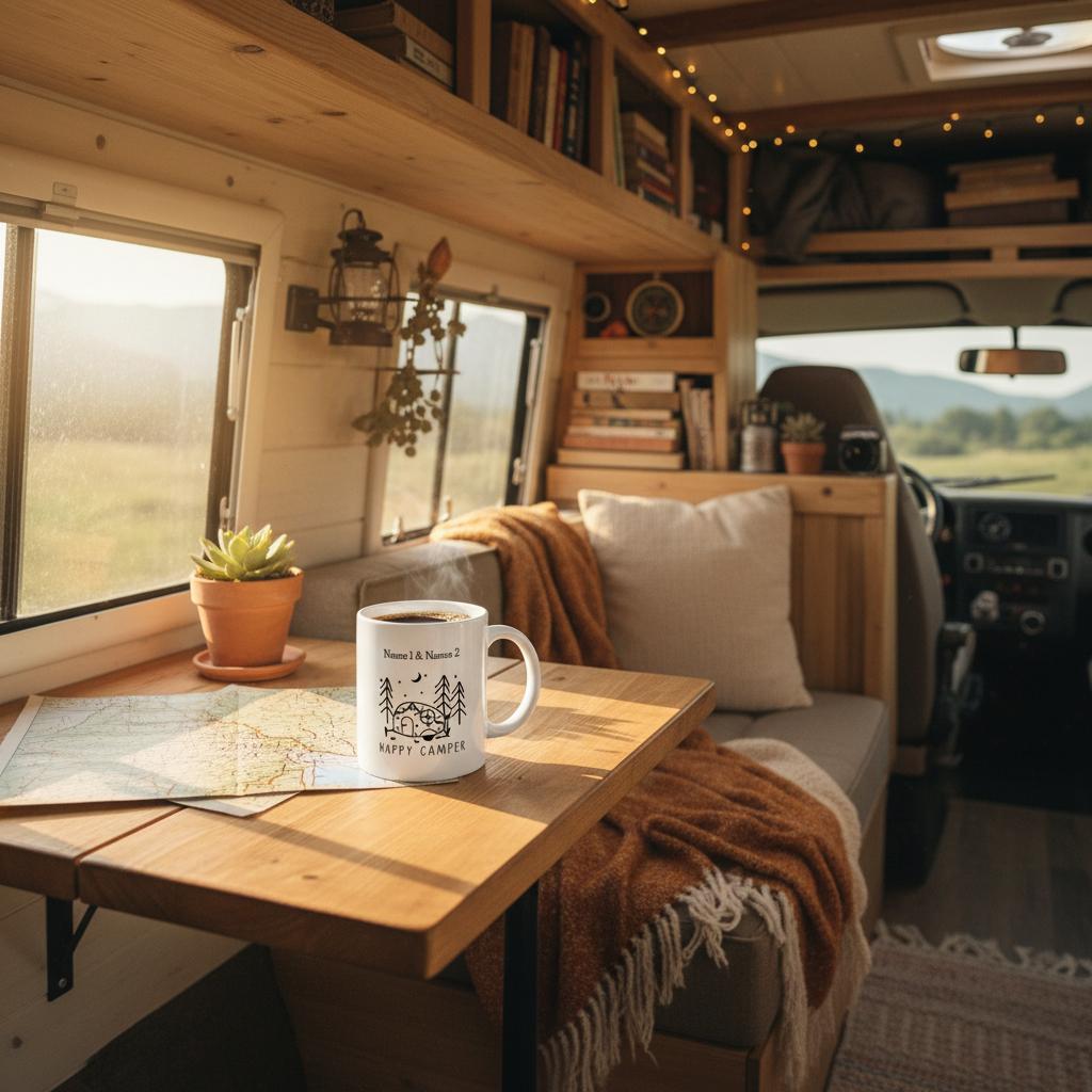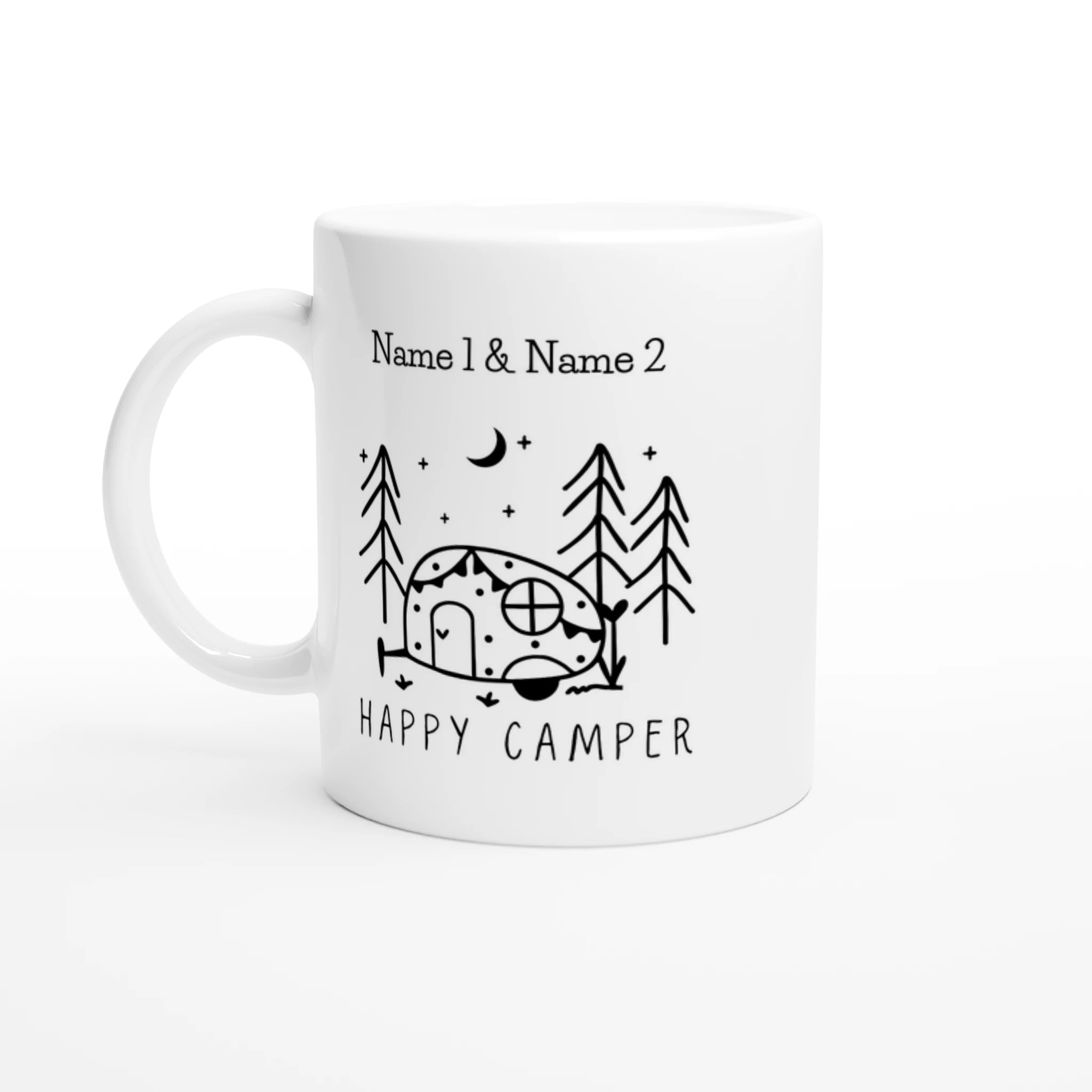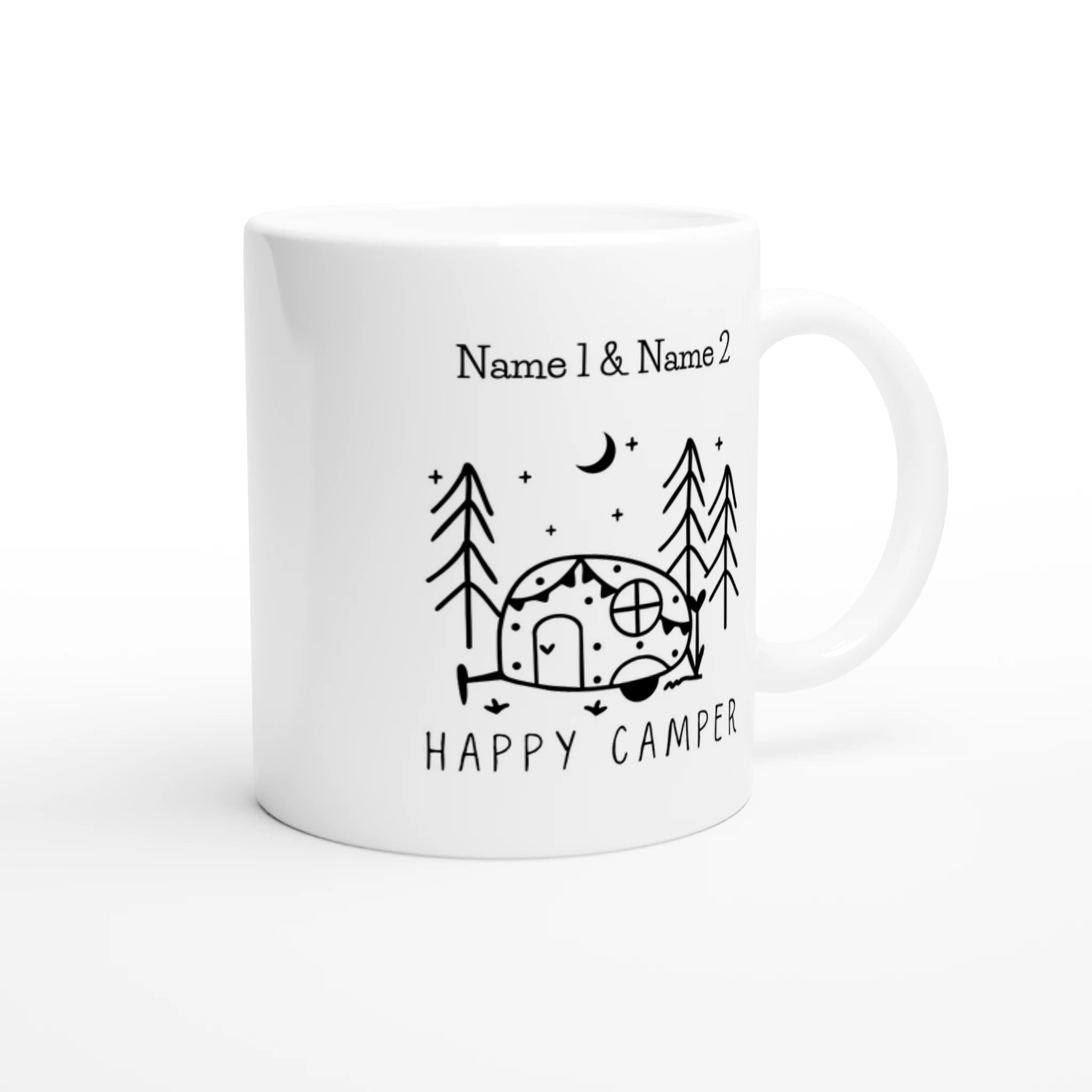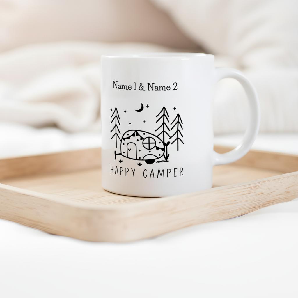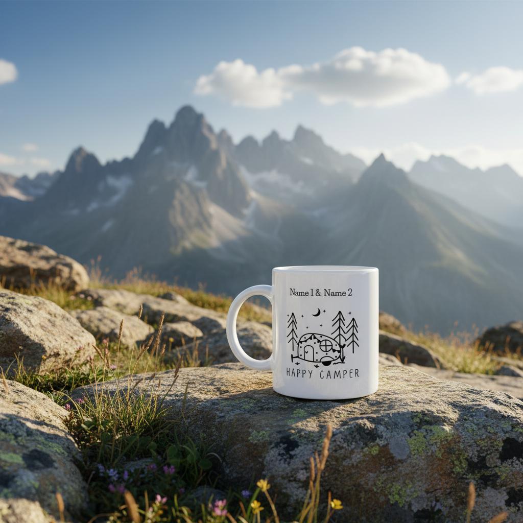 Genießen Sie Ihre Lieblingsgetränke mit unserer personalisierten Camping Keramiktasse. Diese einzigartige Tasse bietet die Möglichkeit, bis zu zwei Namen hinzuzufügen und macht sie zu einem perfekten Geschenk oder Andenken für jeden Camper.
