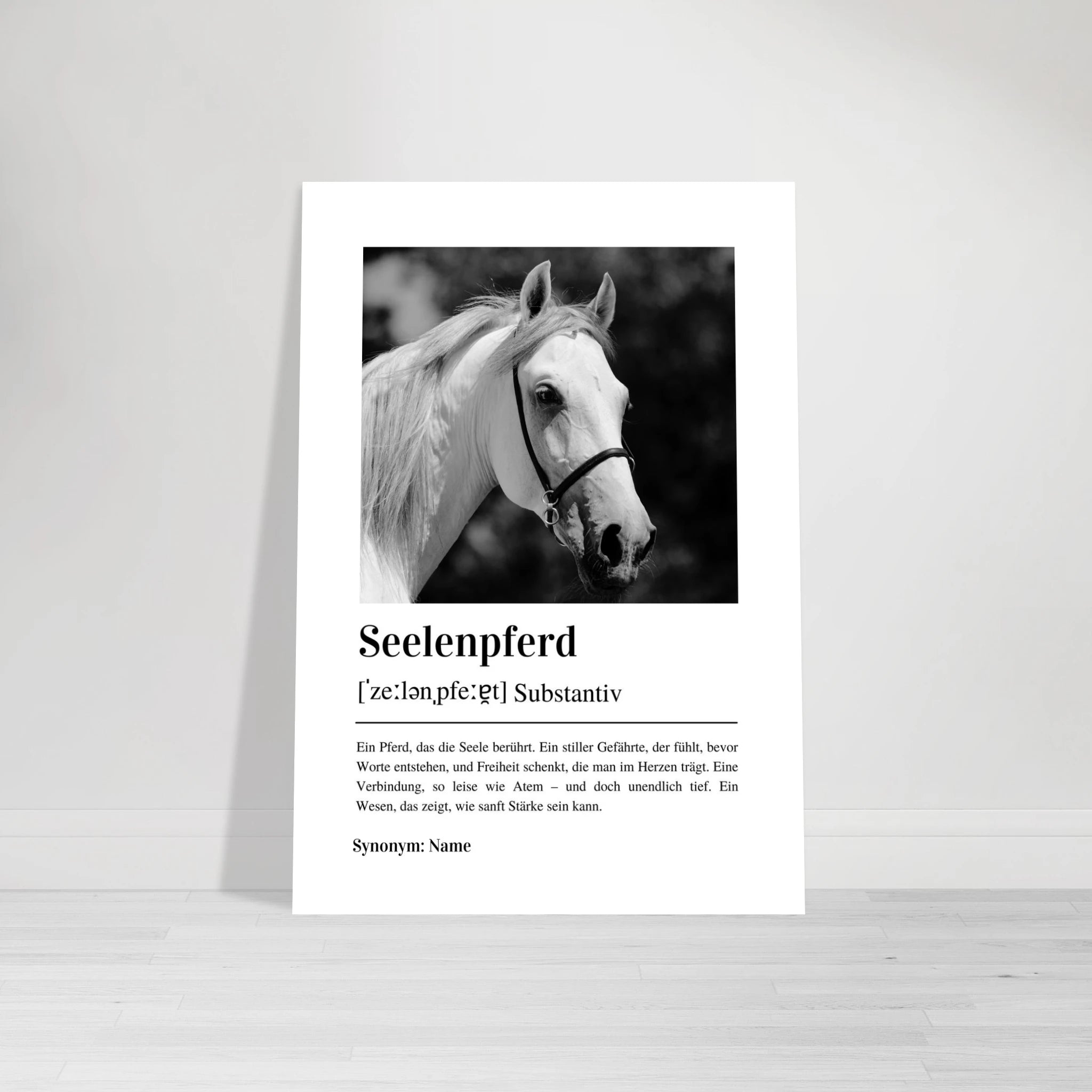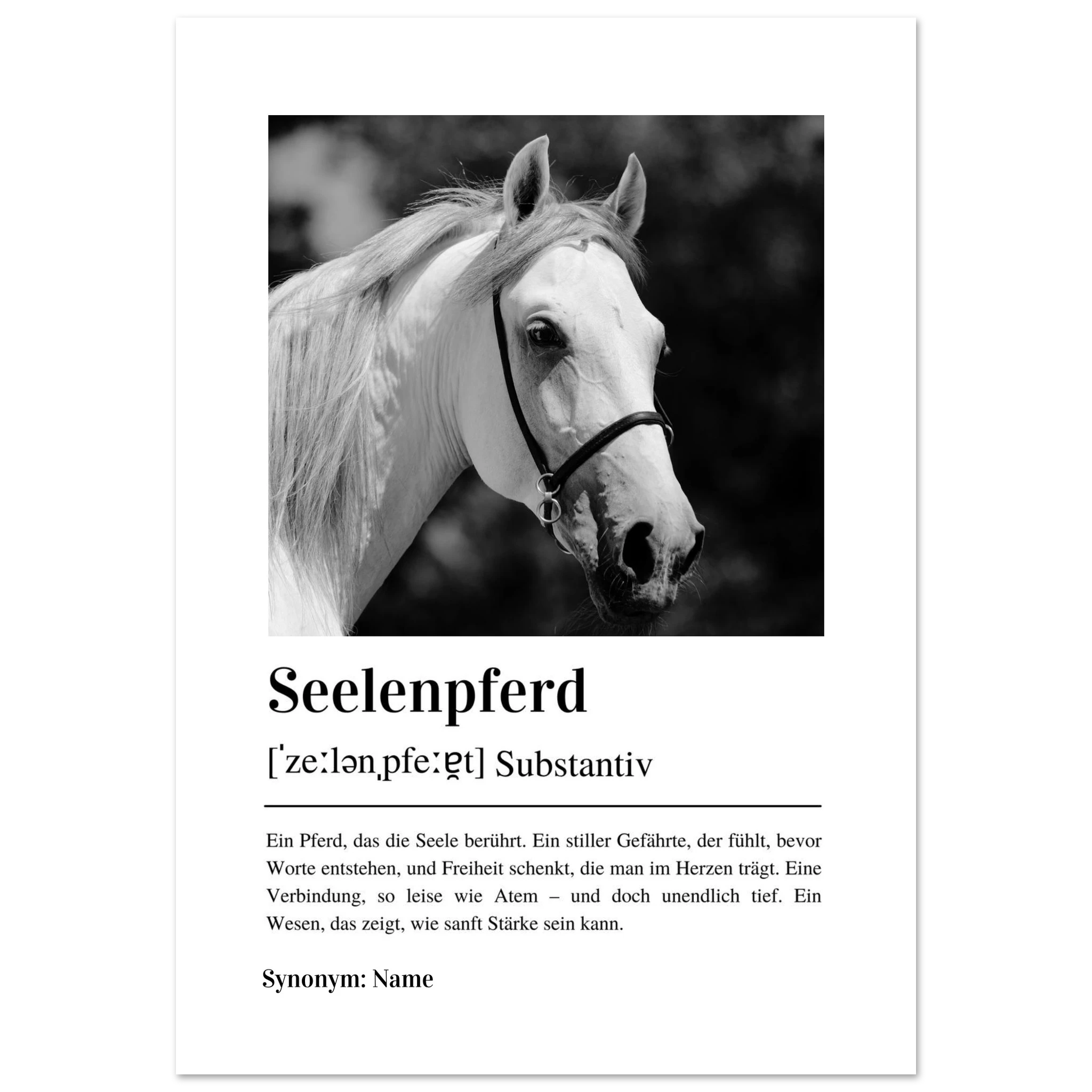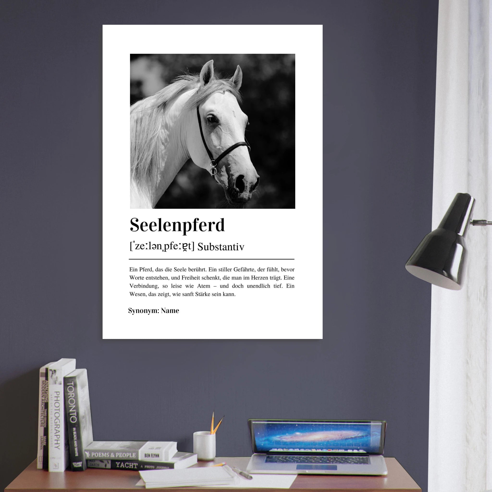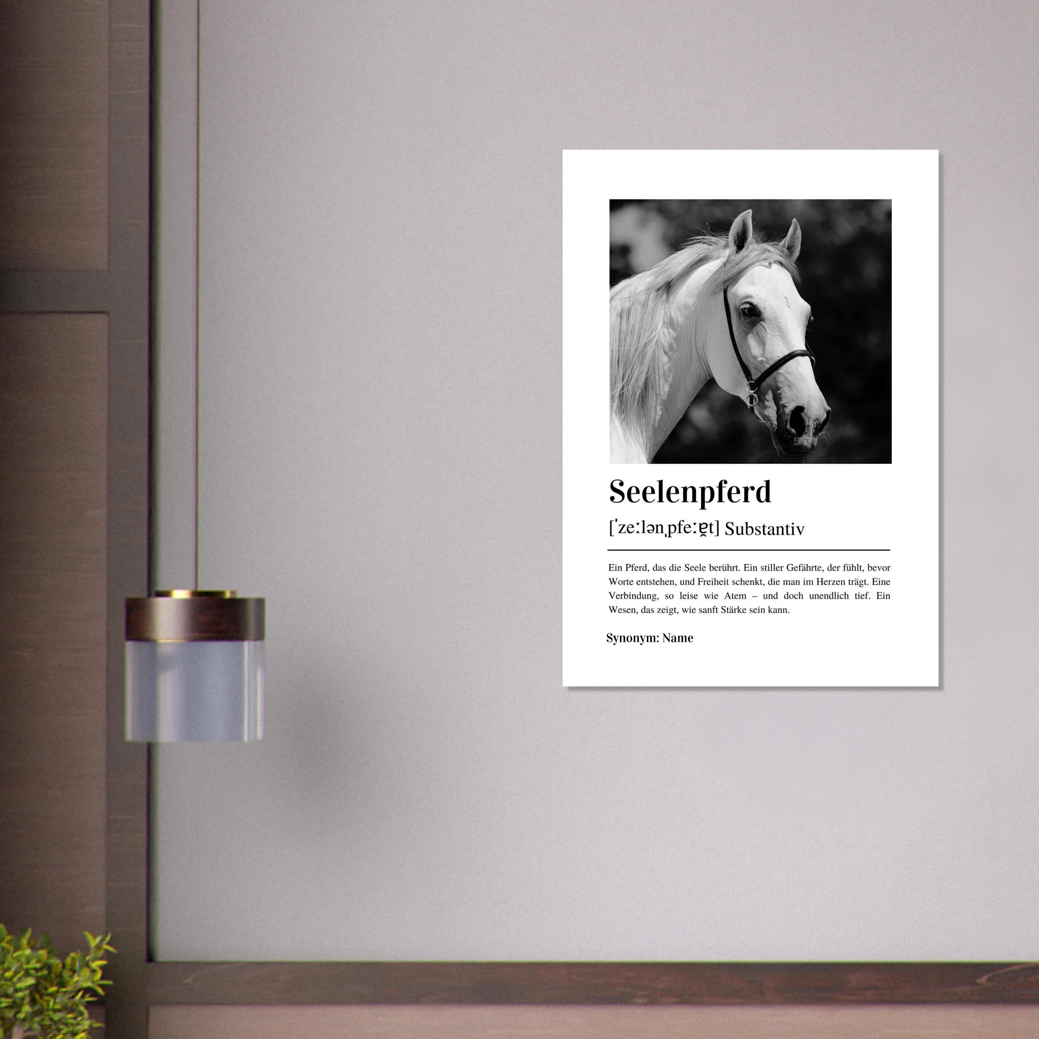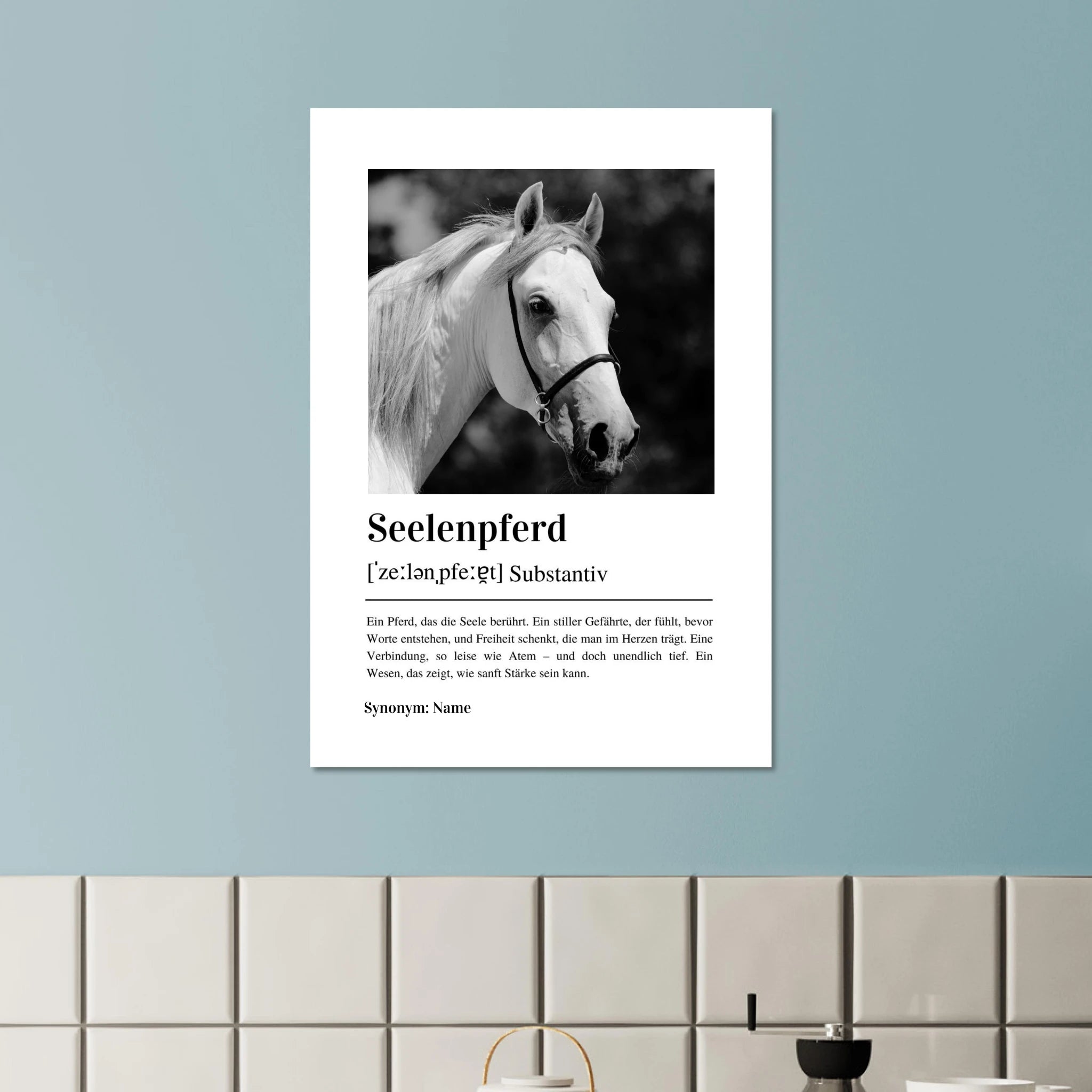 Gestalte Dein ganz persönliches Pferdeposter mit unserem Definitions-Poster Seelenpferd! Perfekt für Tierliebhaber, die ihrem liebsten tierischen Begleiter eine besondere Ehre erweisen möchten.
