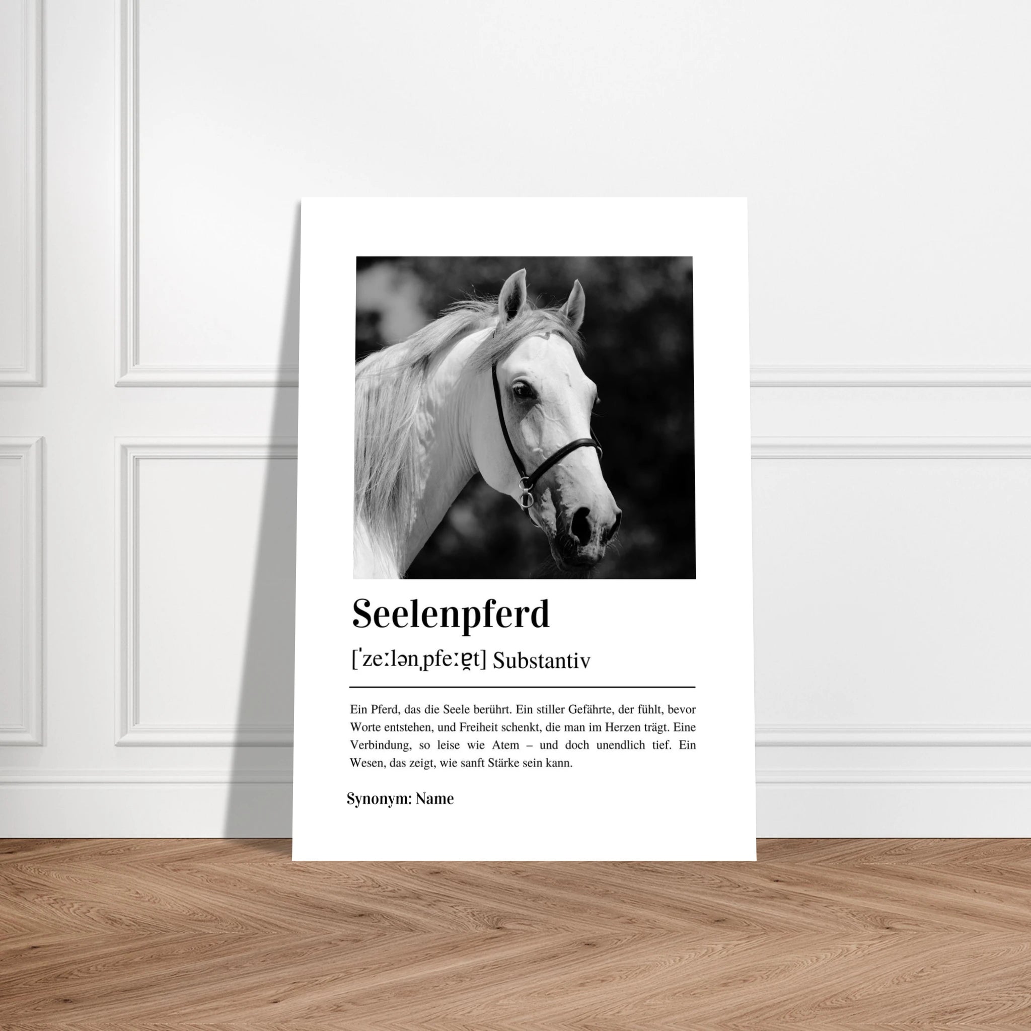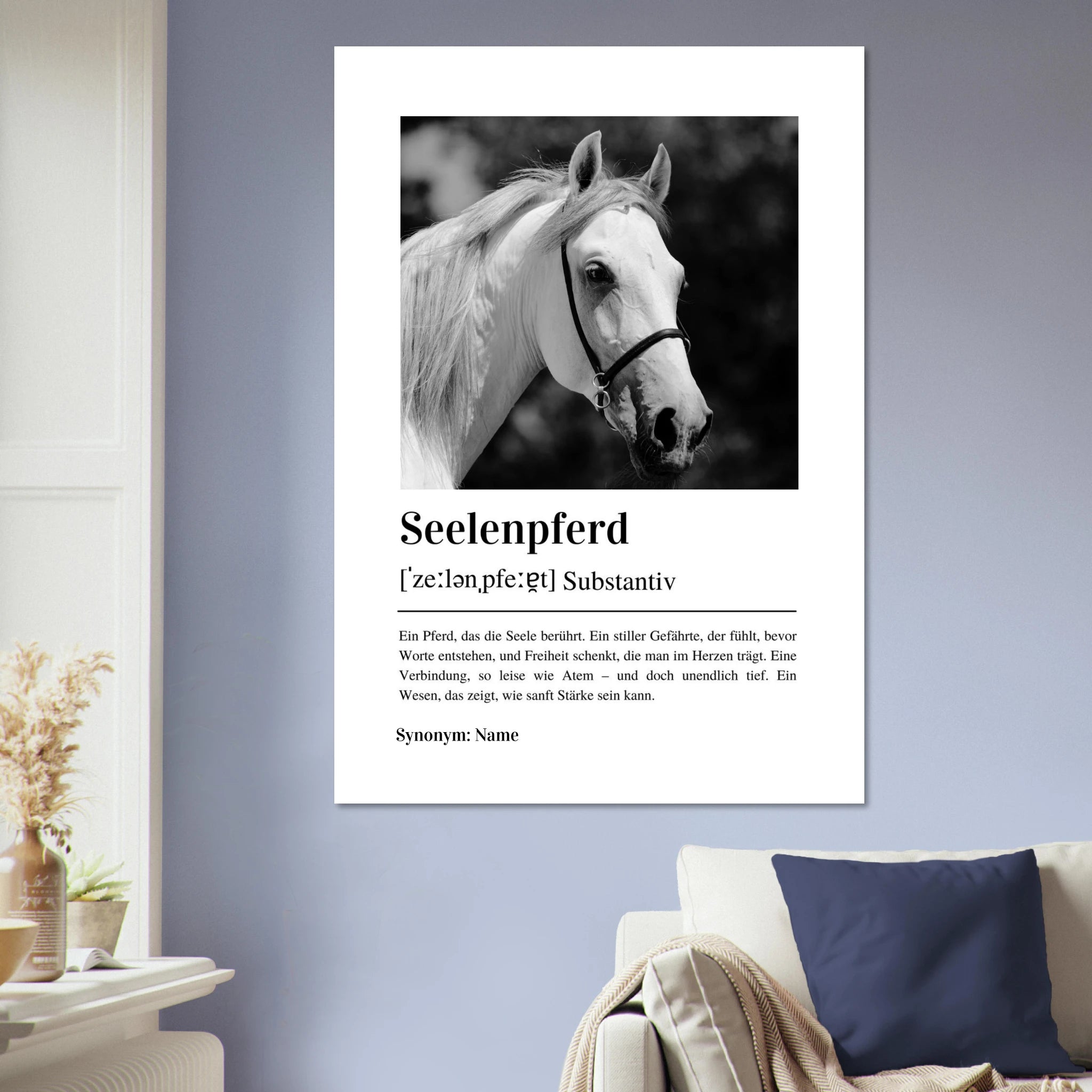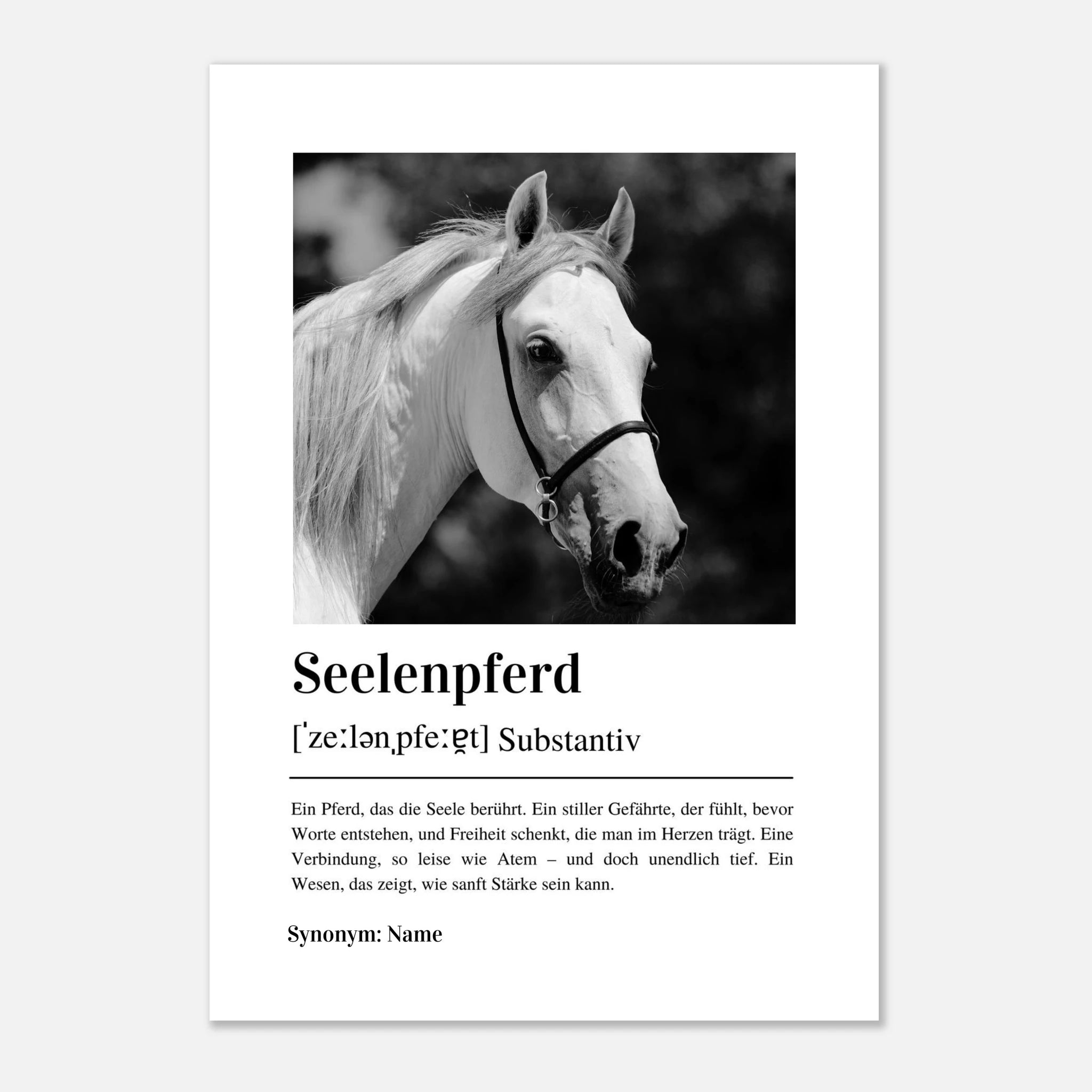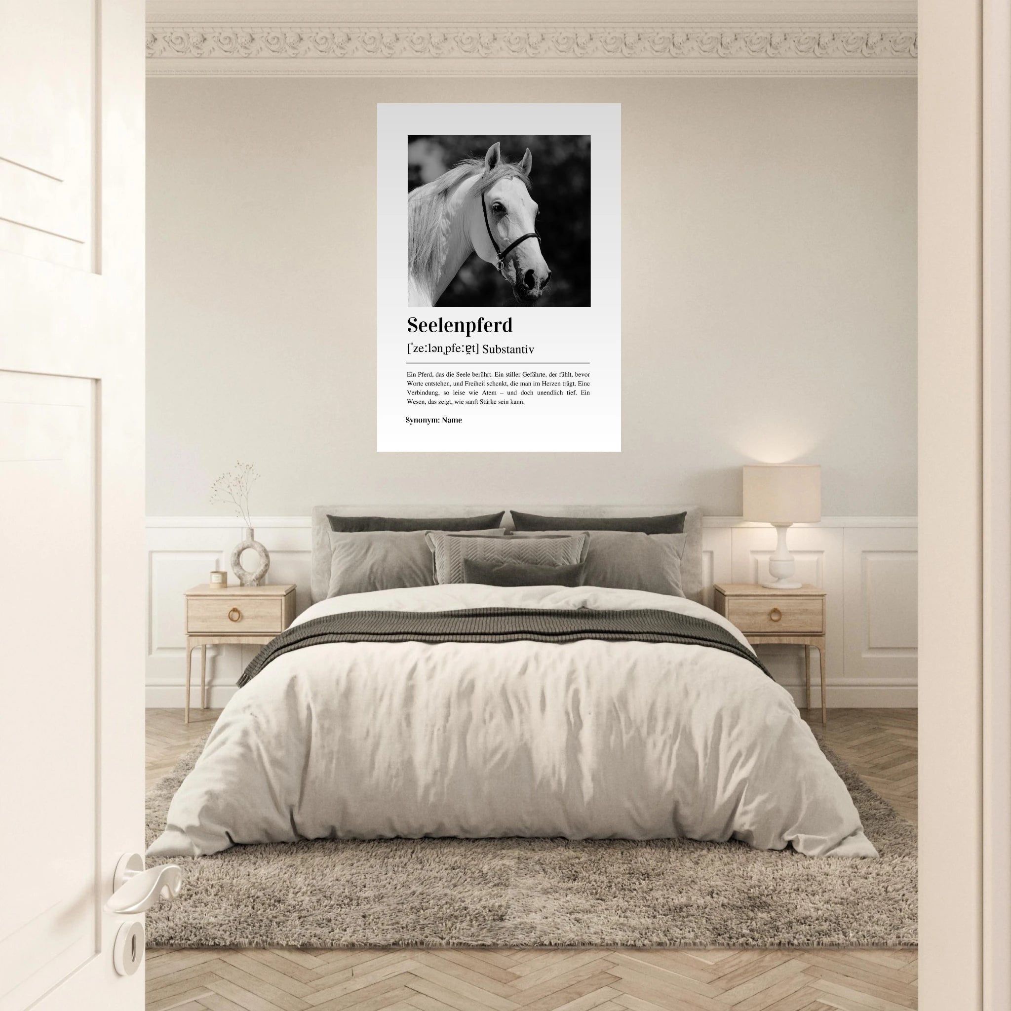 Gestalte Dein ganz persönliches Pferdeposter mit unserem Definitions-Poster Seelenpferd! Perfekt für Tierliebhaber, die ihrem liebsten tierischen Begleiter eine besondere Ehre erweisen möchten.