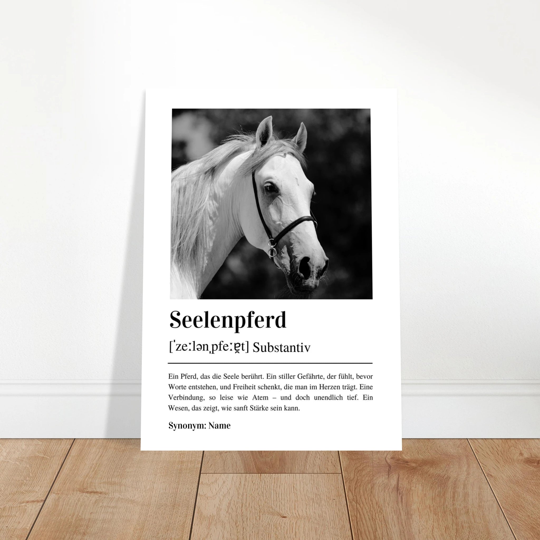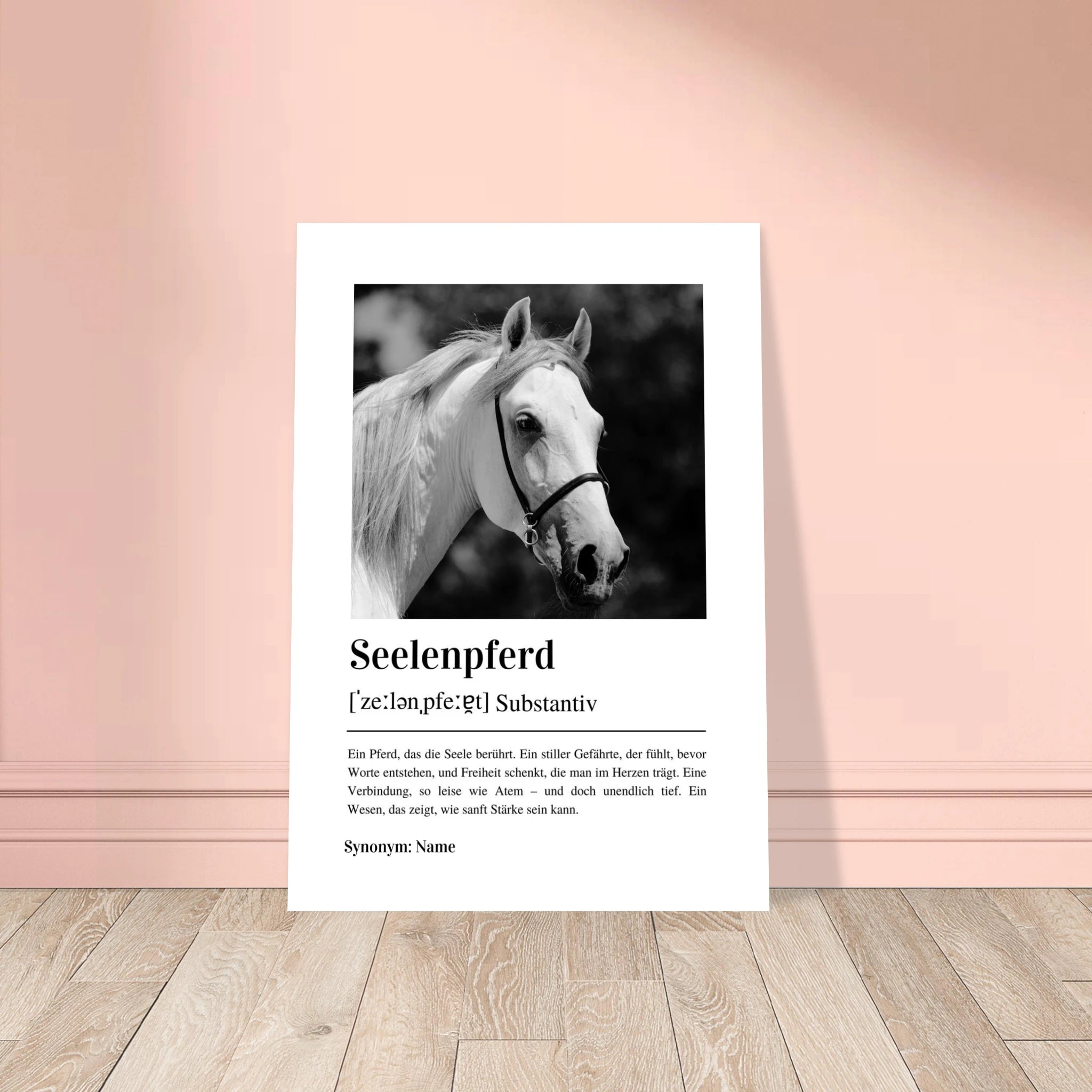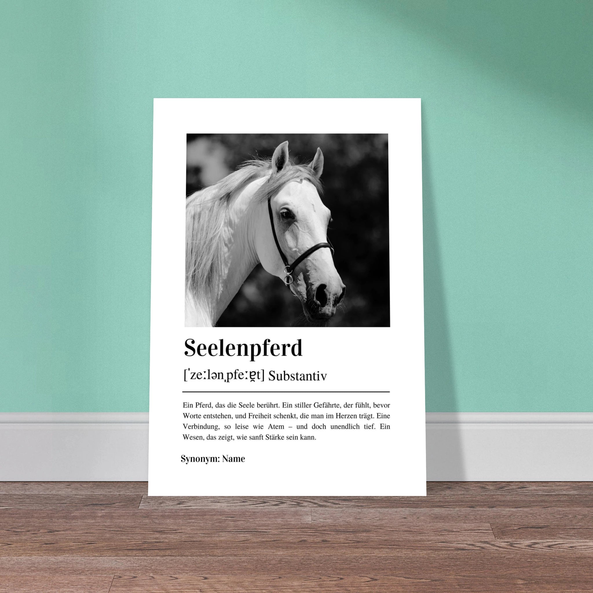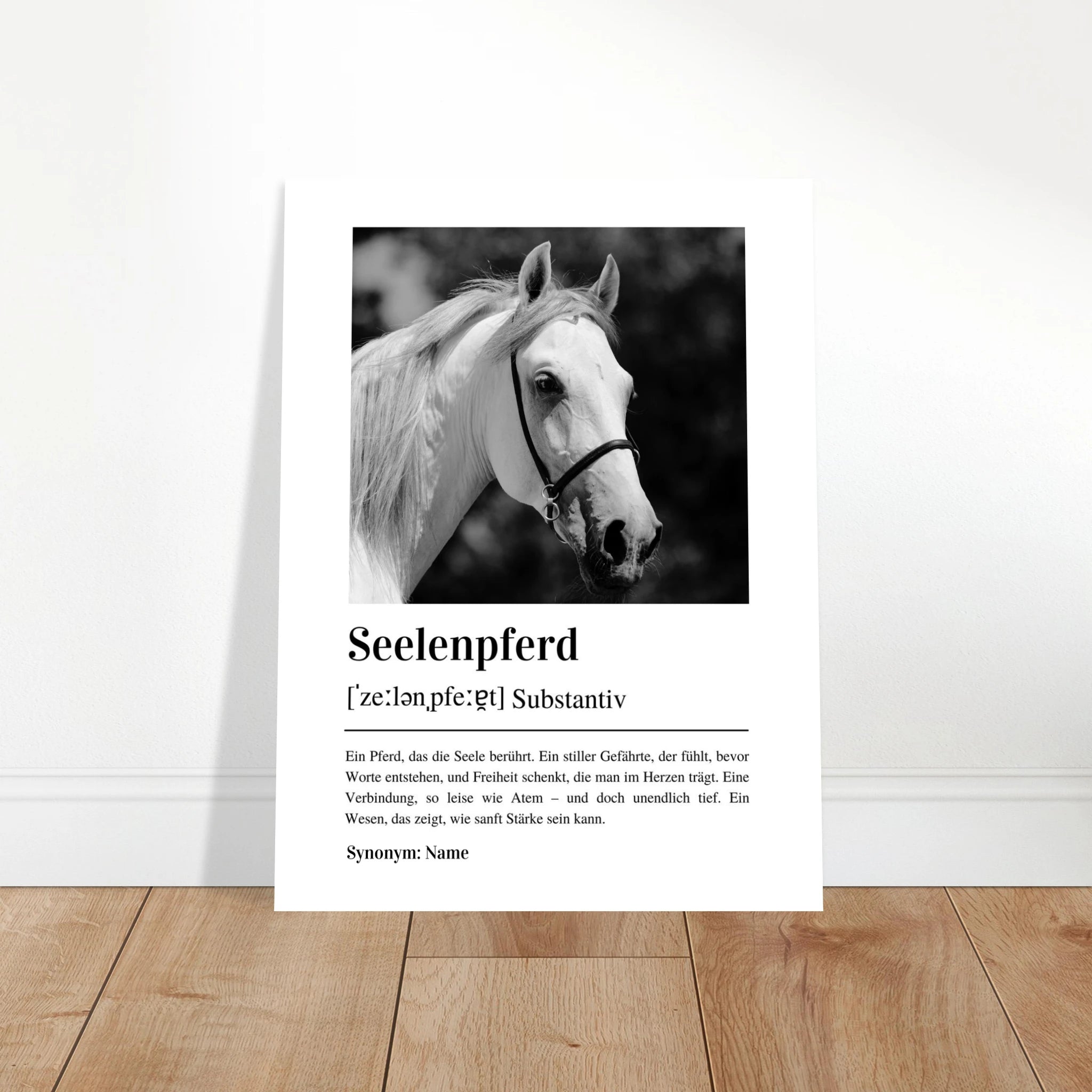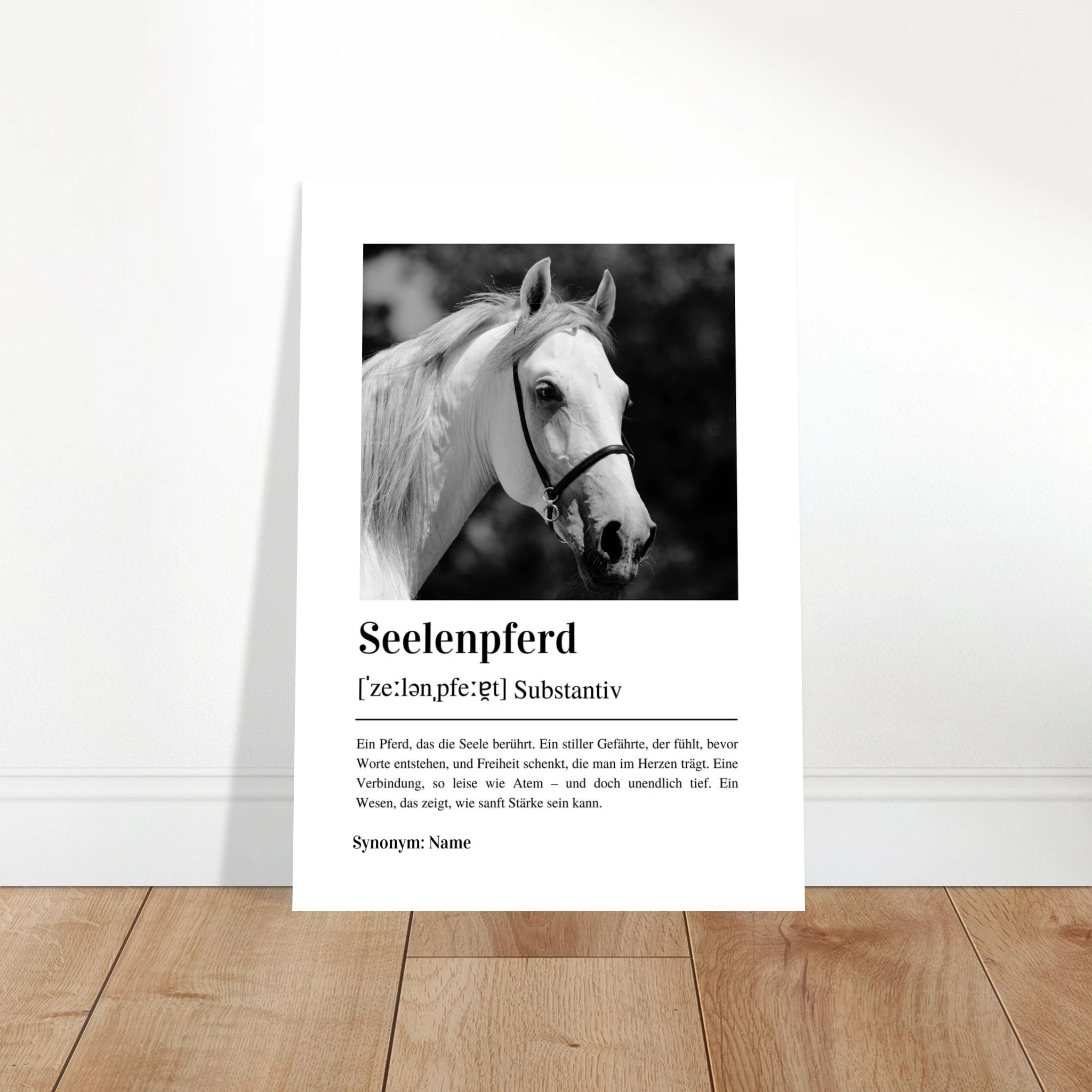 Gestalte Dein ganz persönliches Pferdeposter mit unserem Definitions-Poster Seelenpferd! Perfekt für Tierliebhaber, die ihrem liebsten tierischen Begleiter eine besondere Ehre erweisen möchten.