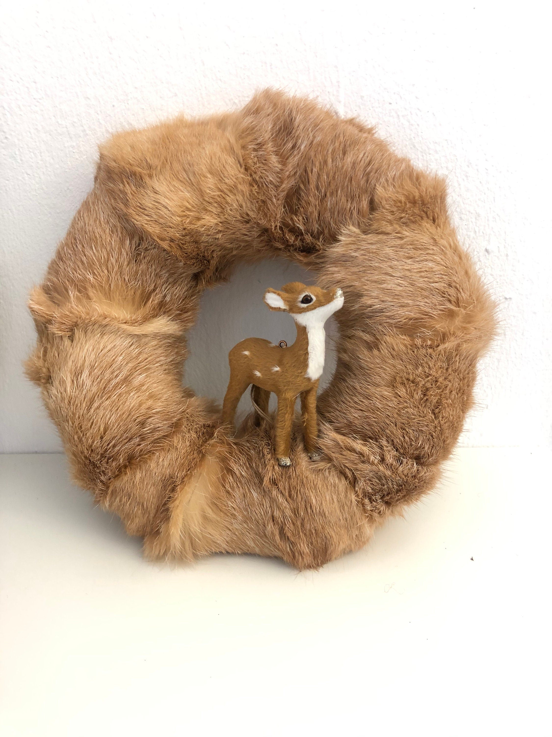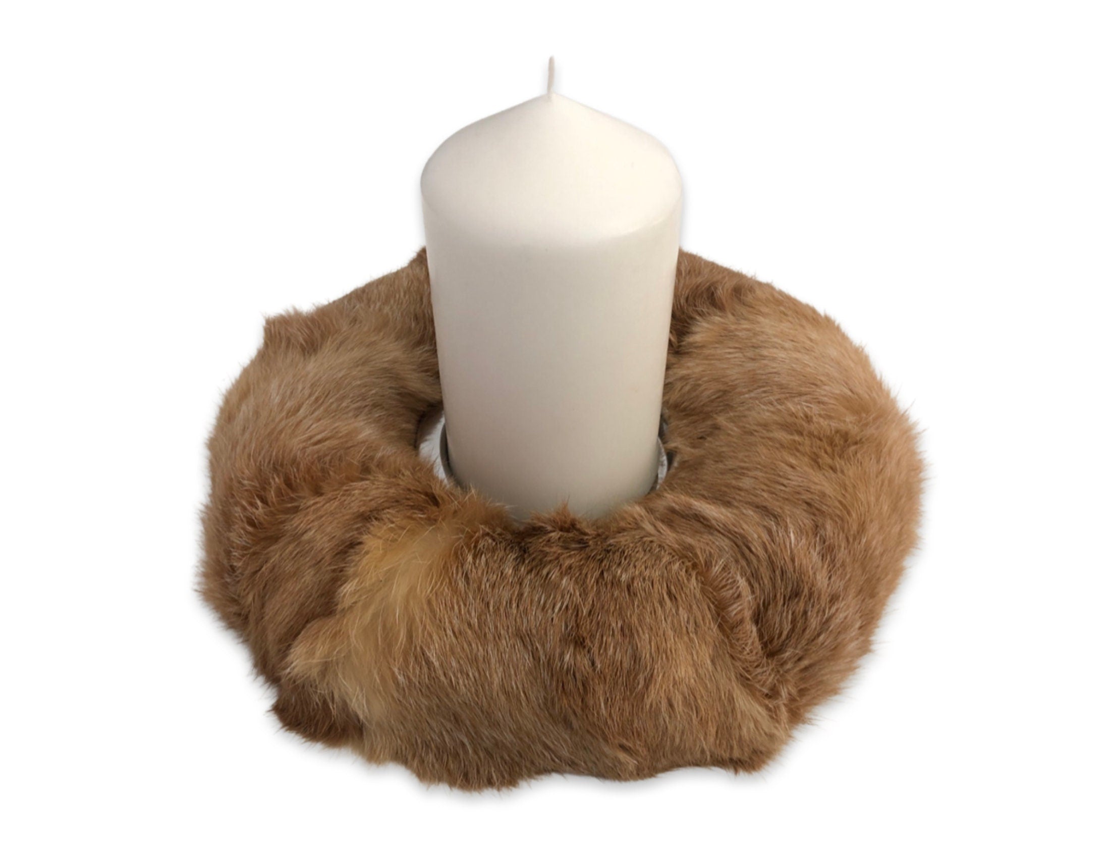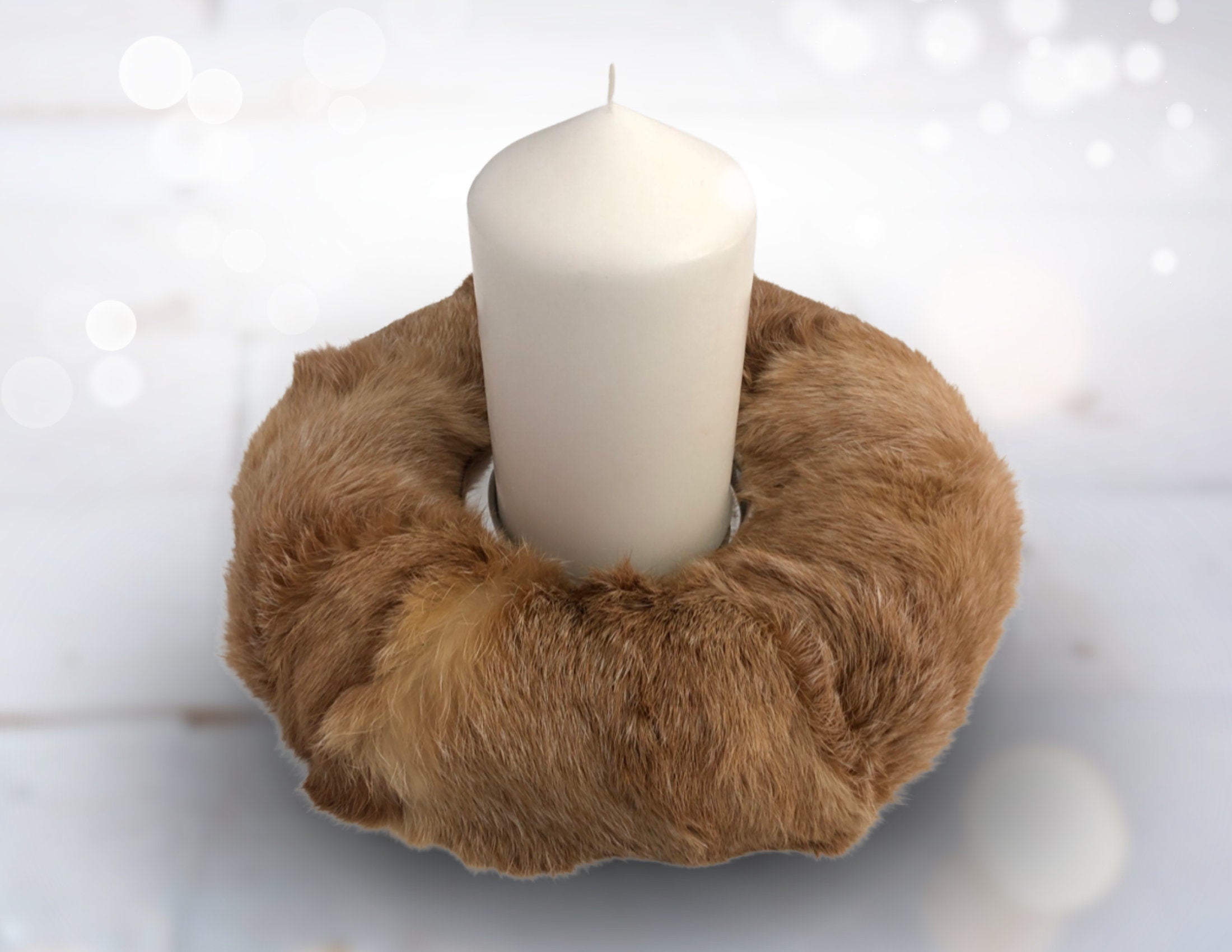 Edler Kranz aus echtem Fell (Kaninchen) in einem schönen Fuchston. Der handgemachte Kranz hat einen Durchmesser von ca. 22 cm/ mit Fell ca. 25 cm. Er kann aufrecht an der Wand aufgestellt werden (allerdings nicht am Fenster aufgehängt, da die Unterseite nicht mit Fell überzogen ist) oder als Kranz auf den Tisch gelegt werden. Zahlreiche Deko-Ideen sind möglich, so z.B. ein Windlicht (zylindrische Vase) in der Mitte oder zu Weihnachten dekoriert mit Rentier & Co.