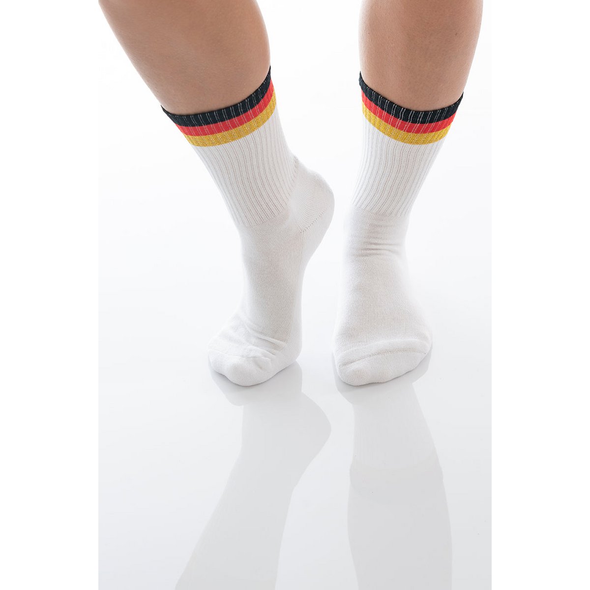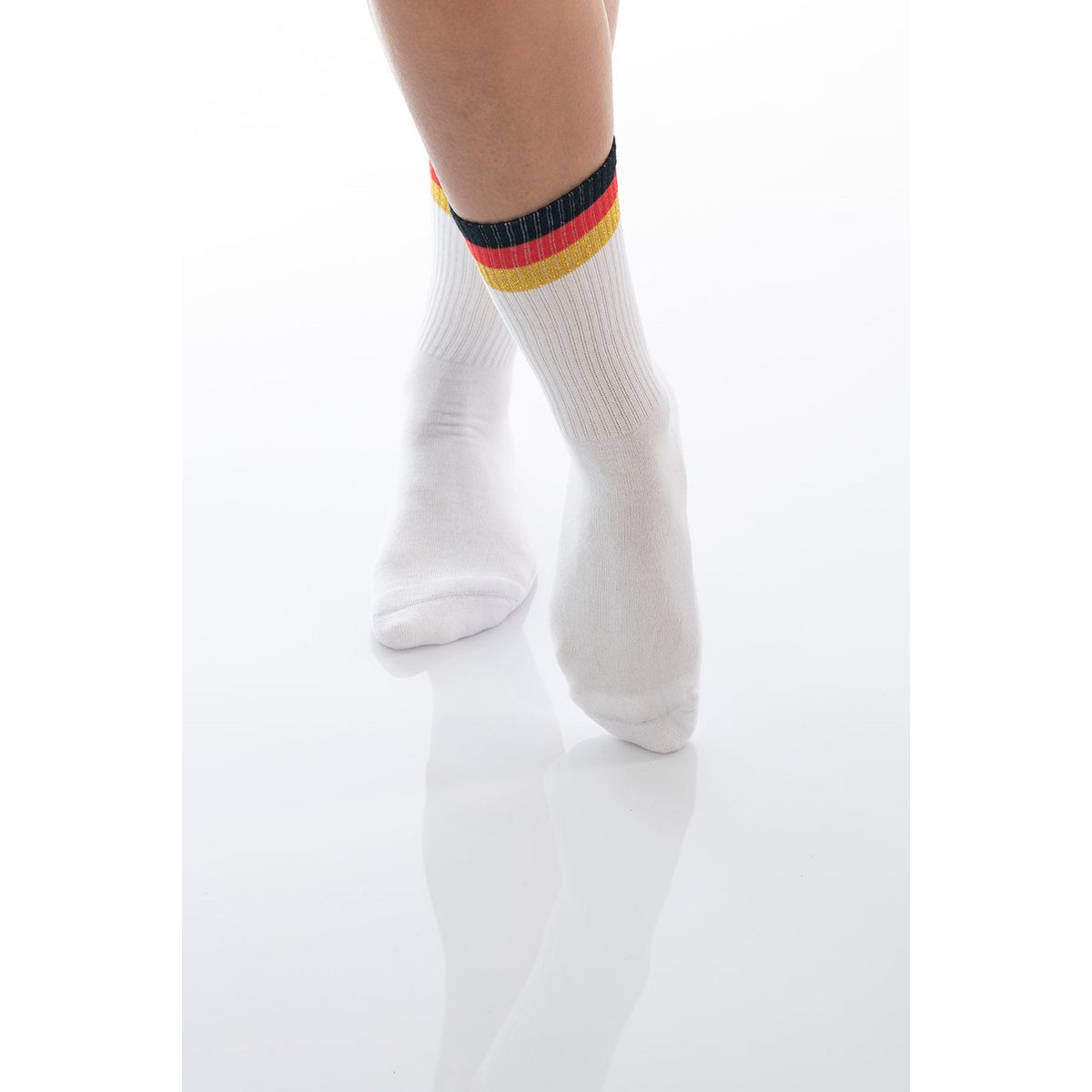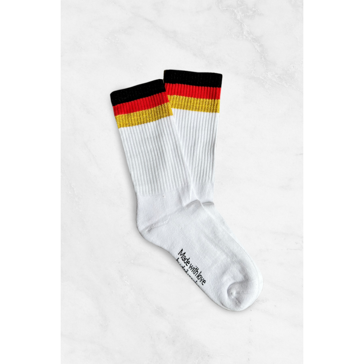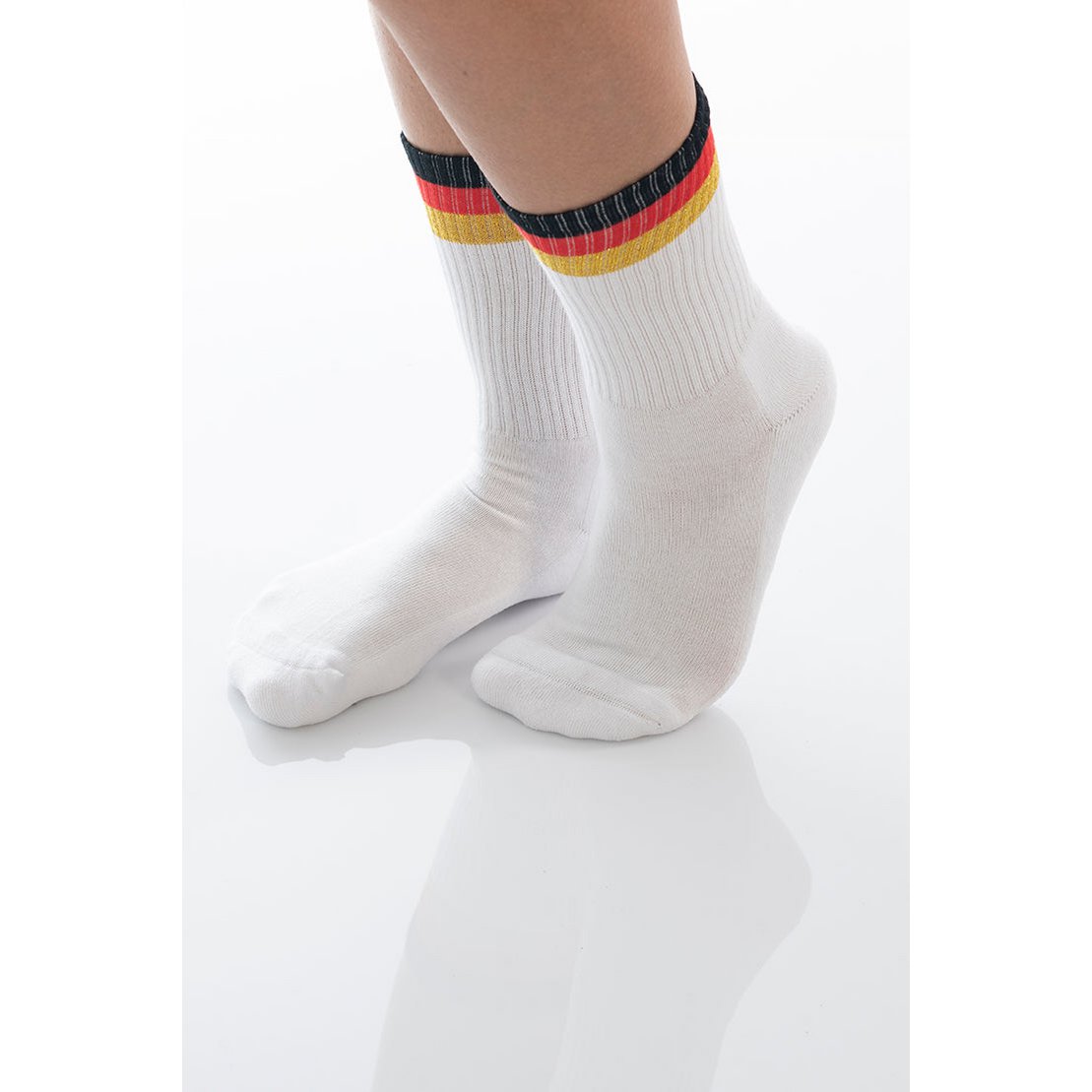 Diese hübsche Fansocke mit dezentem Glitzer im Bündchen begleitet dich durch die Fußball Spiele der deutschen Nationalmannschaft. Materialzusammensetzung: 80% Bio-Baumwolle, 17% recyceltes Polyester, 3% Elasthan
