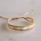 Dieses Perlengeflecht-Armband in der Farbe Weiß/Champagner kombiniert mit Gold hat einen Schiebeknoten und ist somit verstellbar.