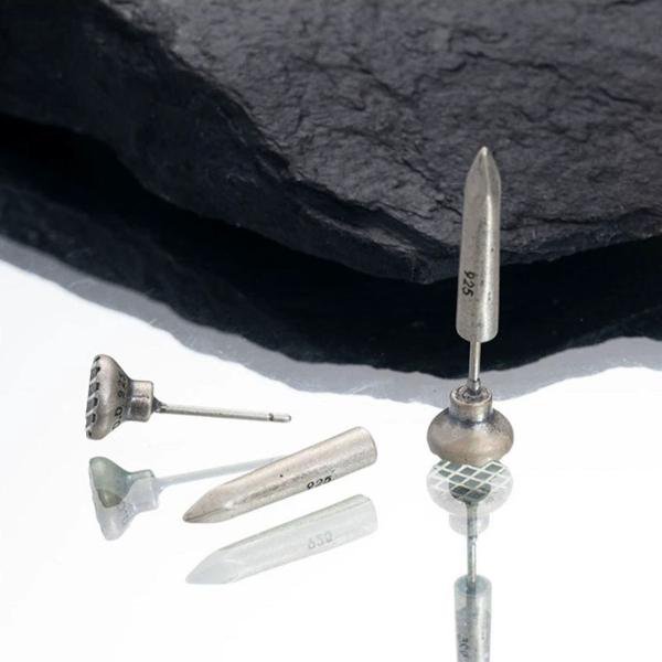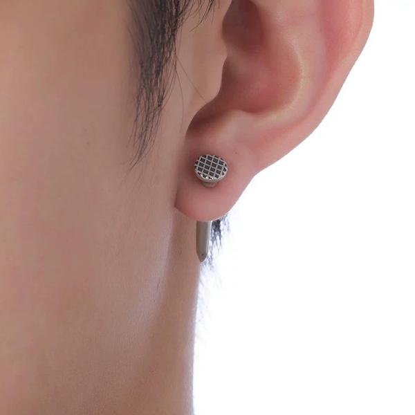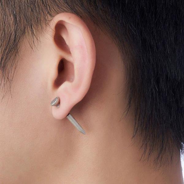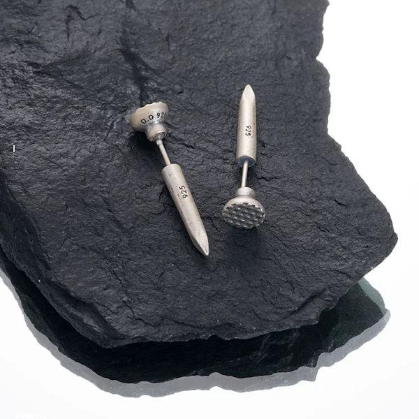 Dieser Ohrring ist ein Einzelstück, das als Nagel am Ohr getragen werden kann. Es wurde speziell für Herren entwickelt und besteht aus zwei integralen Teilen: dem vorderen Bolzen, der dem Kopf eines Nagels ähnelt, während das hintere Teil den länglichen Körper des Nagels darstellt. Die Nadel besteht aus 925er Silber und der Körper des Nagels ist geformt aus Messing und mit einer Vintage-Versilberung verziert, die ein Gefühl von zeitlosem Charme hervorruft. Die kompakten Abmessungen von 3 x 0,3 cm machen diesen Ohrring zur idealen Wahl für alle, die ein dezentes und dennoch mutiges Statement-Stück suchen.