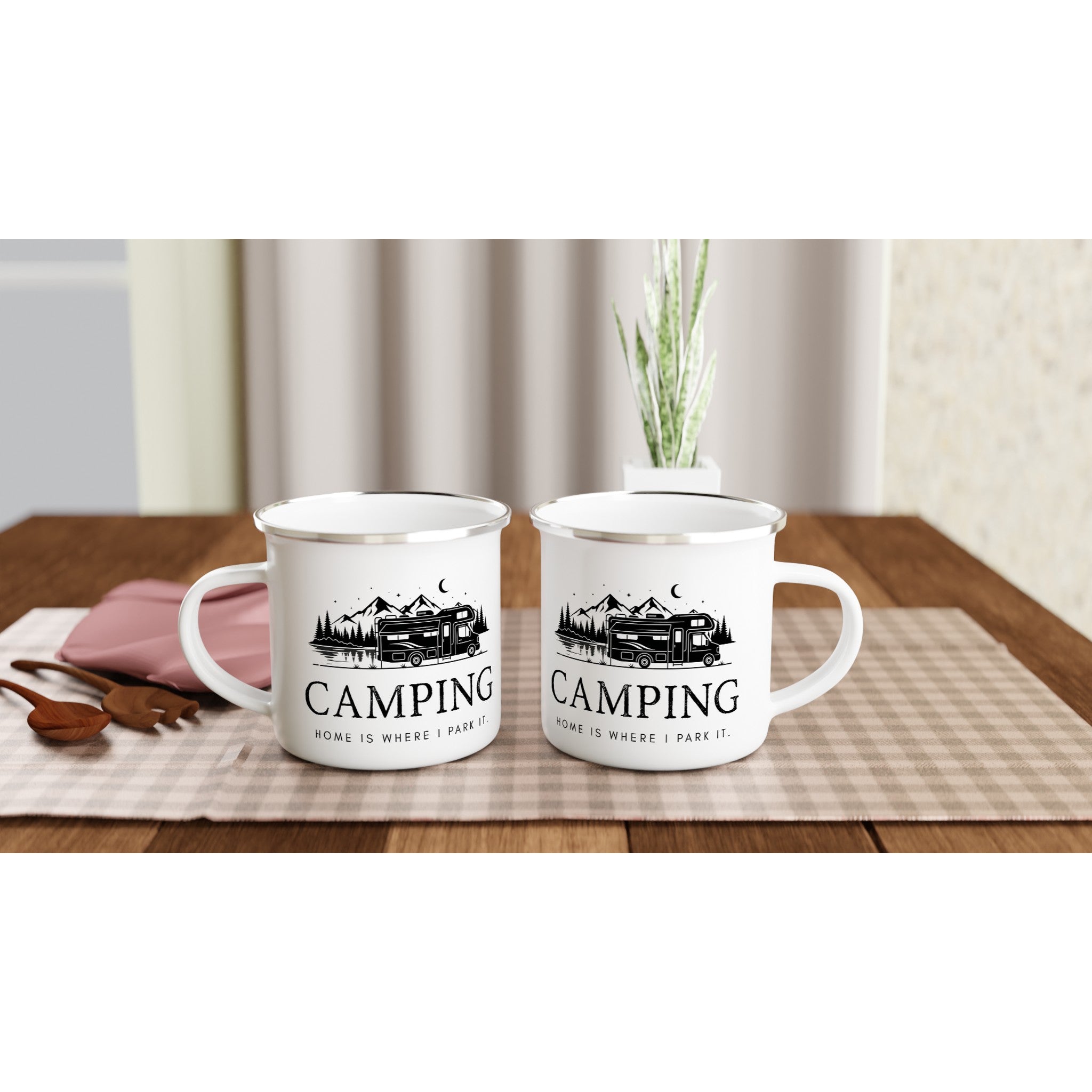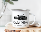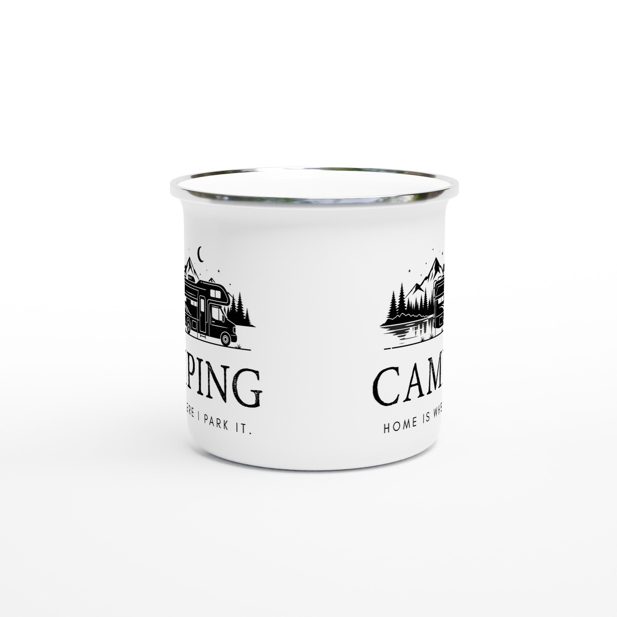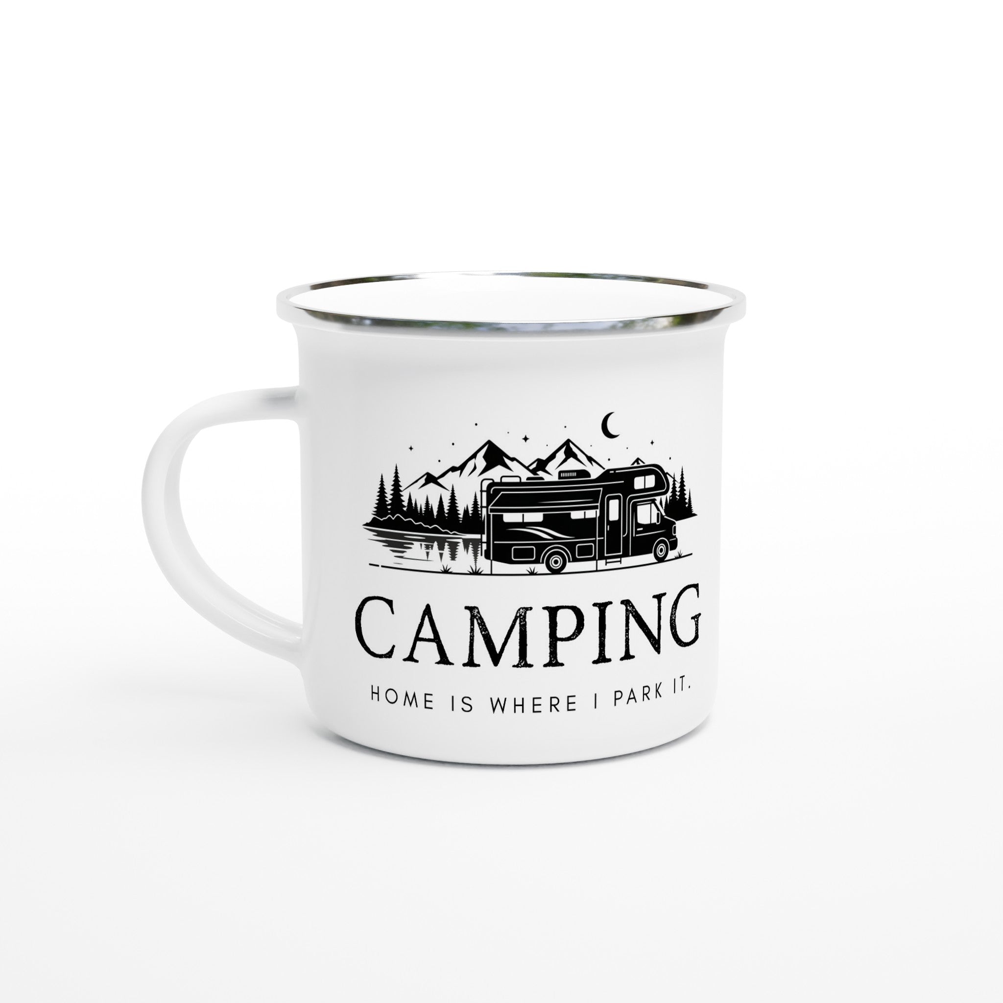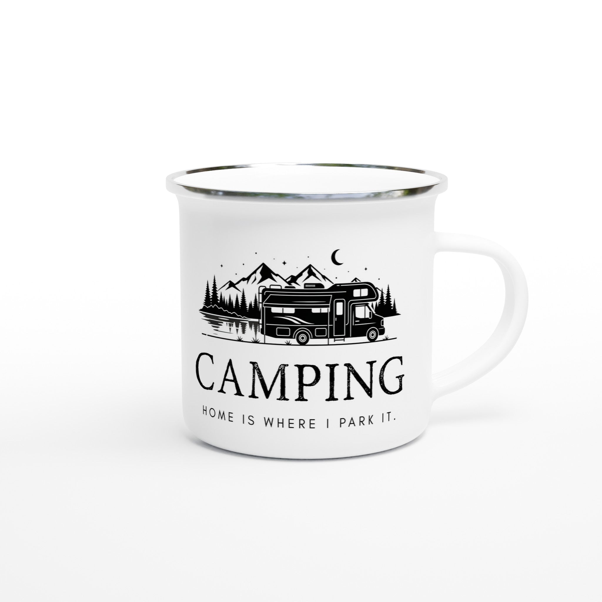 Camping Emaille Tasse "Home is where I park it" – Bruchsicher | Geschenk für Camper