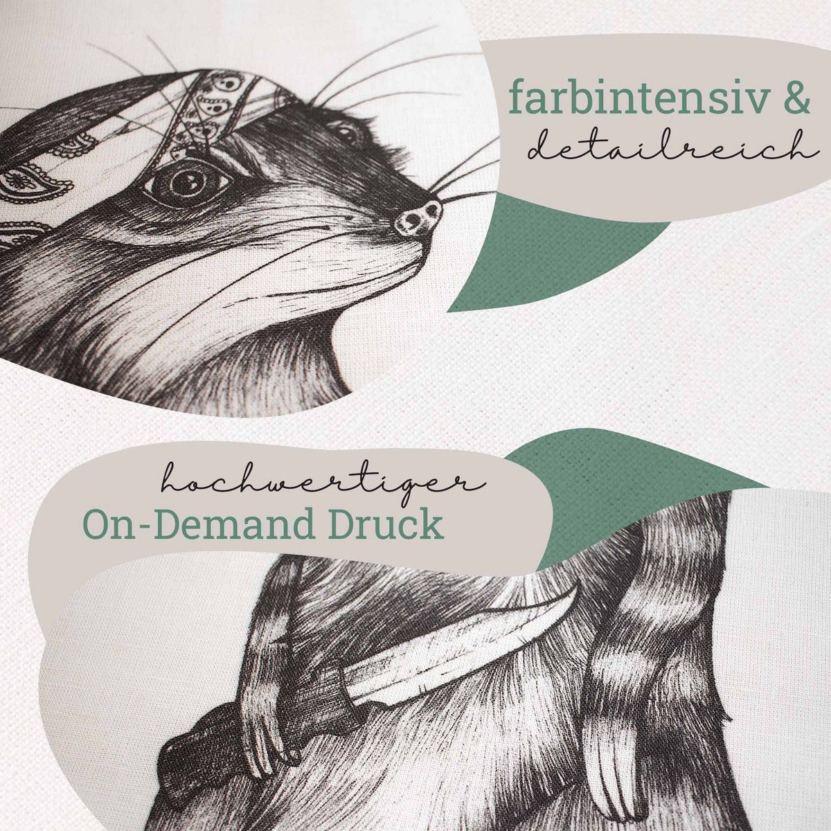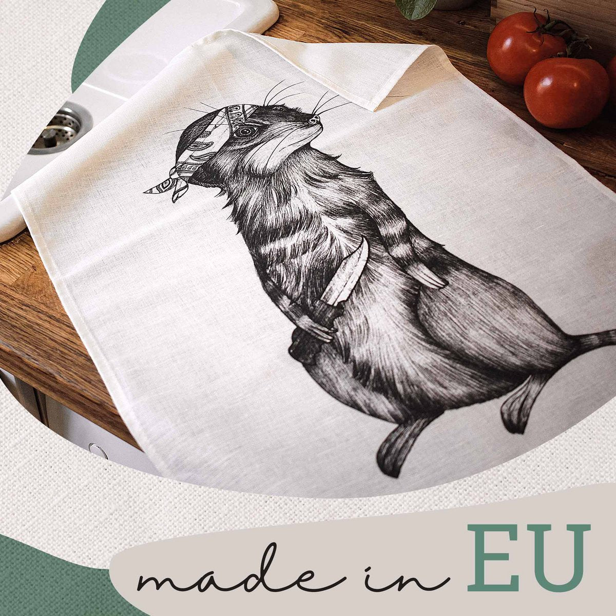 Art Up your Küchenzeile: Geschirrtuch mit Erdmännchen "Toni Knife"Produktinformationen:• strapazierfähiges Küchenhandtuch aus Halbleinen (55 % Leinen / 45 % Baumwolle)• in der EU produziert und lokal in Wuppertal für dich bedruckt• Größe: 70 x 50 cm• Der einseitige Druck ist hochwertig und farbintensiv• bei bis zu 60 Grad waschbar• zertifiziert mit dem ÖKO-TEX® Standard 100• Green Energy ProduktionAlles in trockenen Tüchern: Unsere schönen Geschirrtücher sind nicht nur robust, sondern auch noch nachhaltig. Der Druck ist hochwertig und hält Wäschen bei bis zu 60 Grad stand. Und das handgemalte Motiv unserer Künstlerin Hanna Ligeti sorgt dafür, dass dein neues Küchenhandtuch selbst beim Abhängen und Trocknen noch eine gute Figur macht. Sauber!