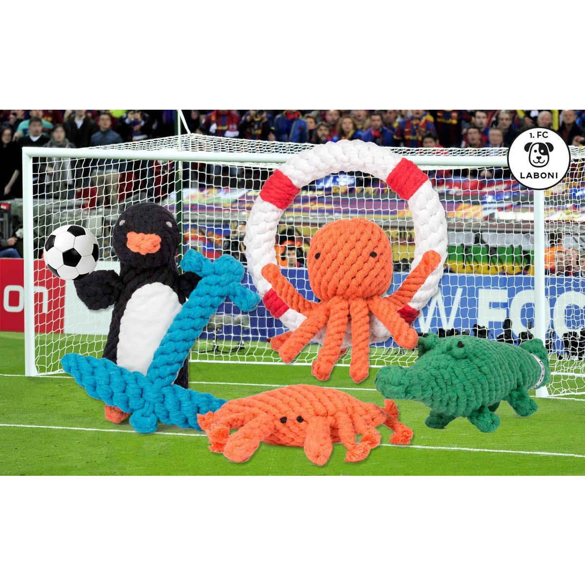 Poldi Pinguin - Kult-Spielzeug für Hunde Robustes Hundespielzeug aus zahnpflegendem Baumwolltau Poldi Pinguin ist eine feste Grösse beim 1. FC LABONI und ist bekannt für seine enorme Schusskraft mit der er sich mühelos in jedes Hundeherz katapultiert, nicht zuletzt durch seine besonderen Qualitäten... Das Markenzeichen der Kölner Frohnatur ist ein schwarzer Frack, den er sportlich-elegant über seinem Trikot mit der Rückennummer 10 trägt. Unser „Kölsche Jung“ ist immer für ein Spässchen bereit und freut sich auf ein spannendes Knabber-Match mit Ihrem Vierbeiner, bei dem die natürlichen Baumwollfasern ganz spielerisch die Zähne Ihres Lieblings reinigen. Durch seine Größe und Form ist das handgeknüpfte Baumwoll-Spielzeug auch ideal geeignet für Wurf- und Apportierspiele mit Junghunden und grösseren Rassen. Wie alle LABONI TOYS ist auch Poldi maschinenwaschbar bei 30 °C und vom TÜV Süd nach Kinderspielzeugrichtlinie geprüft. Ein toller Begleiter, an dem Ihr Hund lange Freude haben wird! Vorteile Gesundheitsfördernd & sicher reinigt die Zähne auf spielerische Weise befriedigt das Kaubedürfnis aus reiner Baumwolle, mit Naturfarben eingefärbt für Kau-, Wurf- und Apportierspiele Manufaktur statt Massenware robust gefertigt in aufwendiger Handarbeit die TOYS sind nicht unzerstörbar, sondern dafür gefertigt, zerkaut zu werden Pflegeleicht & hygienisch waschbar bei 30 Grad Geprüfte Qualität & mehrfach prämiertes Design TÜV Süd geprüftes Spielvergnügen IDA International Design Awards Winner nachhaltig & recyclebar Eigenschaften Grössen: 13x8x20 cm Material: reine Baumwolle mit Naturfarben eingefärbt Pflegehinweis: maschinenwaschbar bei 30°C Hinweis: Unsere Kollektionen werden von Hand gefertigt und bestehen aus Naturmaterialien, daher sind Abweichungen in Farbe, Struktur und Grösse möglich. Dies macht den individuellen Charme unserer Designprodukte aus. Bitte haben Sie Verständnis, dass die Angaben und Bilder auf unserer Webseite deshalb nicht immer exakt das von Ihnen gewählte Produkt widergeben können. Pressestimmen R2M One Rolls-Royce Magazine: Wenn man eine Weile in die wunderbare Welt von LABONI eintaucht, will man zwei Dinge. Etwas kaufen. Und wenn nicht schon vorhanden – einen Hund. UPPER CLASS Magazine: LABONI bietet ein cleveres Sortiment an tierisch schönen und vor allem praktischen Essentials, die das Leben von Hunde-Fans mit ihren treuen Begleitern einfach noch besser machen! FEEL GOOD Magazine: Markenzeichen der unkonventionellen Schweizer Kreativschmiede sind Funktionalität, Design und höchster Komfort gepaart mit einem eleganten Sinn für Humor und einem besonderen Gespür dafür, was Hund und Halter wirklich Freude bereitet.