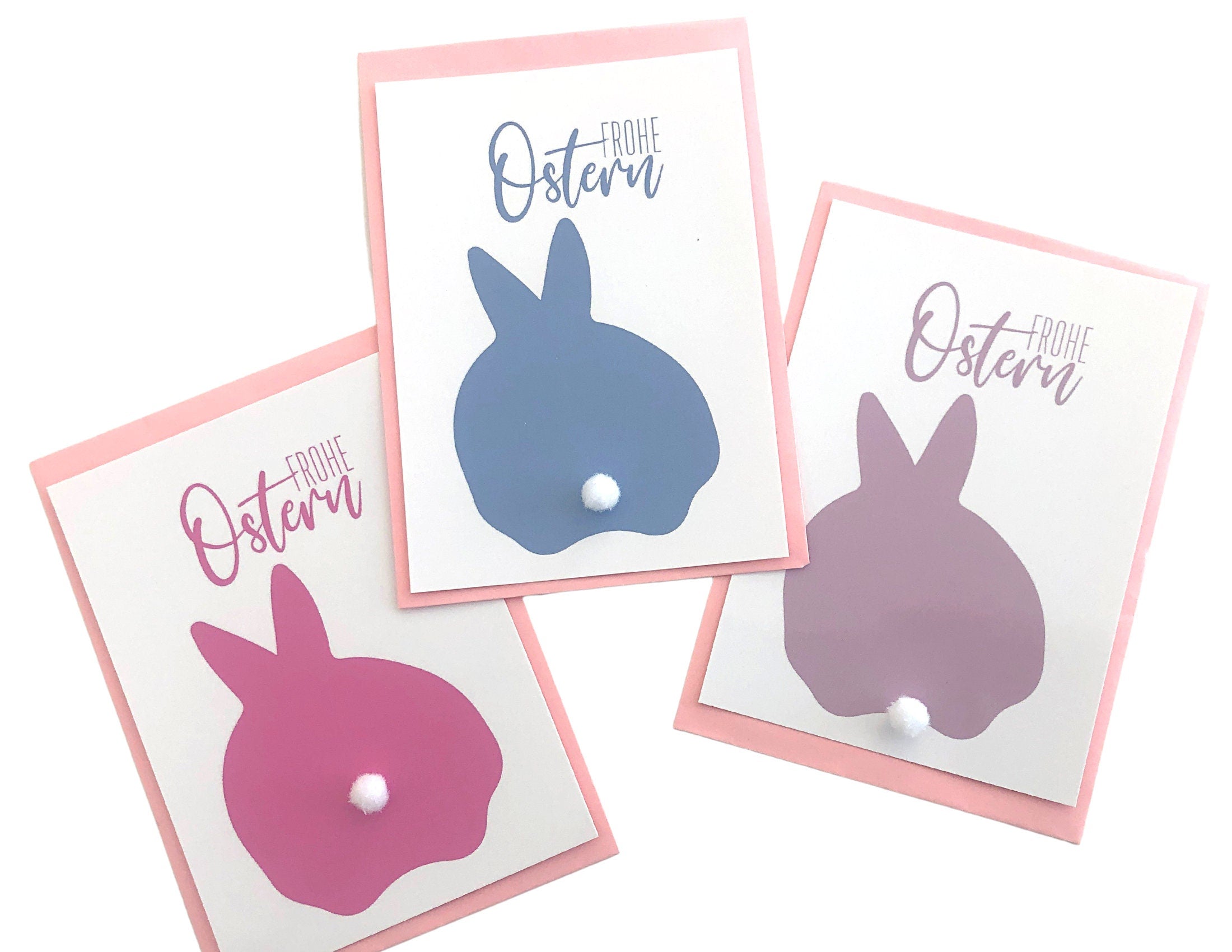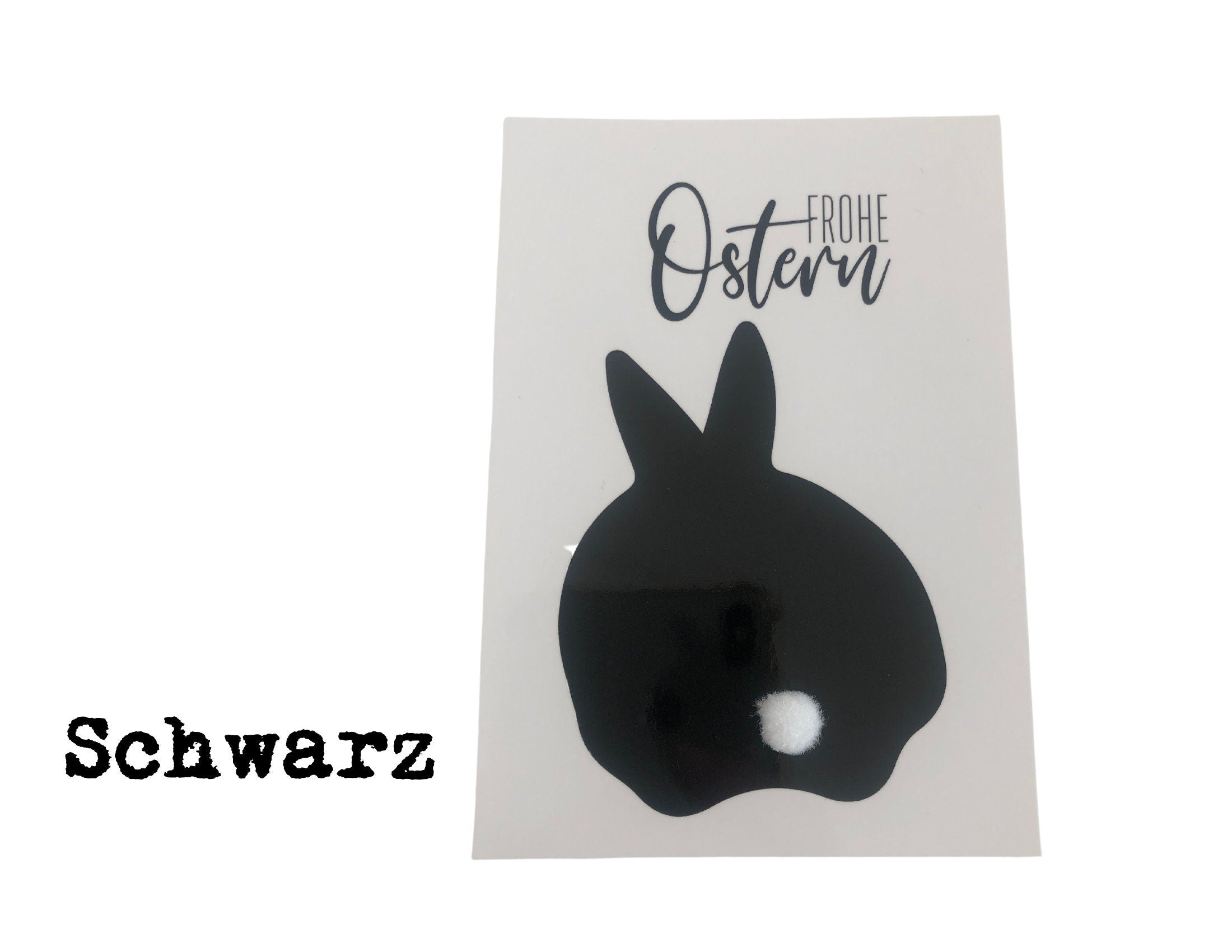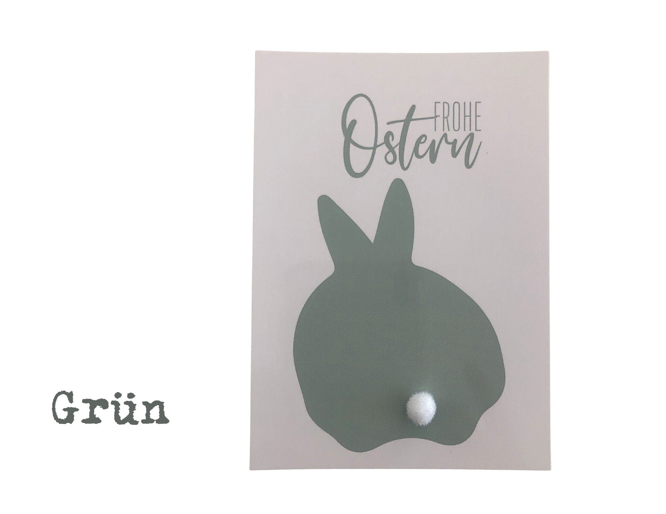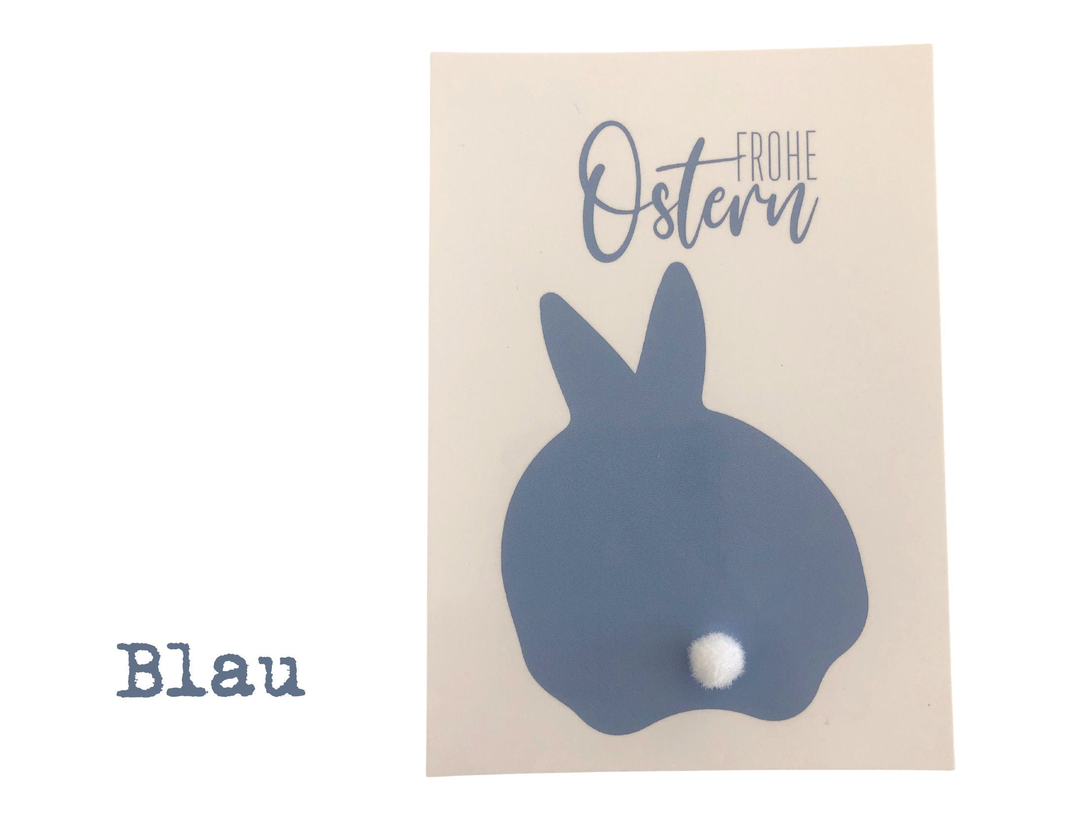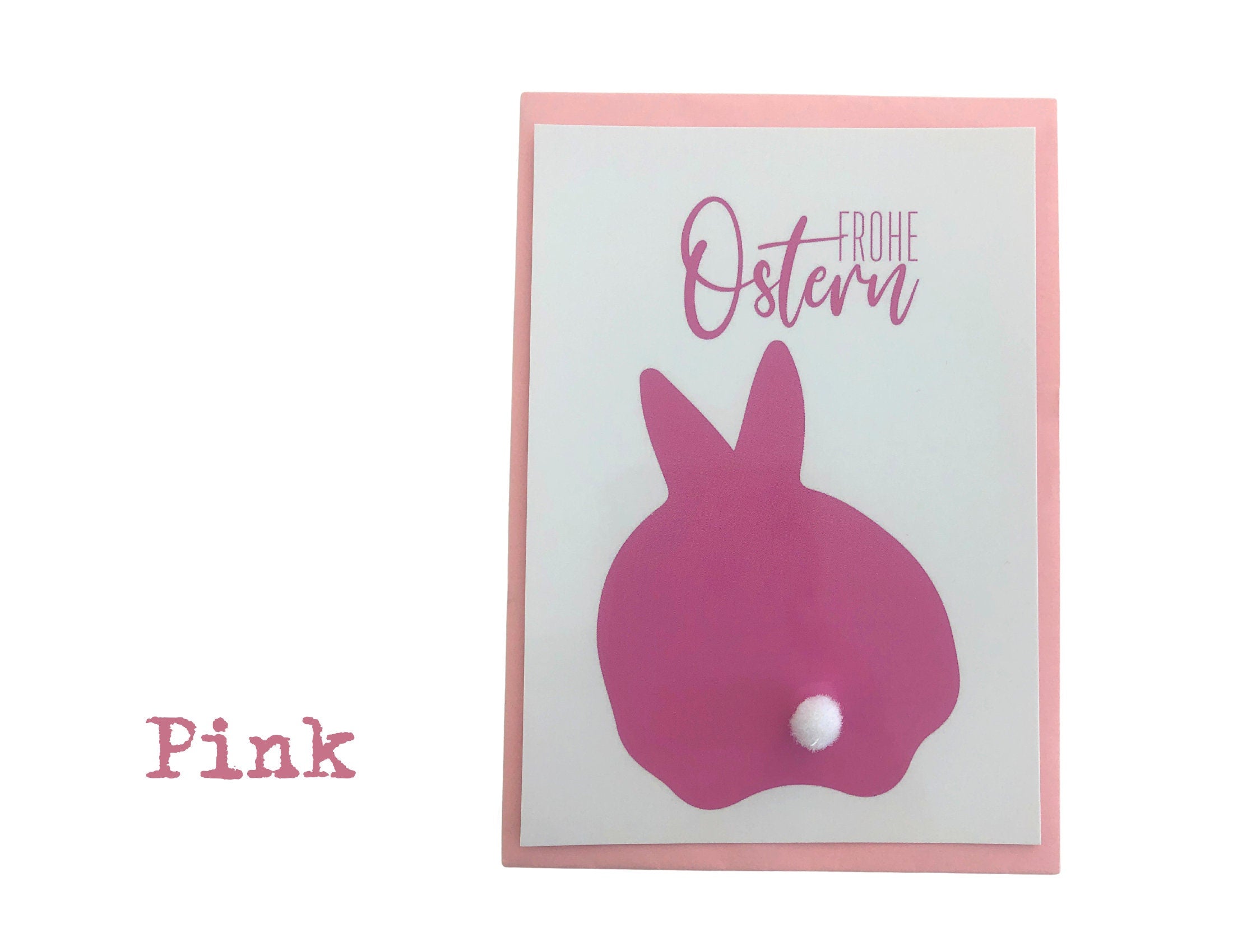 Die Karten gibt es in den Farben schwarz, grau, pink, mauve, blau und grün. Der Ostergruß "Frohe Ostern" ist jeweils in der passenden Farbe zum Häschen-Motiv. Bitte beim Kauf die Farbe wählen.