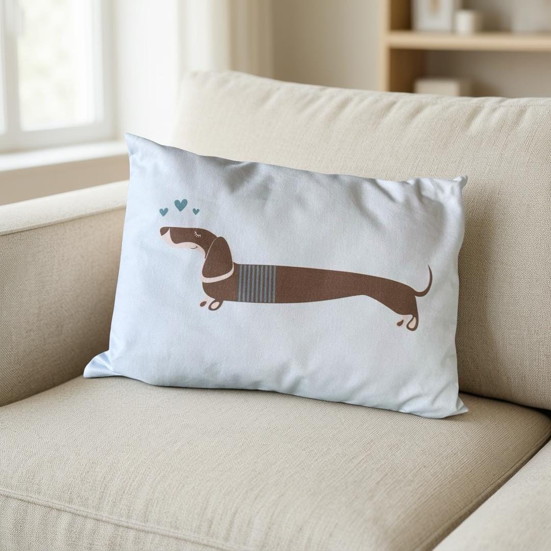Dackel-Fans aufgepasst - mit diesem süßen Dackeldesign kannst Du Deine Einrichtung im Dackellook gestalten - das Kissen im Format 50 x 35 cm mit einem angesagten Dackelmotiv lässt jedes Hundebesitzerherz höher schlagen. Es kommt komplett mit Füllung und ist aus einem weichen Baumwollstoff. Das rechteckiges Kissen mit Füllung ist aus 100 % Baumwolle und beidseitig bedruckt.
