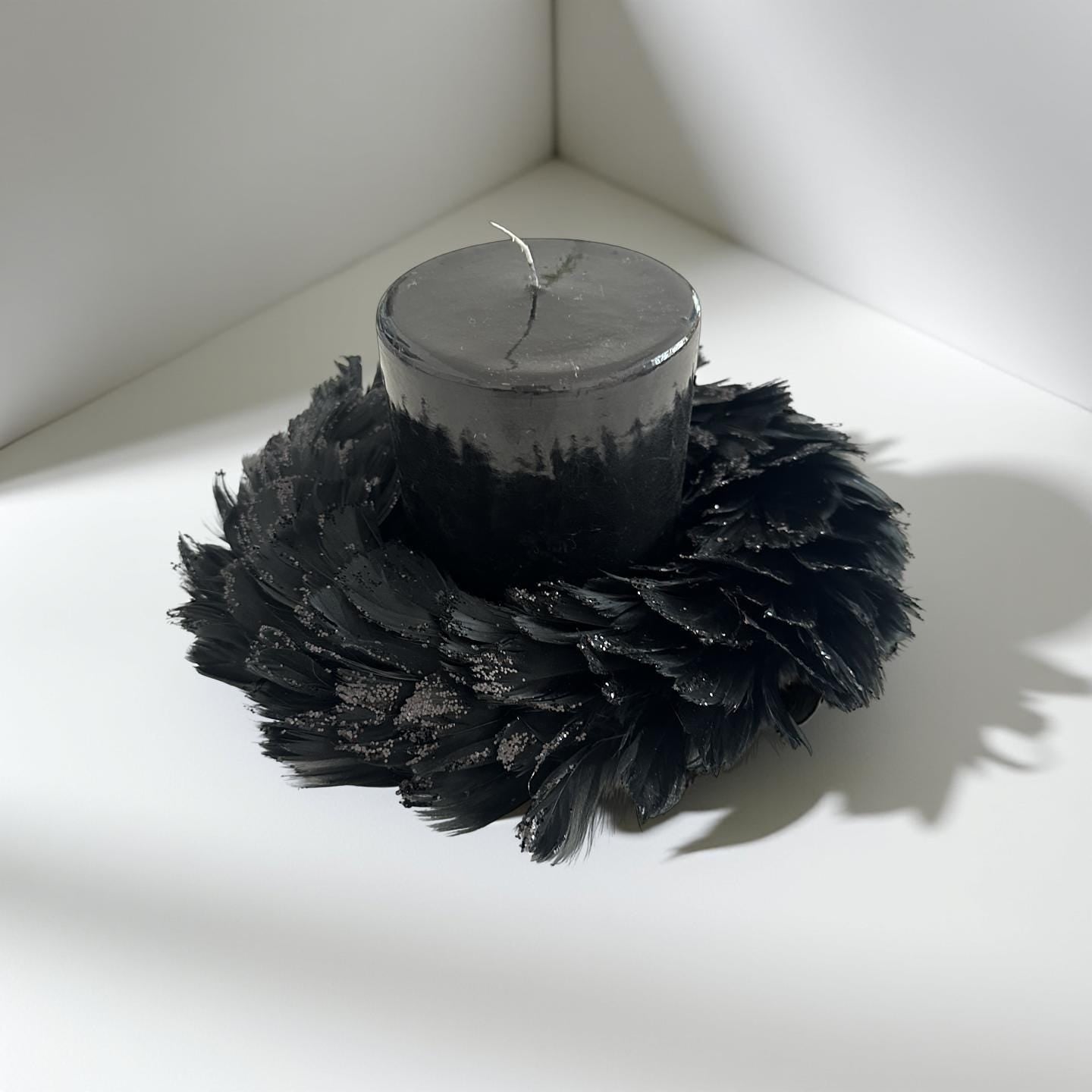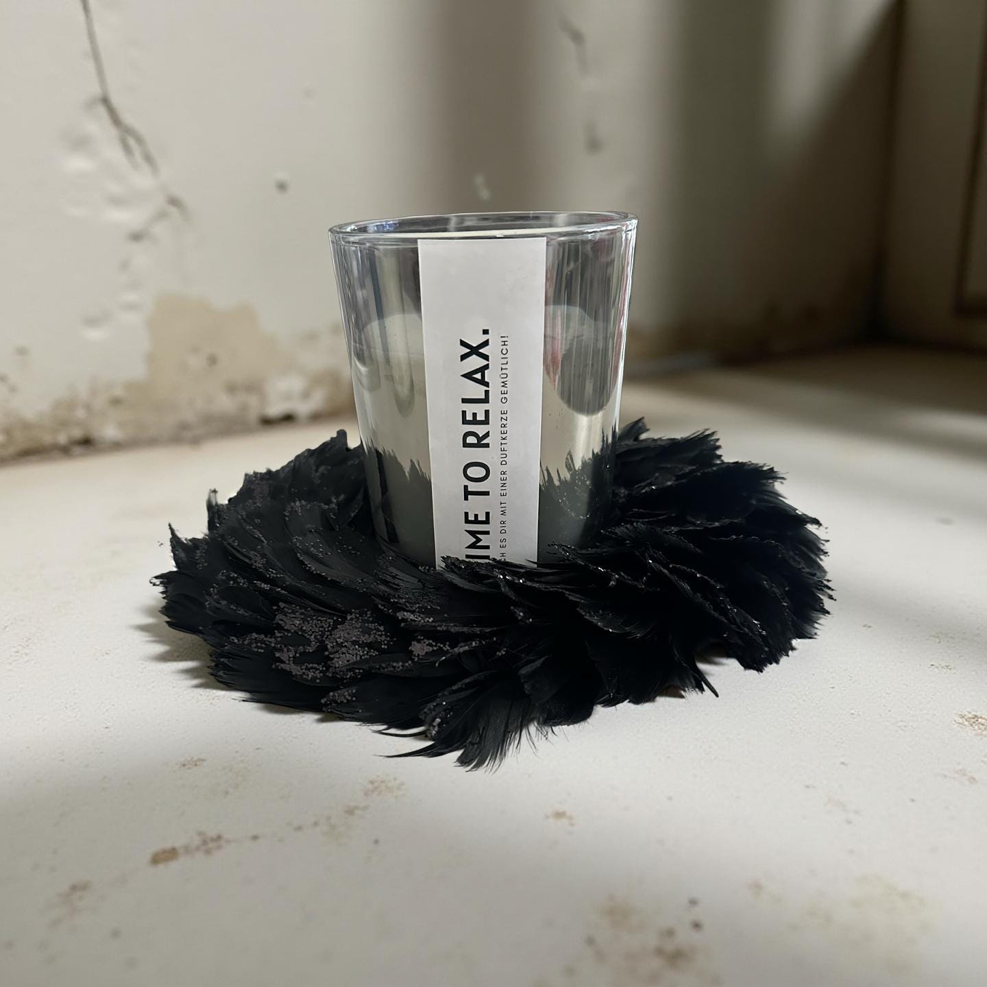 Edler Kranz aus schwarzen Federn mit Glitzer - eine perfekte Deko für den Tisch - ob zu Halloween oder Weihnachten! Er hat einen Durchmesser von ca. 20 cm (plus etwas mehr durch die Federn), und lässt sich vielseitig dekorieren: nutze ihn zum Beispiel als Kerzenkranz. Der innere Durchmesser passt für Stumpenkerzen oder Kerzen im Glas.