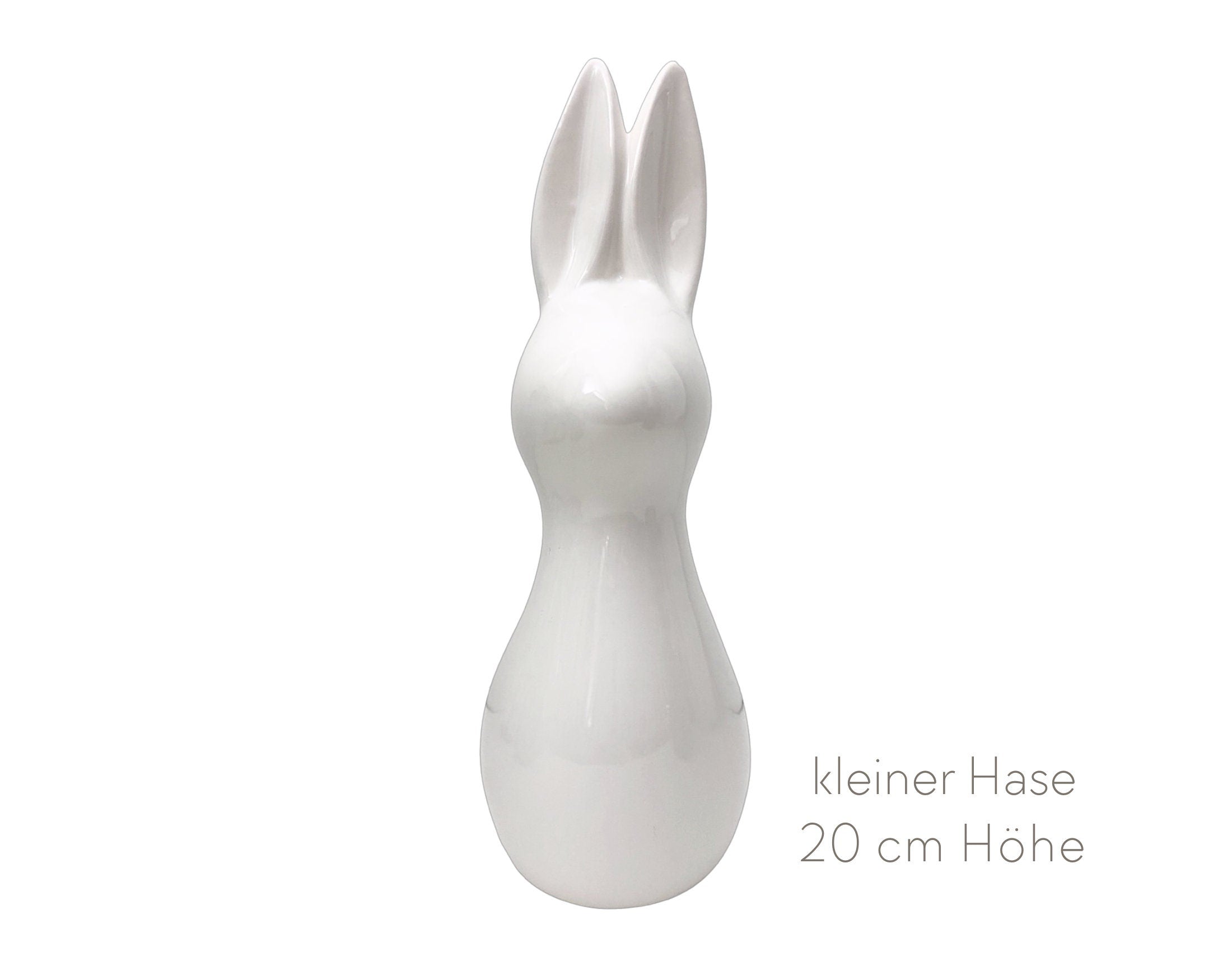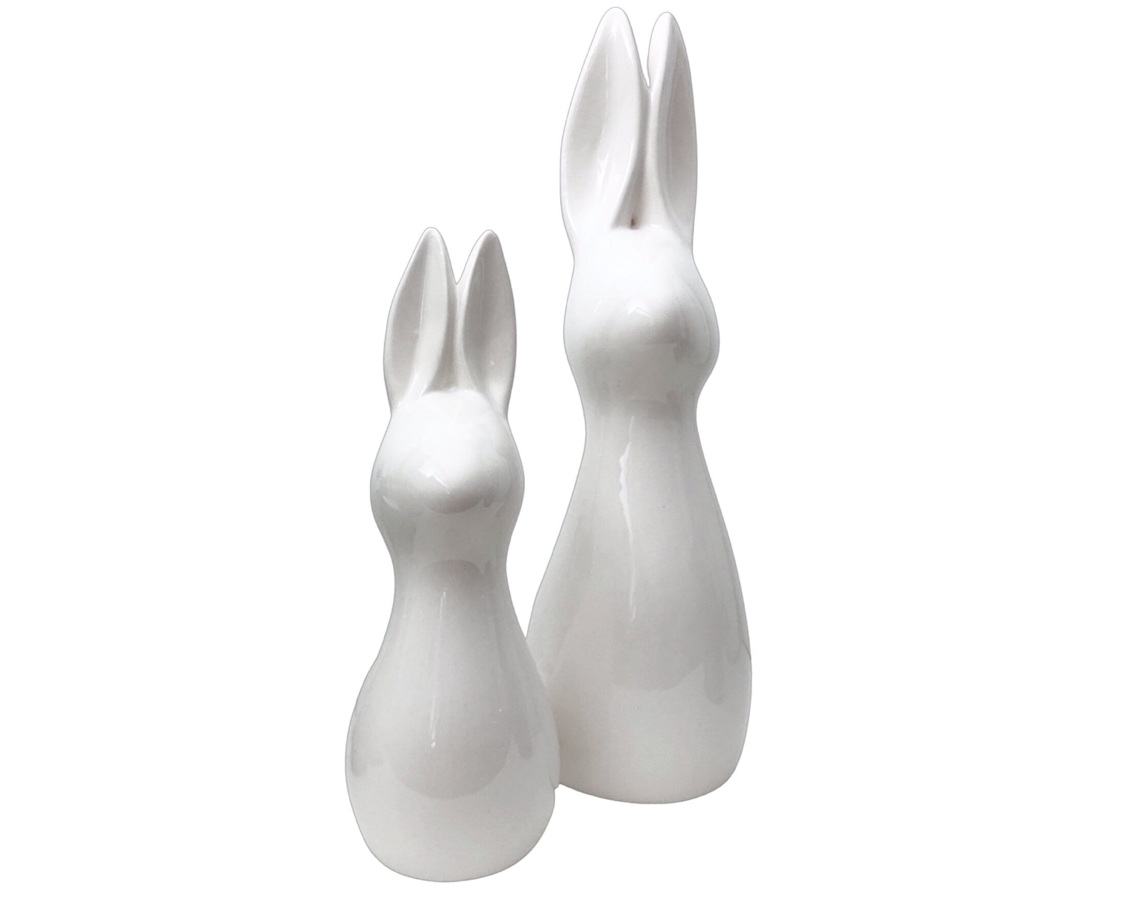 Minimalistisches Hasen-Duo aus weißer Keramik: eine puristische Osterdeko in glänzendem Weiß. Der kleinere der beiden schlanken Hasen kommt auf 20 cm Höhe, der andere ist 10 cm größer. Kaufe beide im günstigeren Set oder wähle sie einzeln aus.