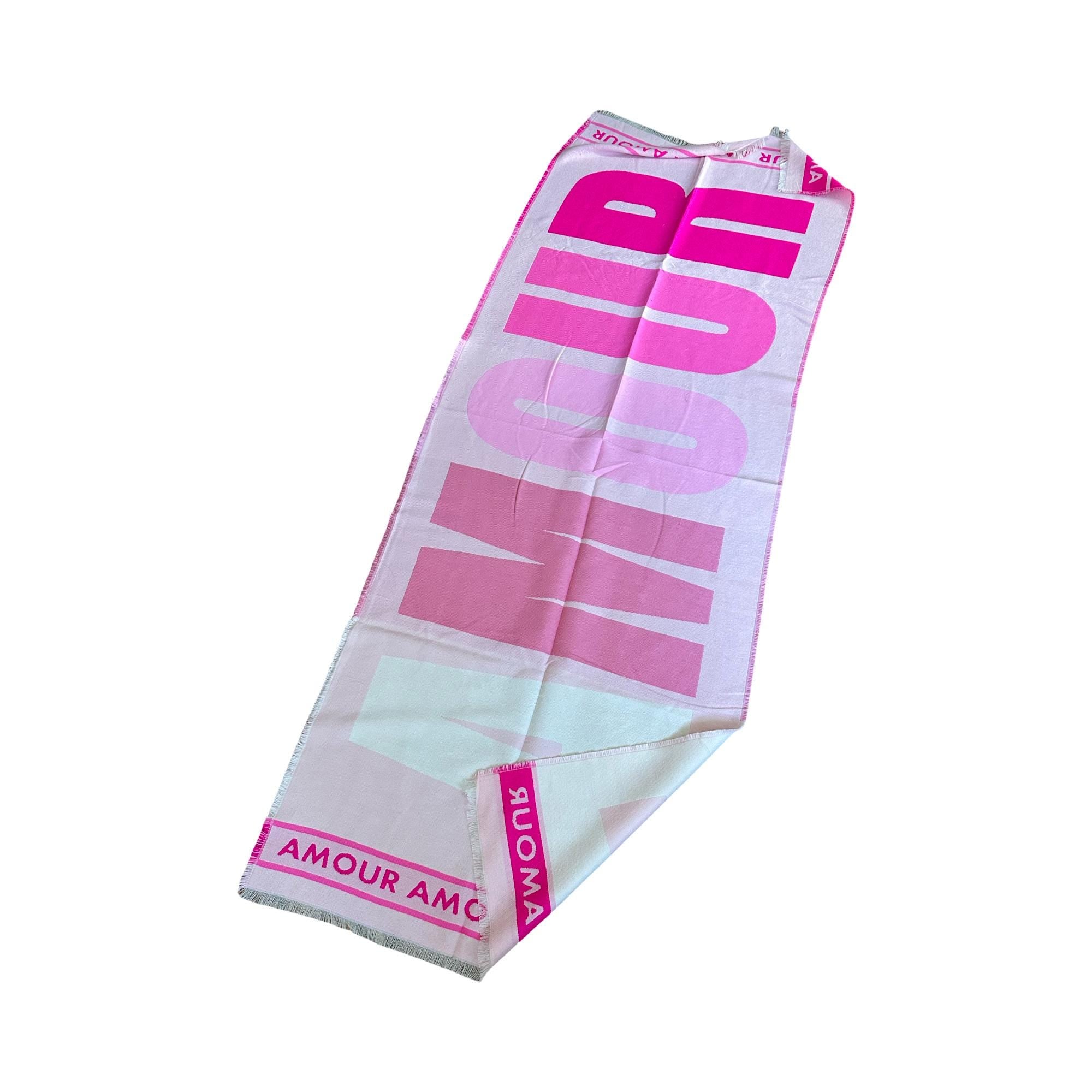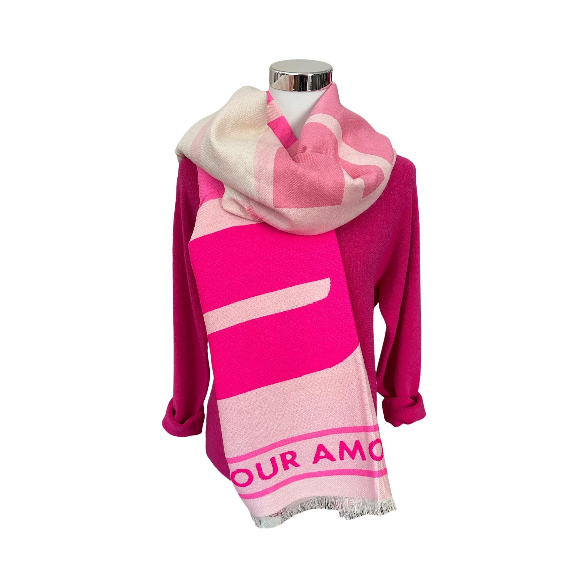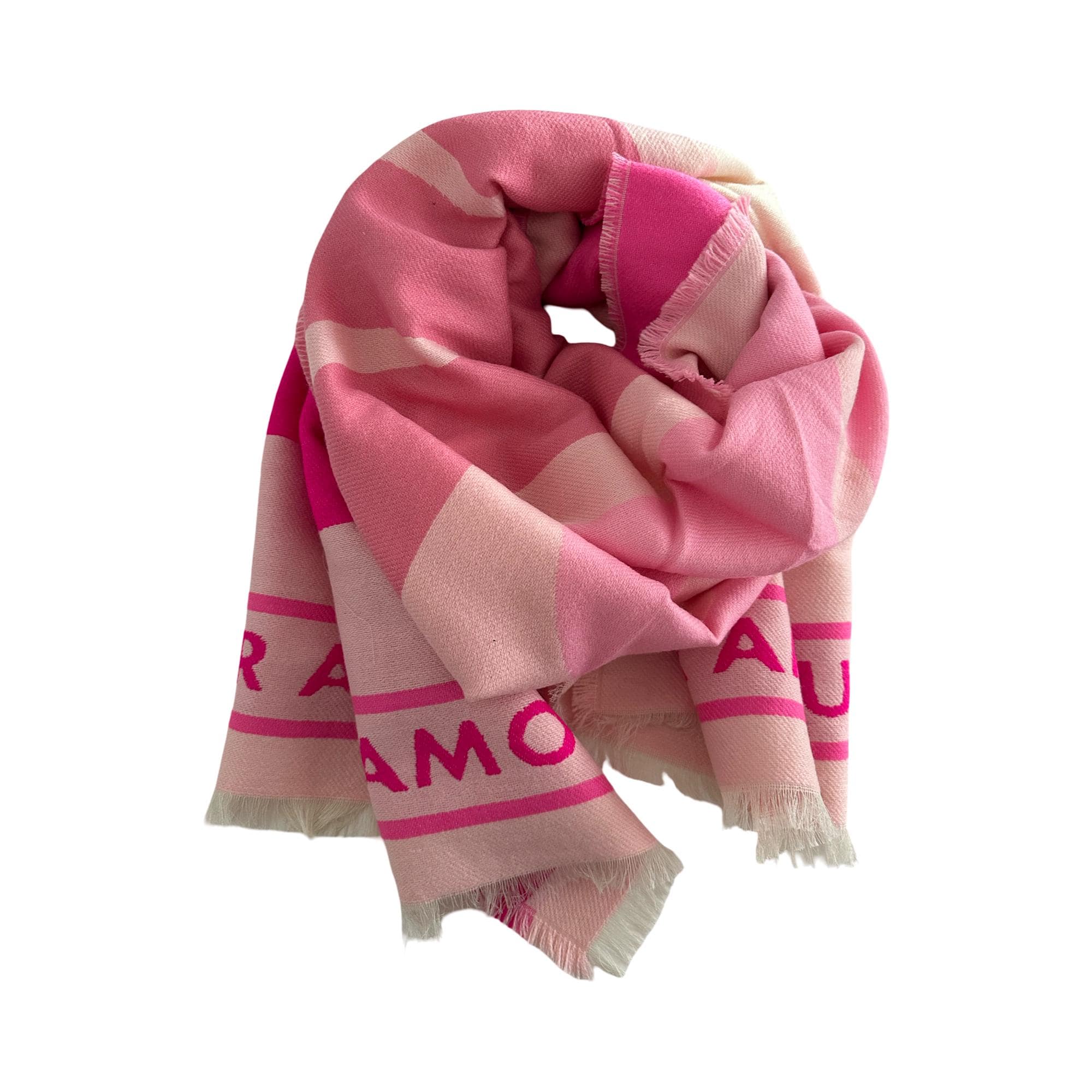 Kuschelweicher großer breiter Webschal aus Viskose - der Clou sind die rieseigen Buchstaben, die in farblicher Abstufung von hell nach dunkel das Wort "Amour" ergeben.