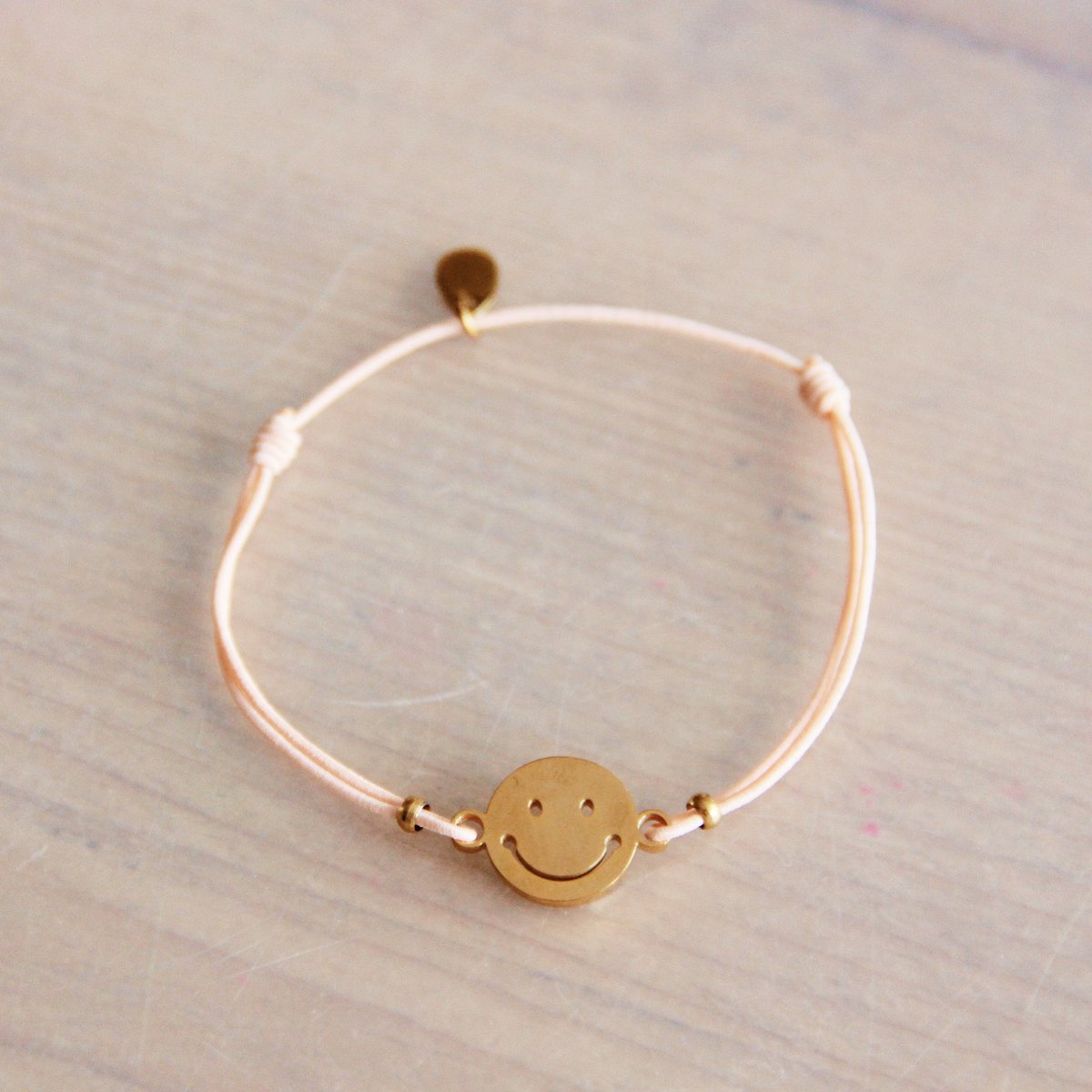 Das elastische Armband in der Farbe Pfirsich ist mit einem fröhlichen Smiley versehen. Das Armband ist mit Schiebeknöpfen verstellbar.