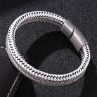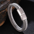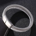 Dieses silberne geflochtene Armband zeichnet sich durch ein minimalistisches Design aus und kombiniert zwei schlanke Armbänder: eines aus Edelstahl und das andere aus weißem geflochtenem Leder. Das Armband hat eine Gesamtlänge von 21 cm und eine Breite von 6 cm. Es verfügt über einen stabilen Edelstahlhaken für sicheren Halt. Dieses moderne Armband eignet sich perfekt für das tägliche Outfit eines Gentlemans und verleiht jedem Look einen Hauch von Raffinesse. Werten Sie Ihren Stil mit diesem eleganten Accessoire auf, das sich ideal als Geschenk für ihn eignet.