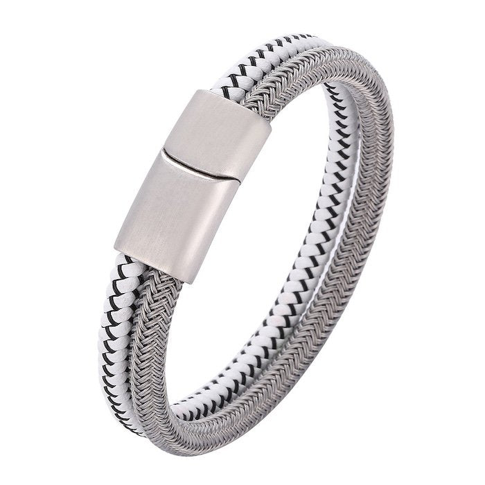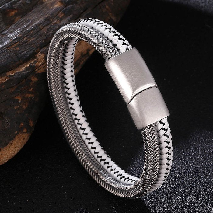 Silbernes geflochtenes Armband aus Stahl und weißem Leder