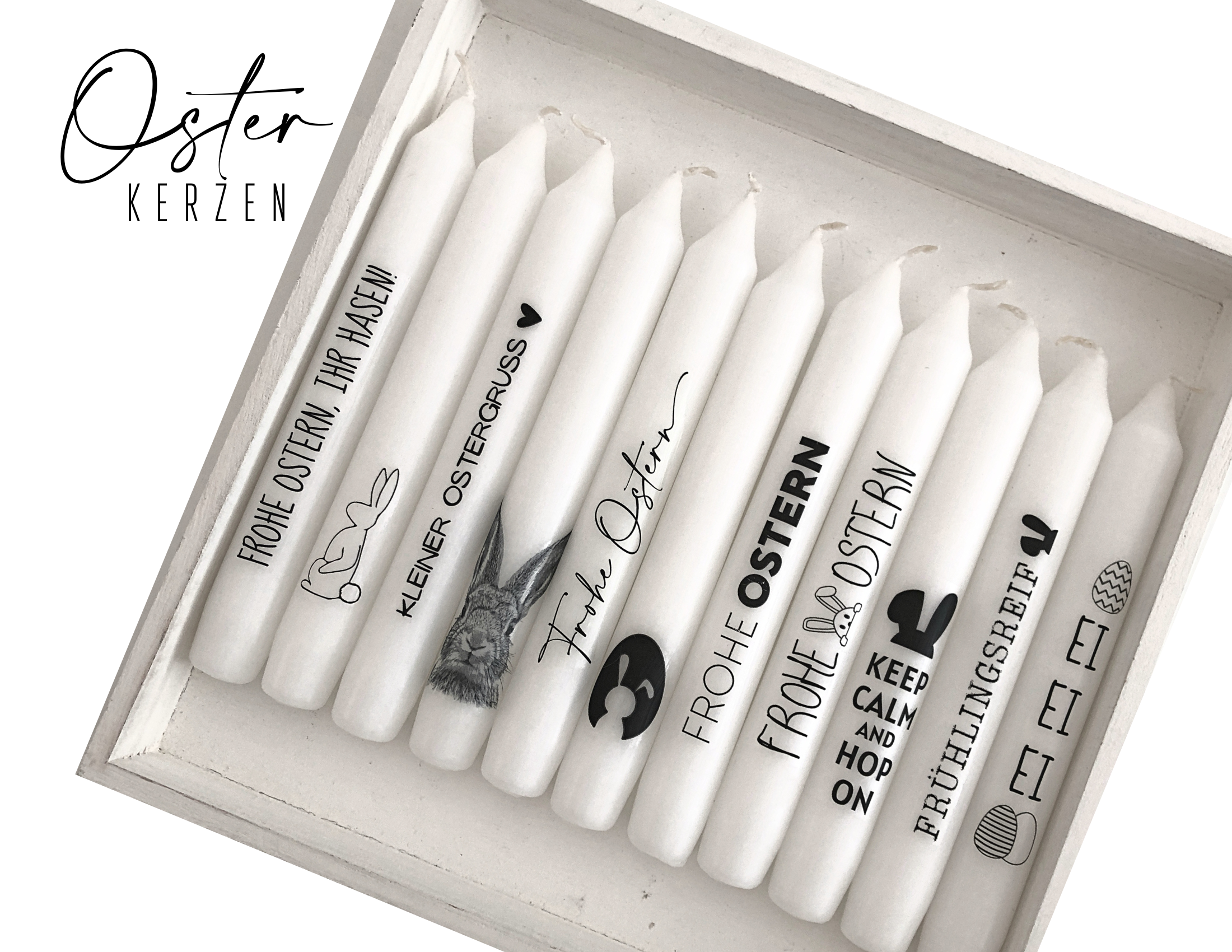 Easter candles with motifs and messages - for everyone who is still looking for a little something to give as a gift. Because these candles with a personal Easter message are perfect and come ready-wrapped as a gift. You can choose between 11 different candle messages with either sweet bunny motifs or nice Easter greetings and also whether you want a set of 2 or 3.